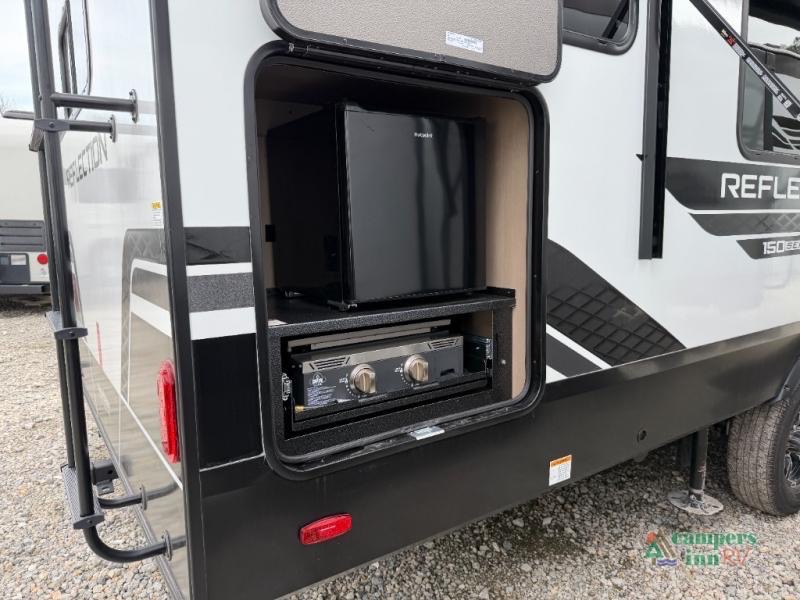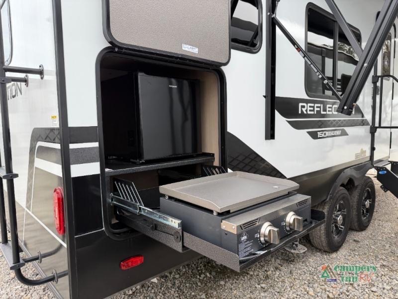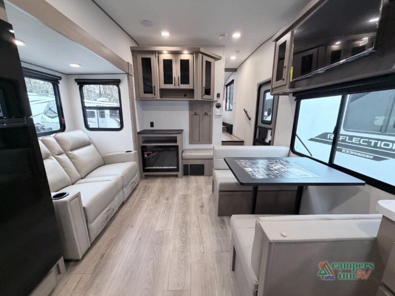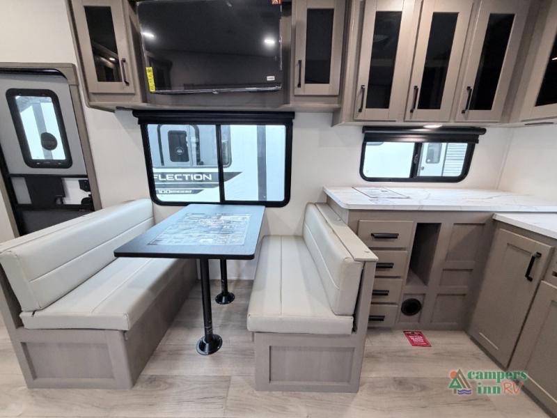 With any Reflection 150 Series fifth wheel by Grand Design, there is more available payload capacity and a broader range of half-ton trucks capable of towing this fifth wheel, and no slider hitch is needed thanks to the 90-degree turning radius which makes them short bed friendly and easier to tow. The mandatory Ultimate Power package provides a "One-Touch" automatic leveling system and a detachable power cord with LED light for easy setup, plus motion sensor pass-through lighting and entry lighting, and the Tire Linc TPMS will help you stay safe on the road. The interior offers residential cabinetry and premium Congoleum flooring, to the booth dinette and residential-style window treatment. Make your refined decision today!