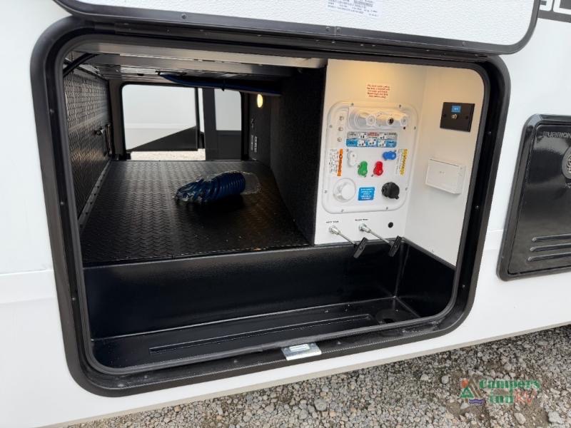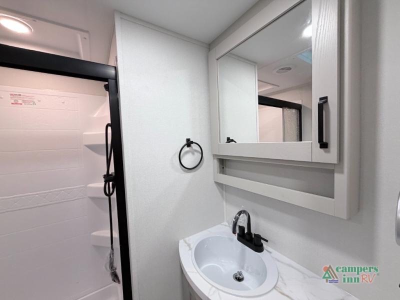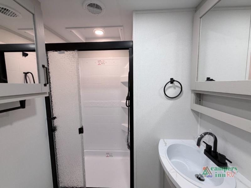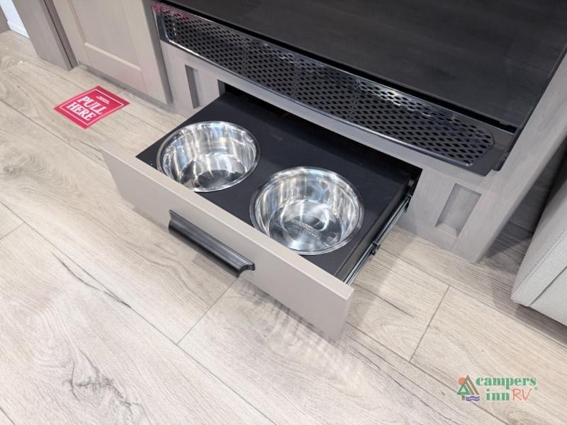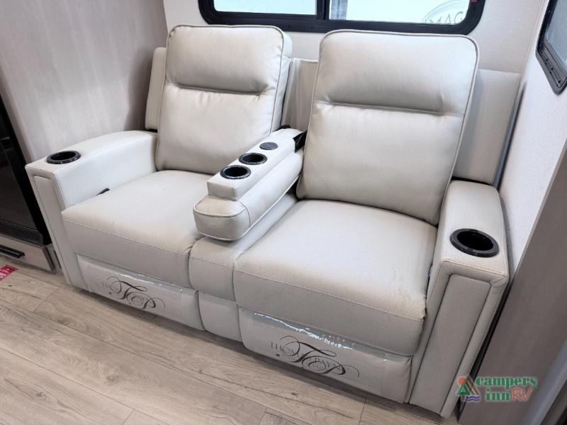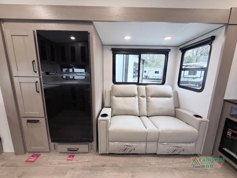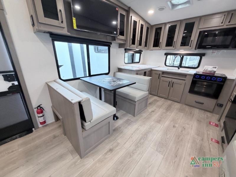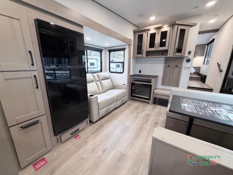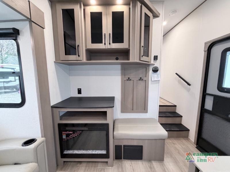 At the front of this fifth wheel, a private bedroom offers a walk-around 60" x 80" queen bed for restful comfort, complemented by dual wardrobes for convenient clothing storage. Down the hall, the full bathroom includes a 30" x 36" residential walk-in shower, a large, mirrored medicine cabinet, and linen storage for towels and toiletries. The middle living area features a cozy fireplace and booth dinette with a TV above perfect for dining while enjoying your favorite shows. Opposite, a slide-out holds the 62" theater seating for relaxing after a day of adventure, alongside a 10-cu. ft. refrigerator and pantry for all your groceries and dry goods. At the rear, an L-shaped kitchen provides generous counter space, a deep-seated stainless-steel sink, and a 30" microwave, allowing you to prepare meals comfortably without relying on campground facilities.