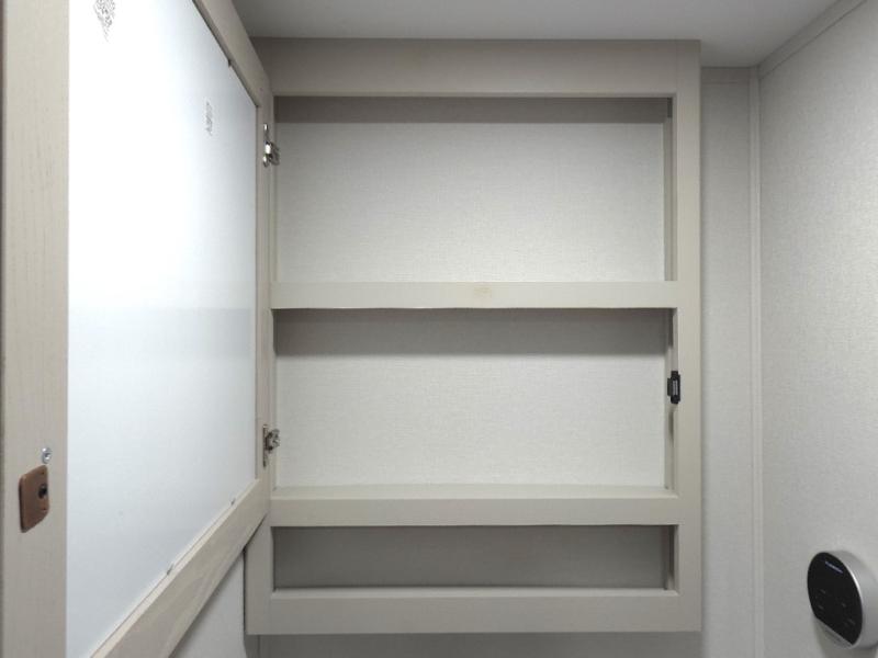 Full bathroom includes a walk in shower, linen storage, and mirrored medicine cabinet