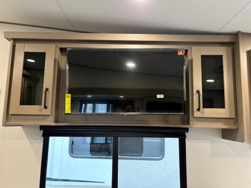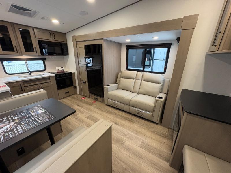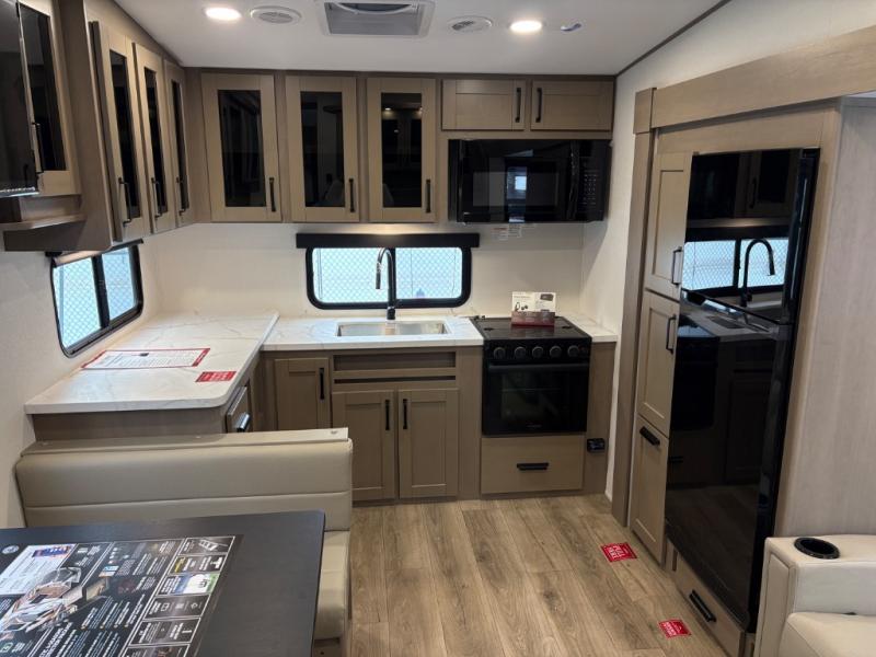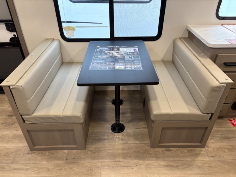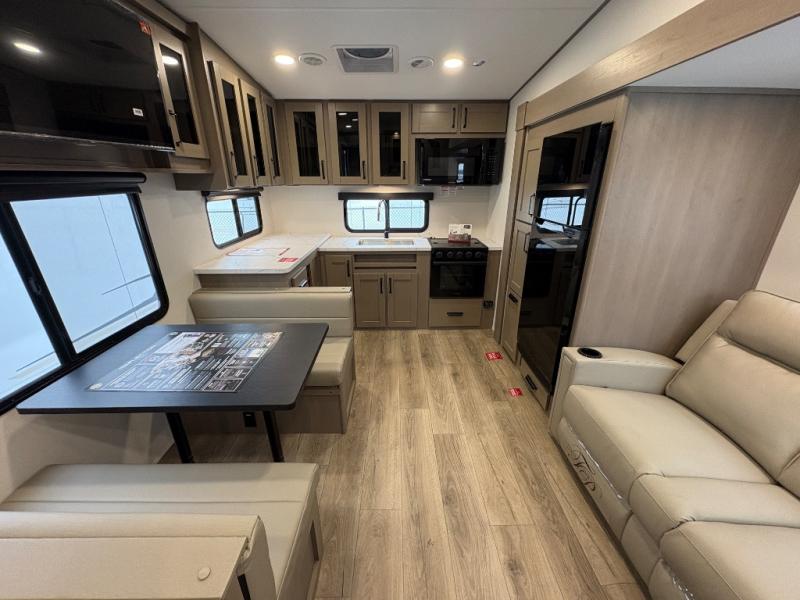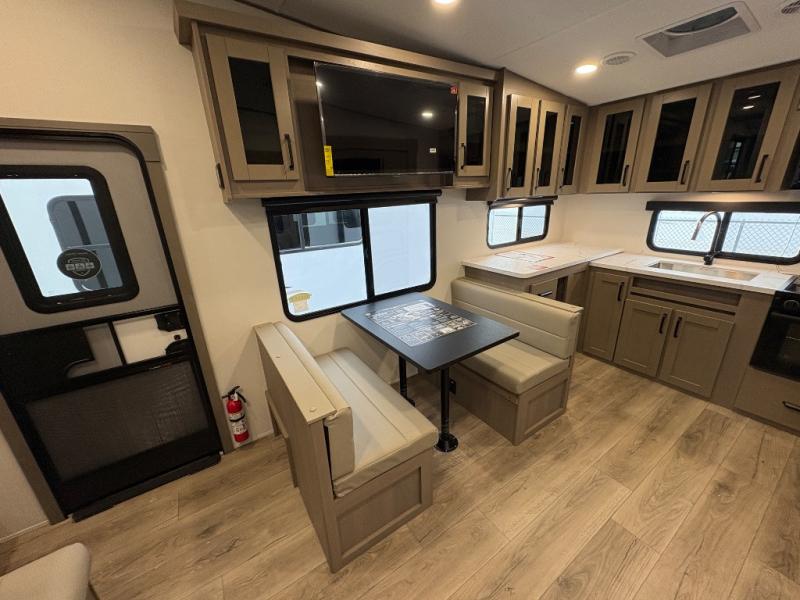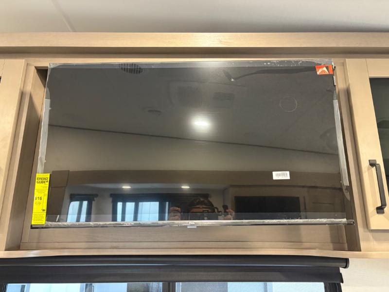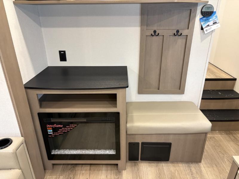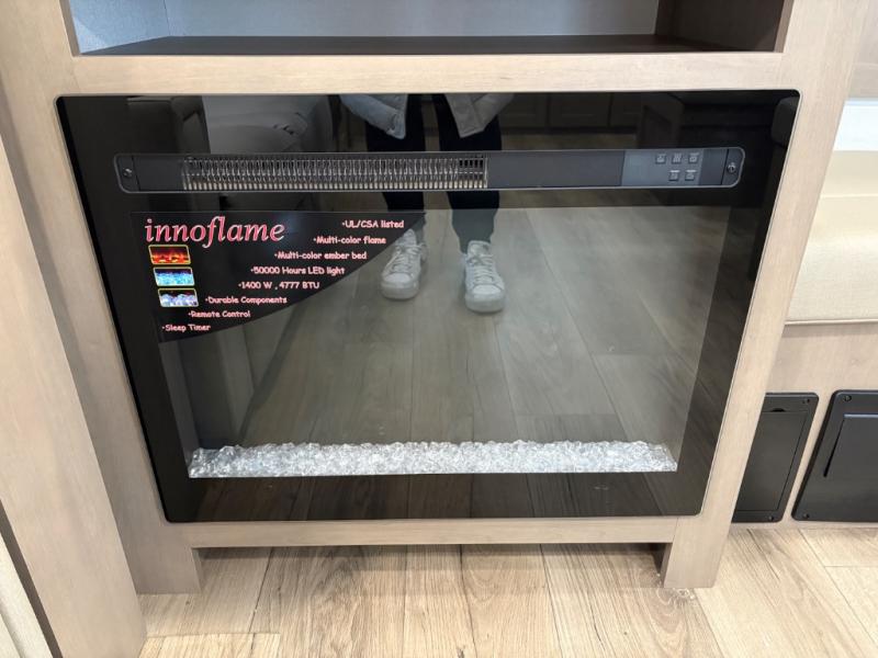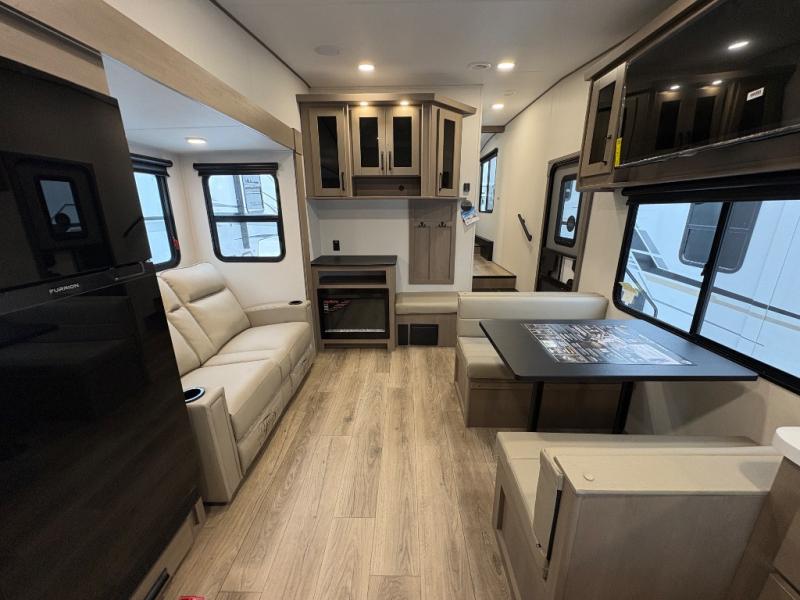 At the front of this fifth wheel, a private bedroom offers a walk-around 60" x 80" queen bed for restful comfort, complemented by dual wardrobes for convenient clothing storage. Down the hall, the full bathroom includes a 30" x 36" residential walk-in shower, a large, mirrored medicine cabinet, and linen storage for towels and toiletries. The middle living area features a cozy fireplace and booth dinette with a TV above perfect for dining while enjoying your favorite shows. Opposite, a slide-out holds the 62" theater seating for relaxing after a day of adventure, alongside a 10-cu. ft. refrigerator and pantry for all your groceries and dry goods. At the rear, an L-shaped kitchen provides generous counter space, a deep-seated stainless-steel sink, and a 30" microwave, allowing you to prepare meals comfortably without relying on campground facilities.