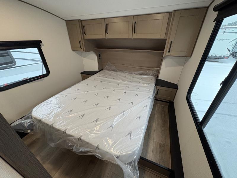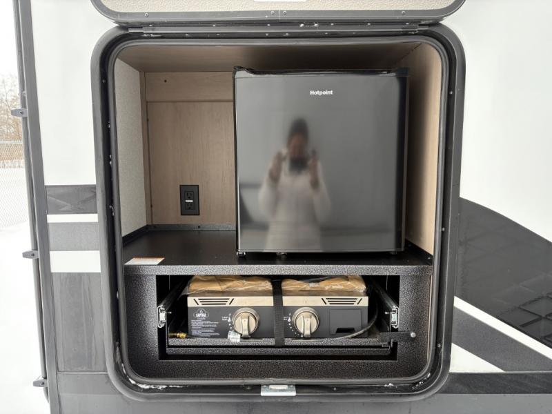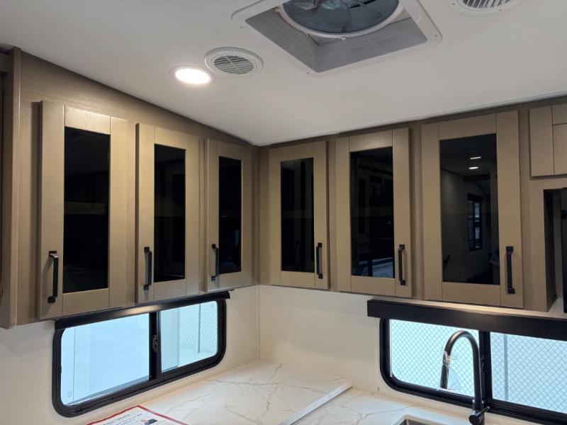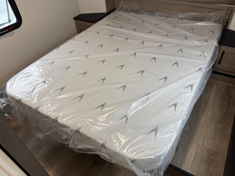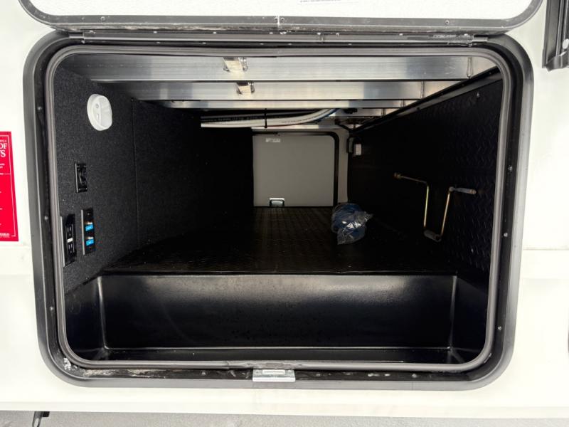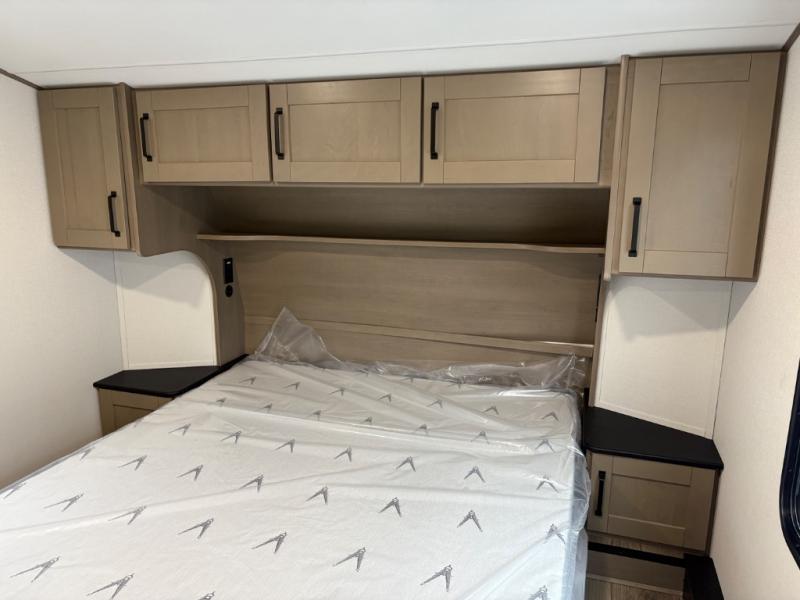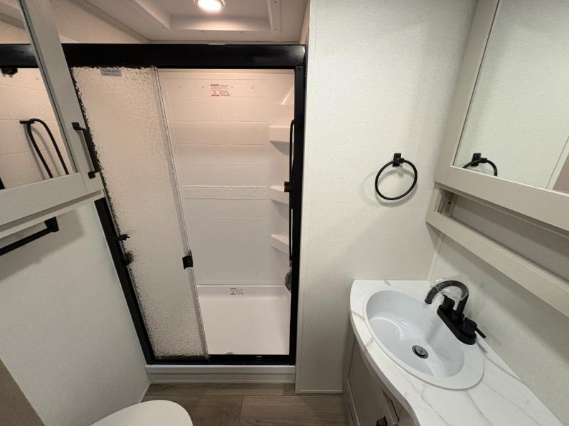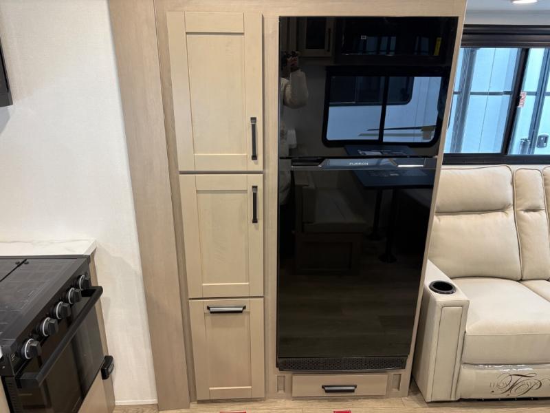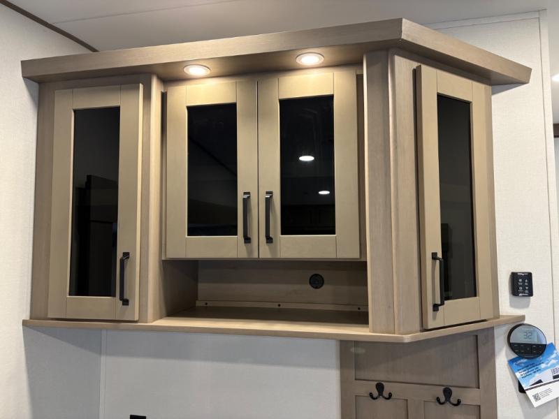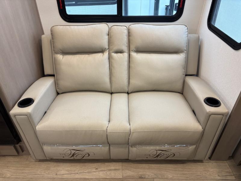 At the front of this fifth wheel, a private bedroom offers a walk-around 60" x 80" queen bed for restful comfort, complemented by dual wardrobes for convenient clothing storage. Down the hall, the full bathroom includes a 30" x 36" residential walk-in shower, a large, mirrored medicine cabinet, and linen storage for towels and toiletries. The middle living area features a cozy fireplace and booth dinette with a TV above perfect for dining while enjoying your favorite shows. Opposite, a slide-out holds the 62" theater seating for relaxing after a day of adventure, alongside a 10-cu. ft. refrigerator and pantry for all your groceries and dry goods. At the rear, an L-shaped kitchen provides generous counter space, a deep-seated stainless-steel sink, and a 30" microwave, allowing you to prepare meals comfortably without relying on campground facilities.