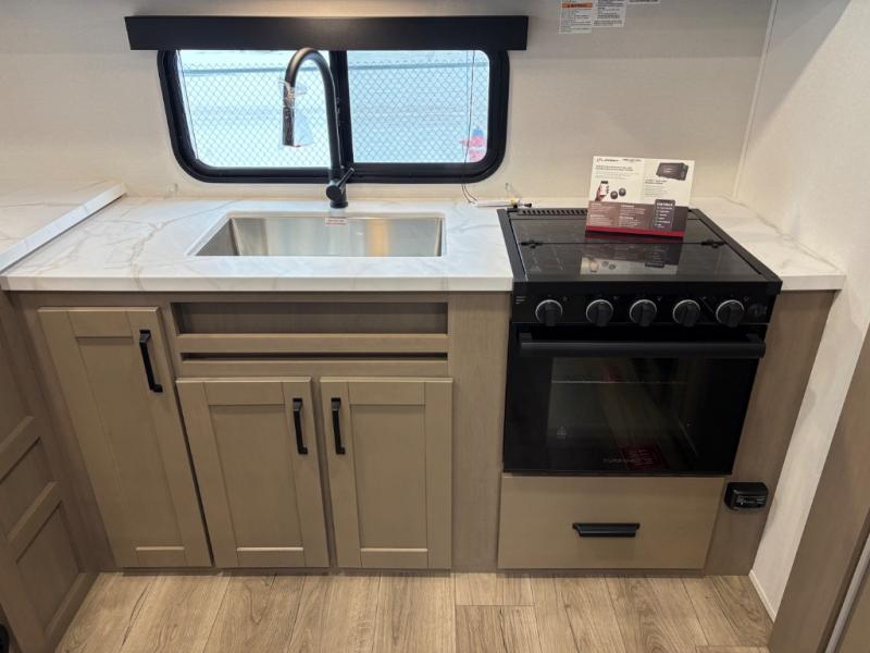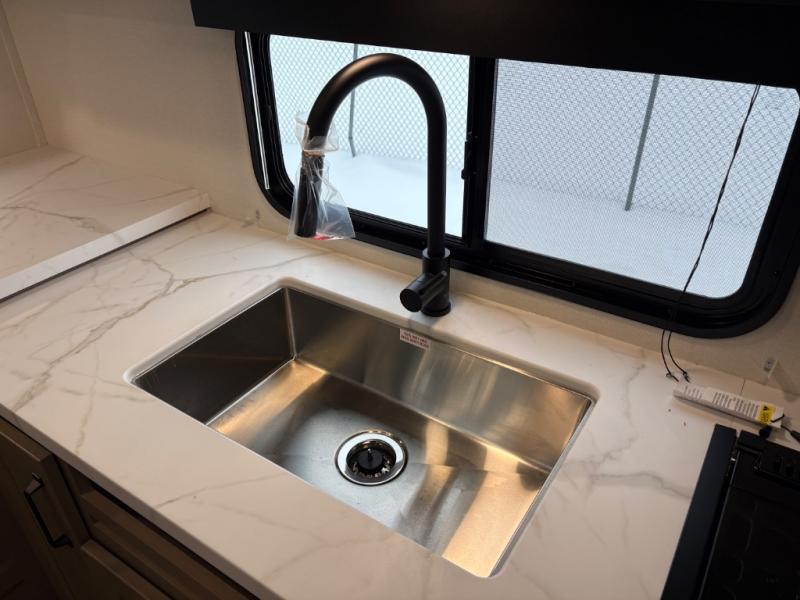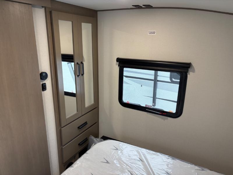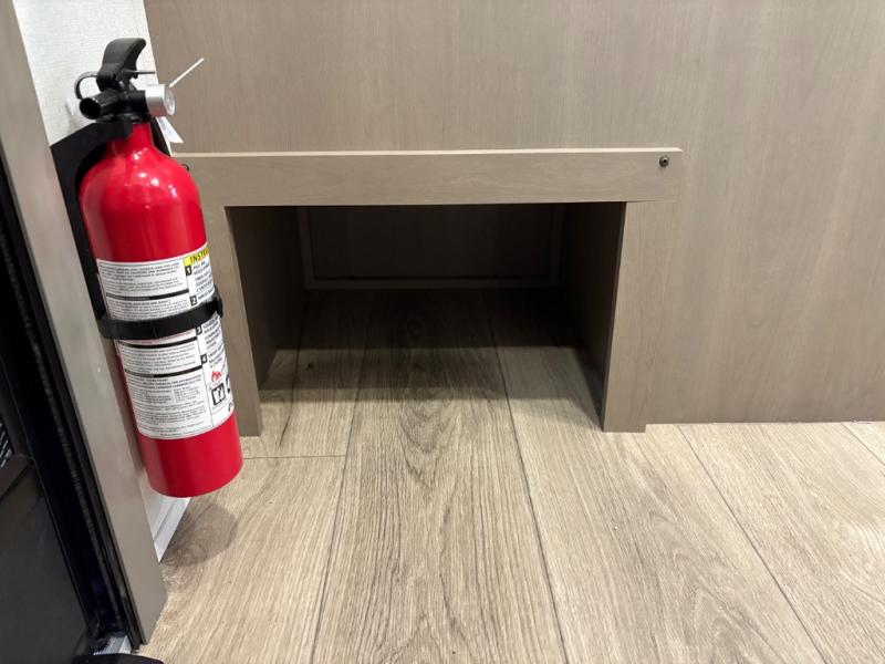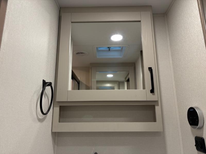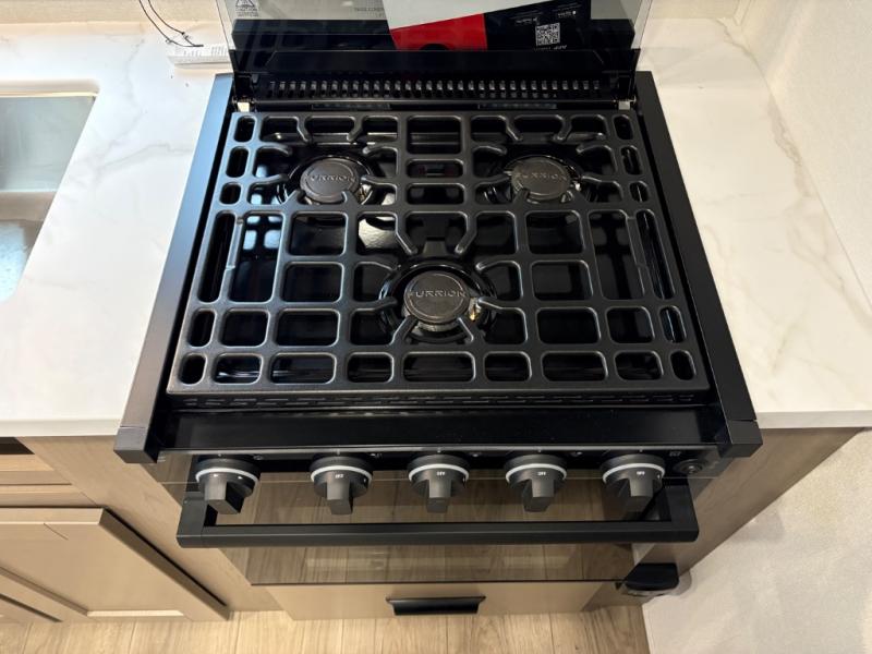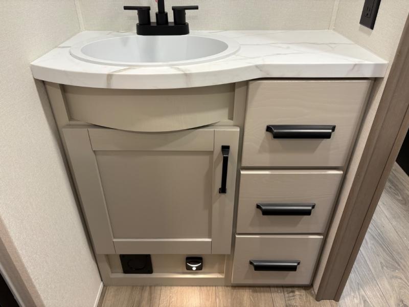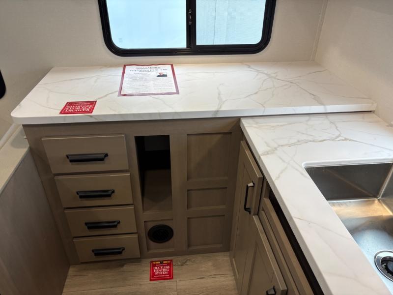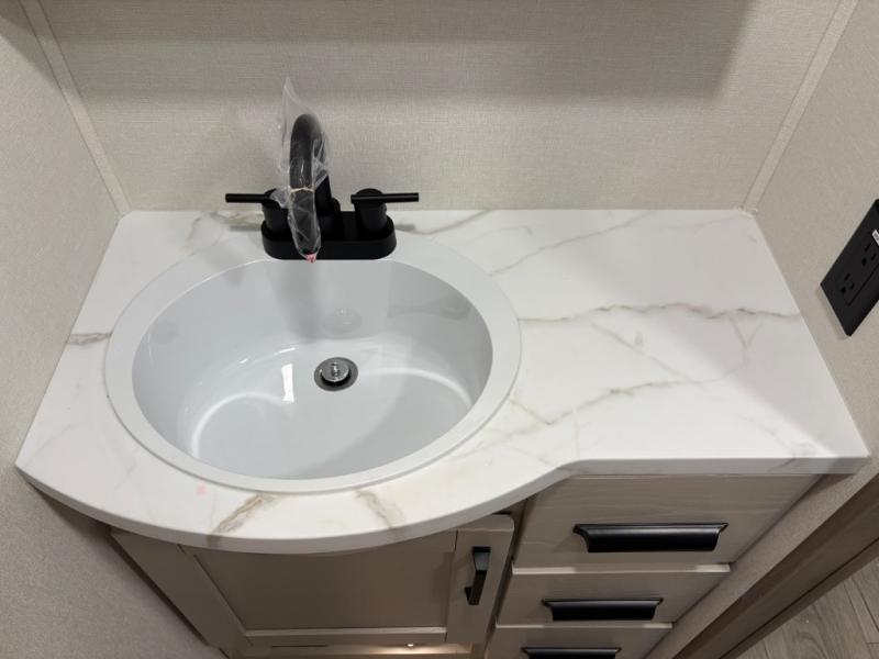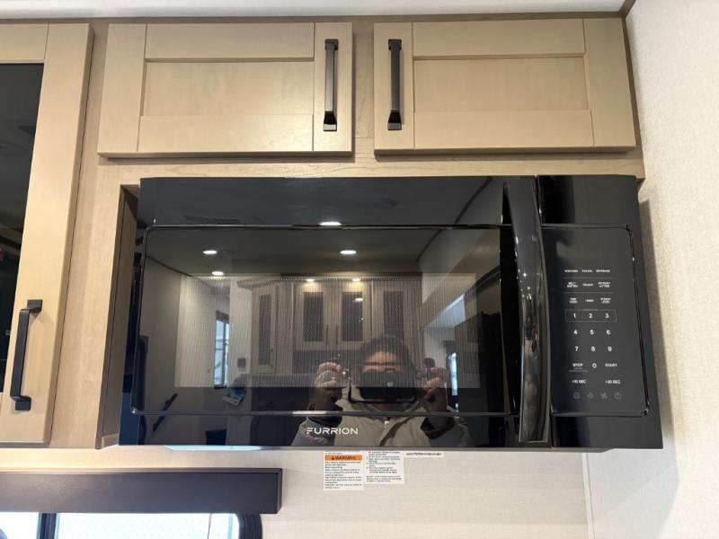 At the front of this fifth wheel, a private bedroom offers a walk-around 60" x 80" queen bed for restful comfort, complemented by dual wardrobes for convenient clothing storage. Down the hall, the full bathroom includes a 30" x 36" residential walk-in shower, a large, mirrored medicine cabinet, and linen storage for towels and toiletries. The middle living area features a cozy fireplace and booth dinette with a TV above perfect for dining while enjoying your favorite shows. Opposite, a slide-out holds the 62" theater seating for relaxing after a day of adventure, alongside a 10-cu. ft. refrigerator and pantry for all your groceries and dry goods. At the rear, an L-shaped kitchen provides generous counter space, a deep-seated stainless-steel sink, and a 30" microwave, allowing you to prepare meals comfortably without relying on campground facilities.