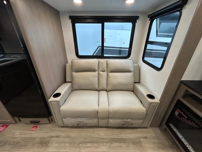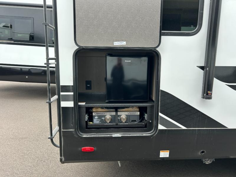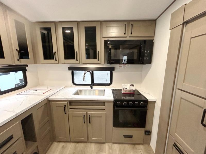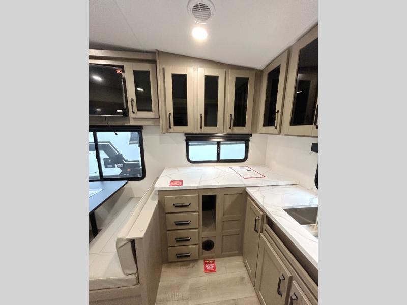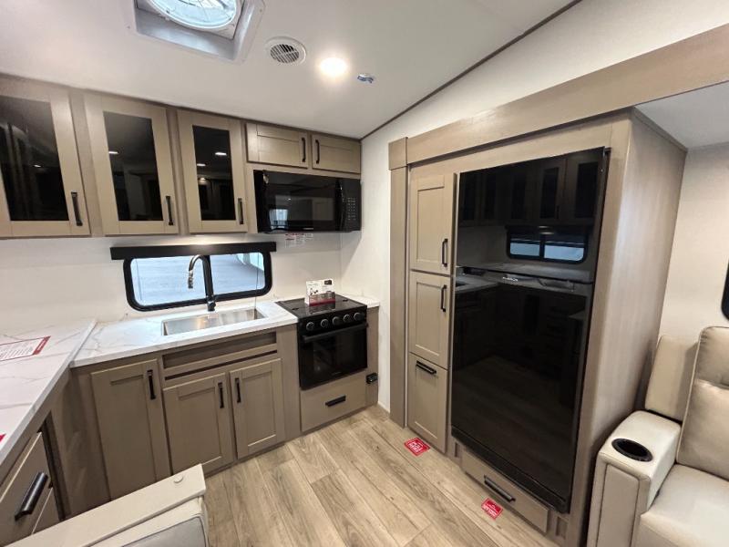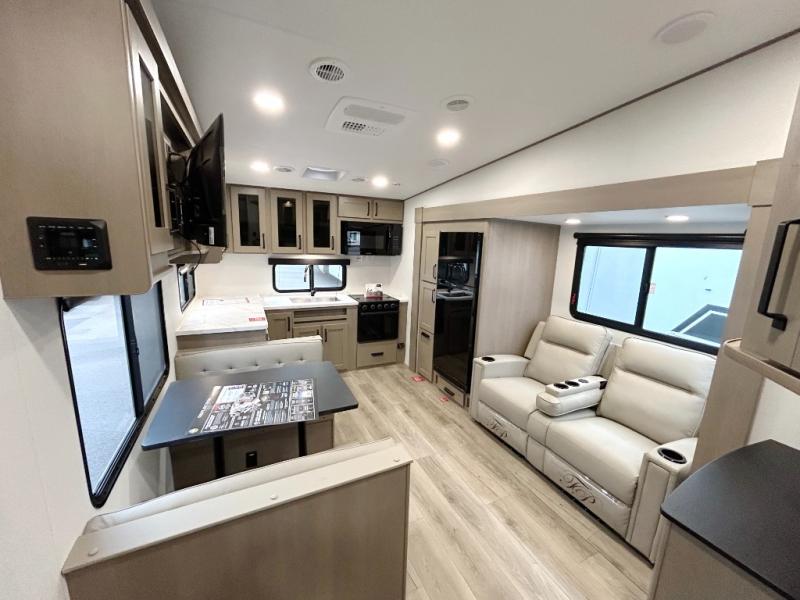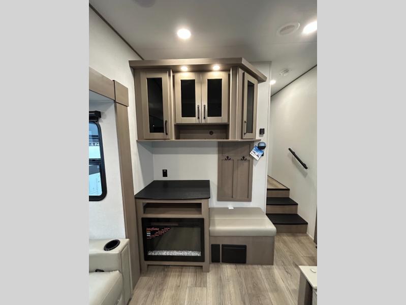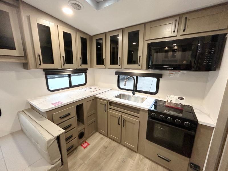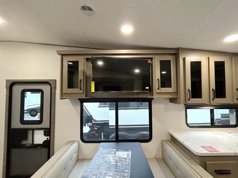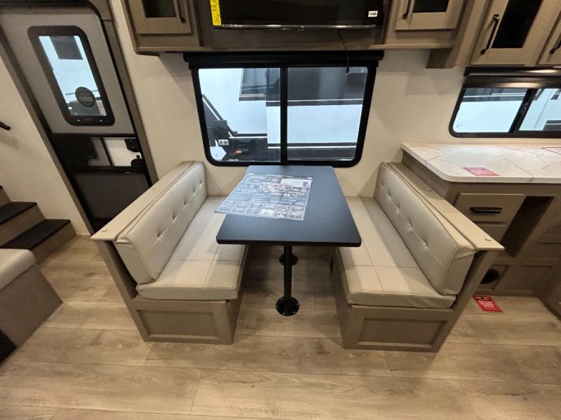 At the front of this fifth wheel, a private bedroom offers a walk-around 60" x 80" queen bed for restful comfort, complemented by dual wardrobes for convenient clothing storage. Down the hall, the full bathroom includes a 30" x 36" residential walk-in shower, a large, mirrored medicine cabinet, and linen storage for towels and toiletries. The middle living area features a cozy fireplace and booth dinette with a TV above perfect for dining while enjoying your favorite shows. Opposite, a slide-out holds the 62" theater seating for relaxing after a day of adventure, alongside a 10-cu. ft. refrigerator and pantry for all your groceries and dry goods. At the rear, an L-shaped kitchen provides generous counter space, a deep-seated stainless-steel sink, and a 30" microwave, allowing you to prepare meals comfortably without relying on campground facilities.