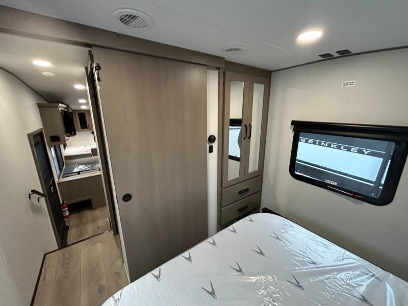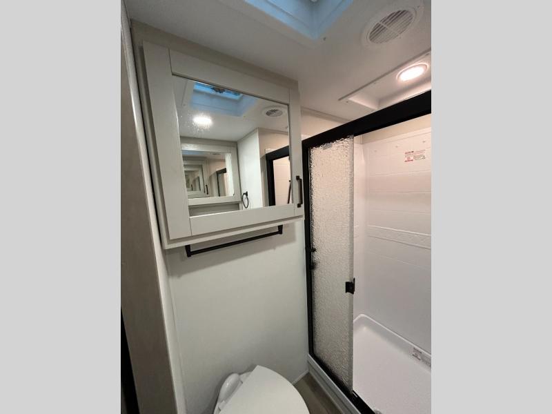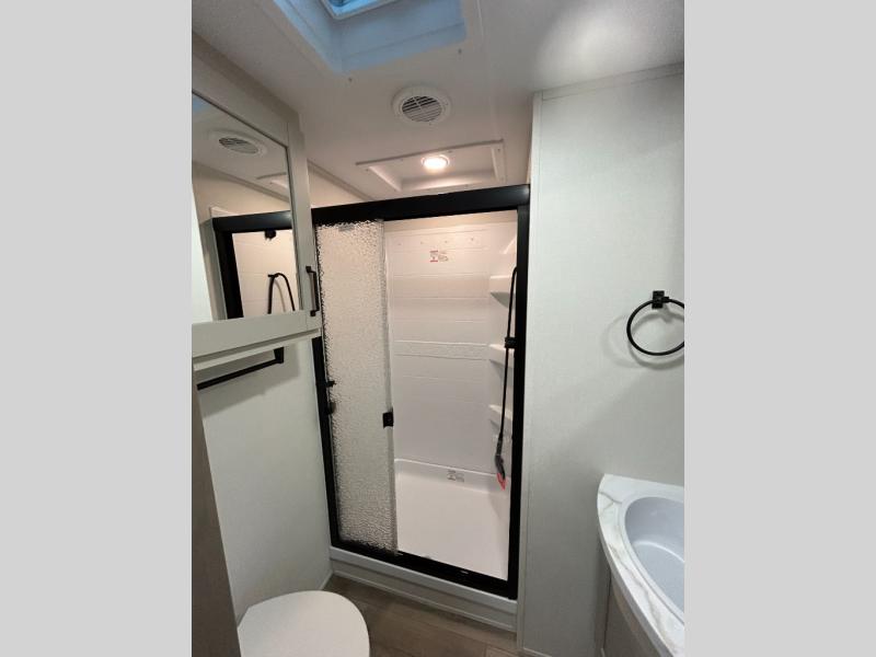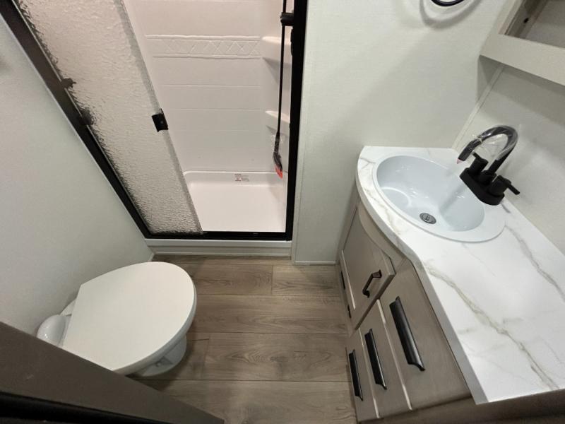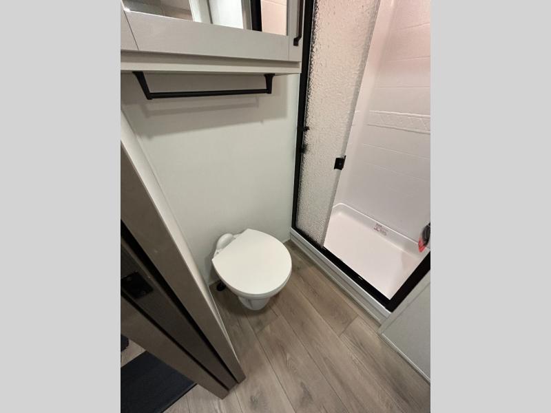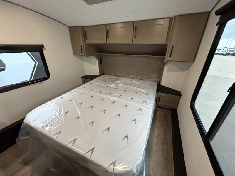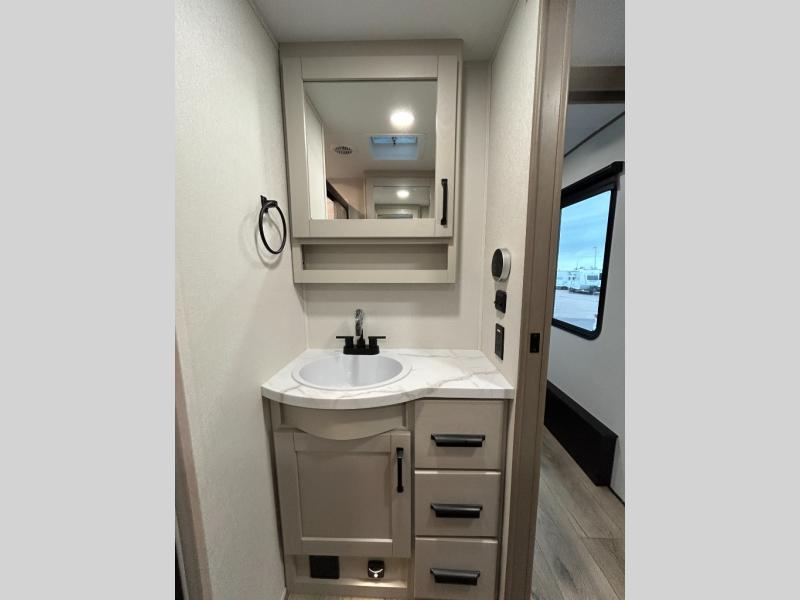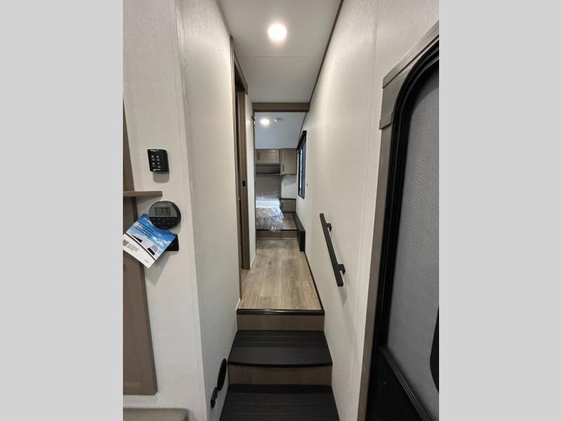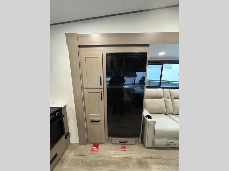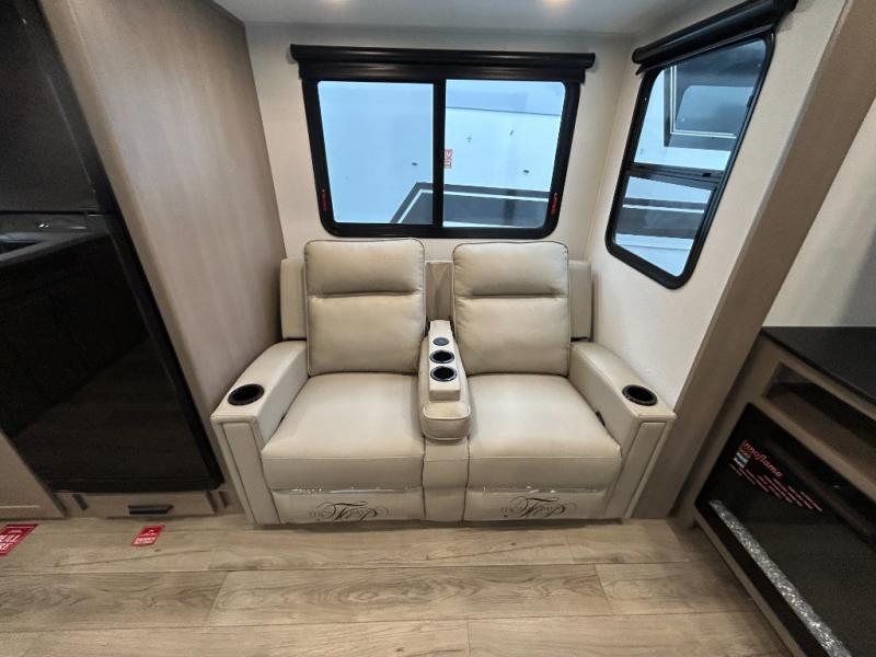 At the front of this fifth wheel, a private bedroom offers a walk-around 60" x 80" queen bed for restful comfort, complemented by dual wardrobes for convenient clothing storage. Down the hall, the full bathroom includes a 30" x 36" residential walk-in shower, a large, mirrored medicine cabinet, and linen storage for towels and toiletries. The middle living area features a cozy fireplace and booth dinette with a TV above perfect for dining while enjoying your favorite shows. Opposite, a slide-out holds the 62" theater seating for relaxing after a day of adventure, alongside a 10-cu. ft. refrigerator and pantry for all your groceries and dry goods. At the rear, an L-shaped kitchen provides generous counter space, a deep-seated stainless-steel sink, and a 30" microwave, allowing you to prepare meals comfortably without relying on campground facilities.