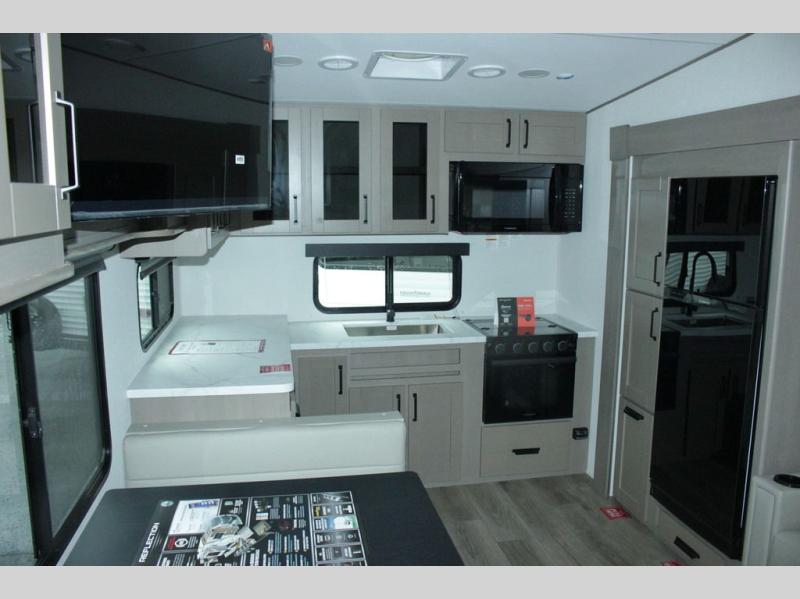 With any Reflection 150 Series fifth wheel by Grand Design, there is more available payload capacity and a broader range of half-ton trucks capable of towing this fifth wheel, and no slider hitch is needed thanks to the 90-degree turning radius which makes them short bed friendly and easier to tow. The mandatory Ultimate Power package provides a "One-Touch" automatic leveling system and a detachable power cord with LED light for easy setup, plus motion sensor pass-through lighting and entry lighting, and the Tire Linc TPMS will help you stay safe on the road. The interior offers residential cabinetry and premium Congoleum flooring, to the booth dinette and residential-style window treatment. Make your refined decision today!