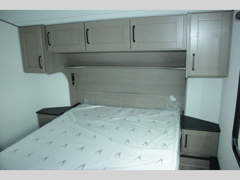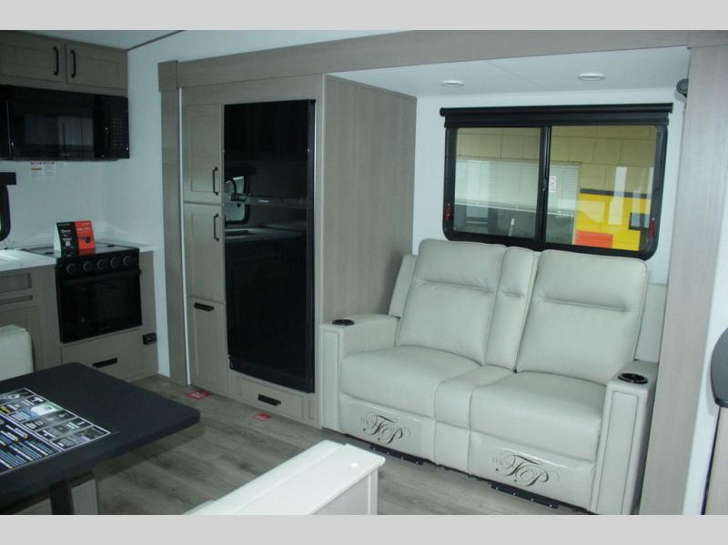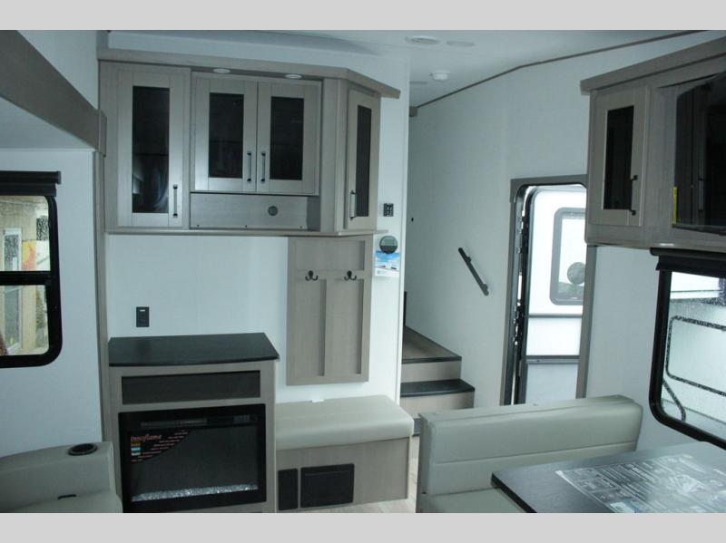 At the front of this fifth wheel, a private bedroom offers a walk-around 60" x 80" queen bed for restful comfort, complemented by dual wardrobes for convenient clothing storage. Down the hall, the full bathroom includes a 30" x 36" residential walk-in shower, a large, mirrored medicine cabinet, and linen storage for towels and toiletries. The middle living area features a cozy fireplace and booth dinette with a TV above perfect for dining while enjoying your favorite shows. Opposite, a slide-out holds the 62" theater seating for relaxing after a day of adventure, alongside a 10-cu. ft. refrigerator and pantry for all your groceries and dry goods. At the rear, an L-shaped kitchen provides generous counter space, a deep-seated stainless-steel sink, and a 30" microwave, allowing you to prepare meals comfortably without relying on campground facilities.