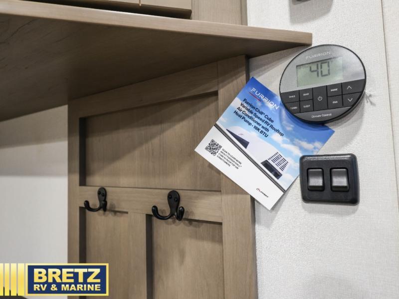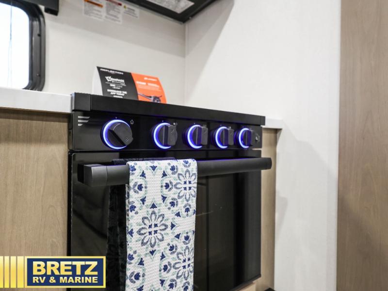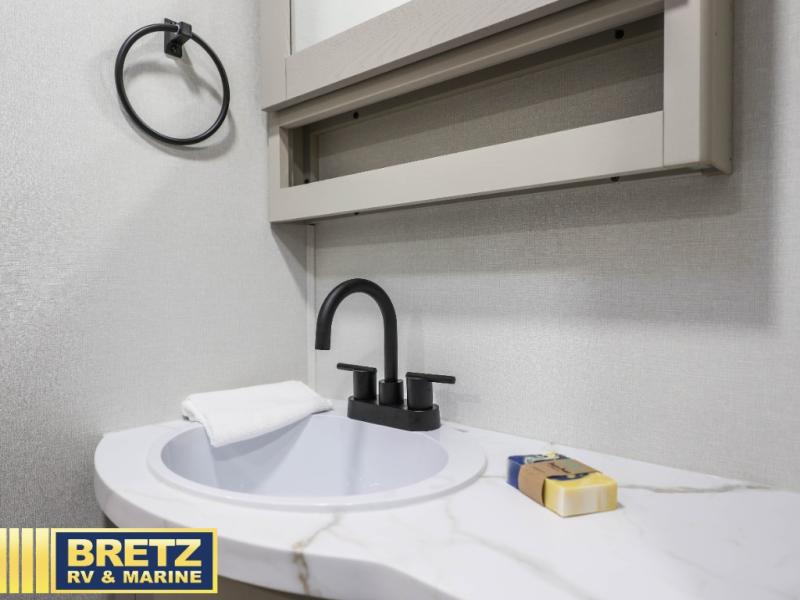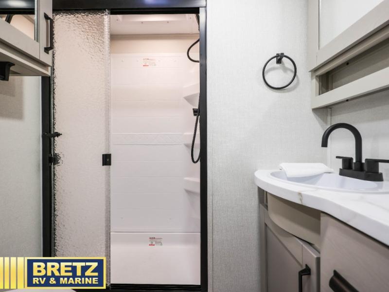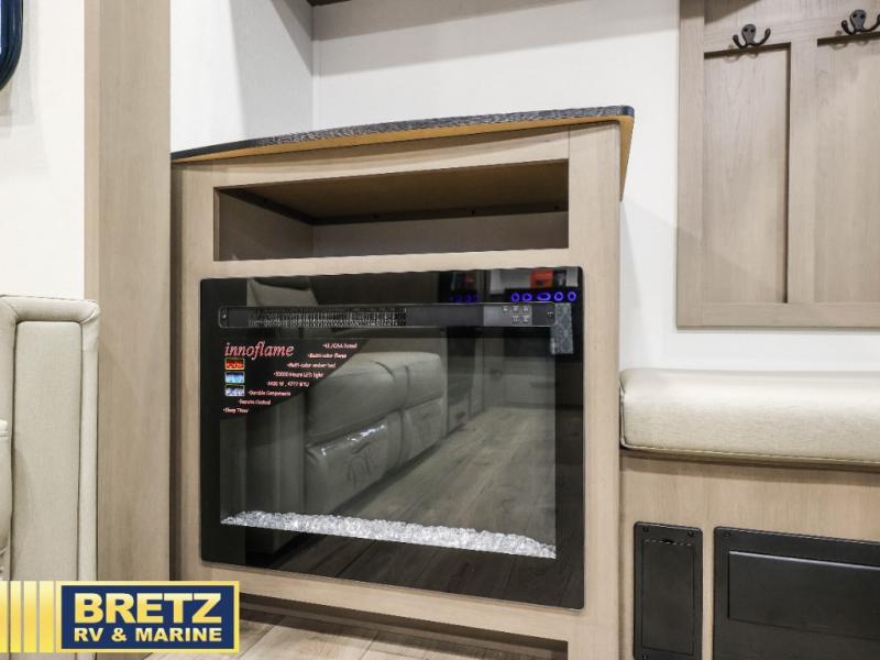 At the front of this fifth wheel, a private bedroom offers a walk-around 60" x 80" queen bed for restful comfort, complemented by dual wardrobes for convenient clothing storage. Down the hall, the full bathroom includes a 30" x 36" residential walk-in shower, a large, mirrored medicine cabinet, and linen storage for towels and toiletries. The middle living area features a cozy fireplace and booth dinette with a TV above perfect for dining while enjoying your favorite shows. Opposite, a slide-out holds the 62" theater seating for relaxing after a day of adventure, alongside a 10-cu. ft. refrigerator and pantry for all your groceries and dry goods. At the rear, an L-shaped kitchen provides generous counter space, a deep-seated stainless-steel sink, and a 30" microwave, allowing you to prepare meals comfortably without relying on campground facilities.