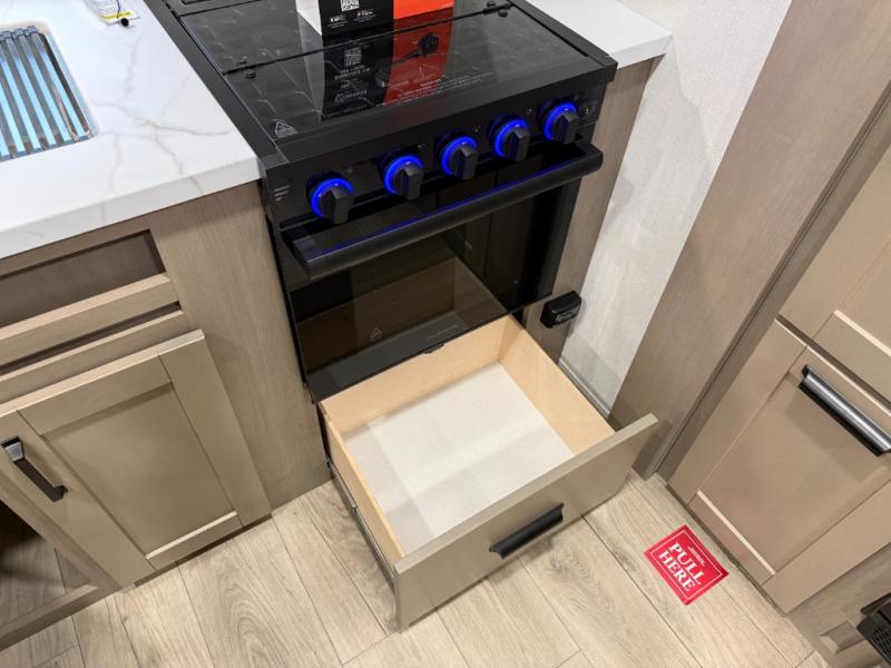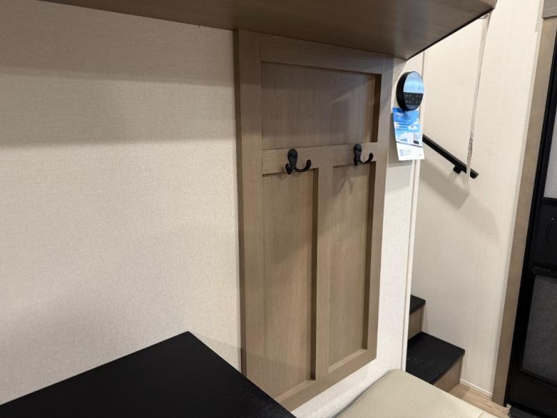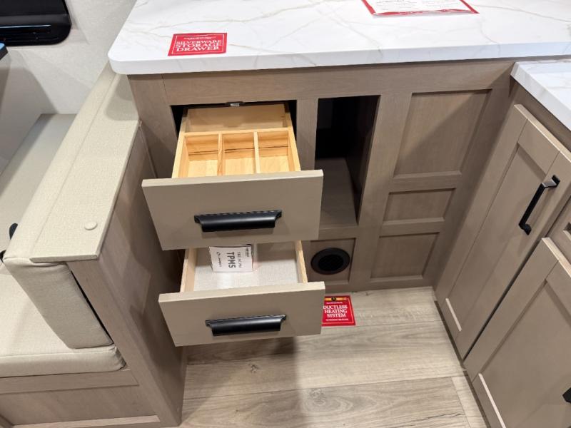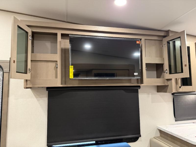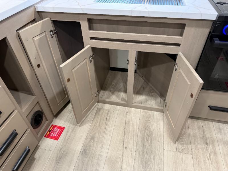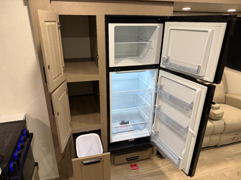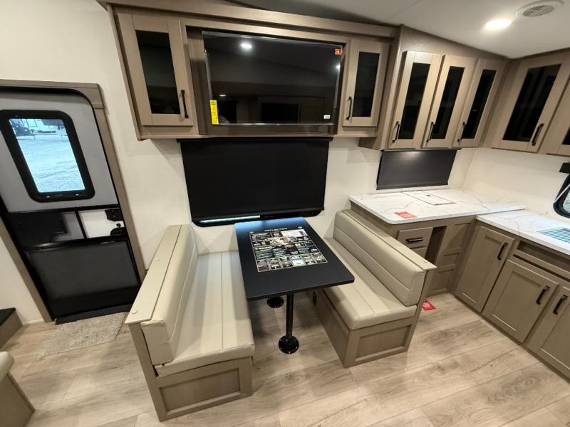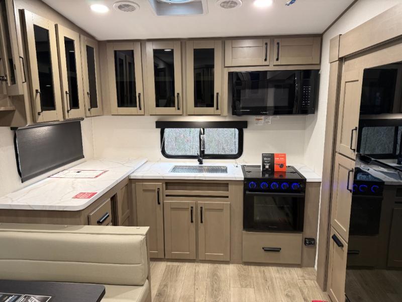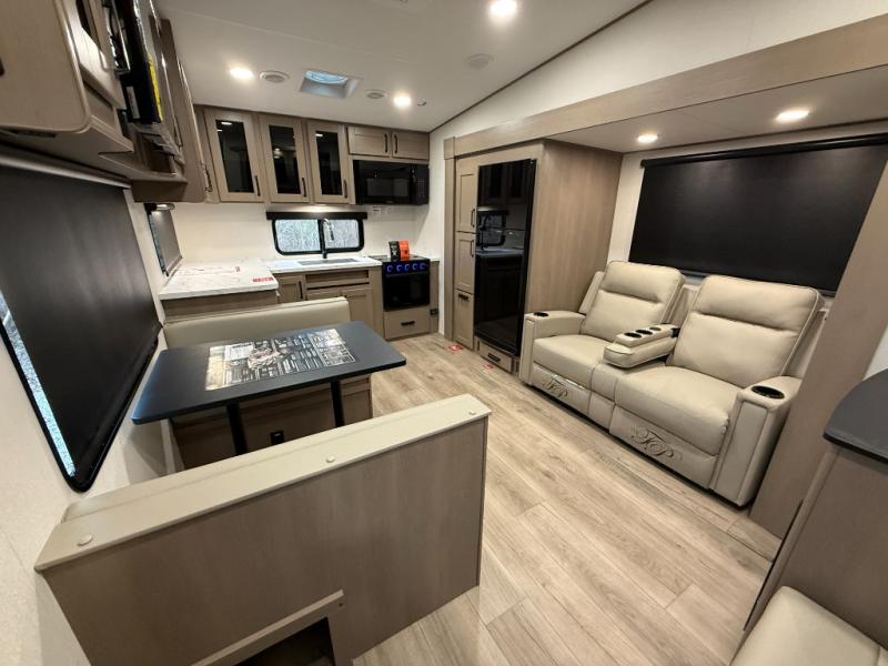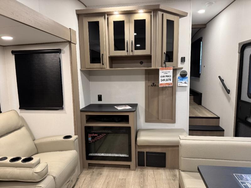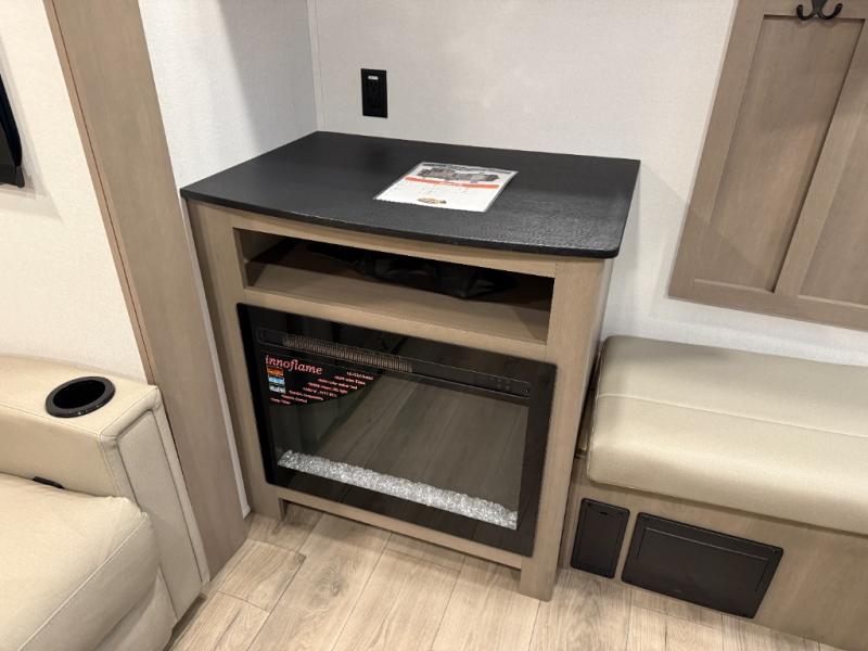 At the front of this fifth wheel, a private bedroom offers a walk-around 60" x 80" queen bed for restful comfort, complemented by dual wardrobes for convenient clothing storage. Down the hall, the full bathroom includes a 30" x 36" residential walk-in shower, a large, mirrored medicine cabinet, and linen storage for towels and toiletries. The middle living area features a cozy fireplace and booth dinette with a TV above perfect for dining while enjoying your favorite shows. Opposite, a slide-out holds the 62" theater seating for relaxing after a day of adventure, alongside a 10-cu. ft. refrigerator and pantry for all your groceries and dry goods. At the rear, an L-shaped kitchen provides generous counter space, a deep-seated stainless-steel sink, and a 30" microwave, allowing you to prepare meals comfortably without relying on campground facilities.