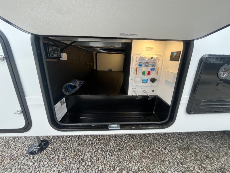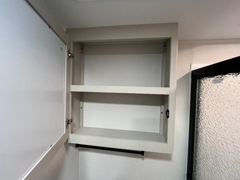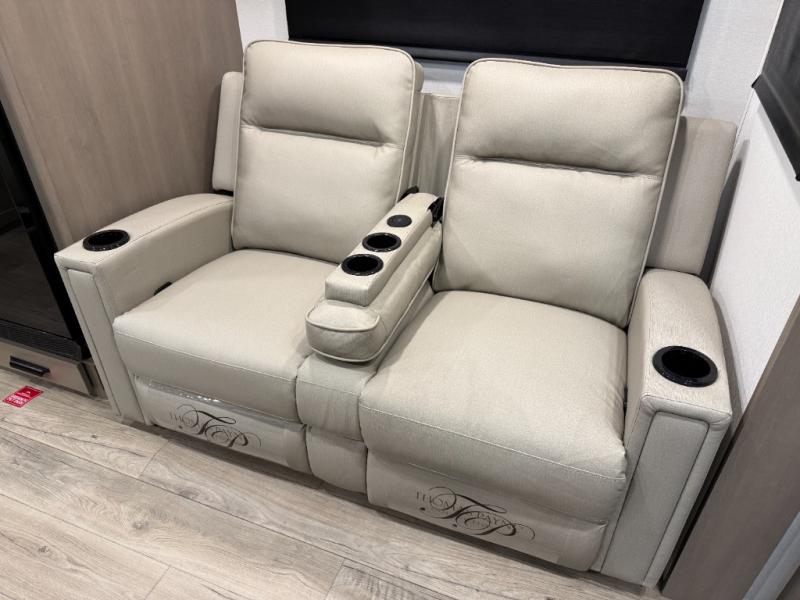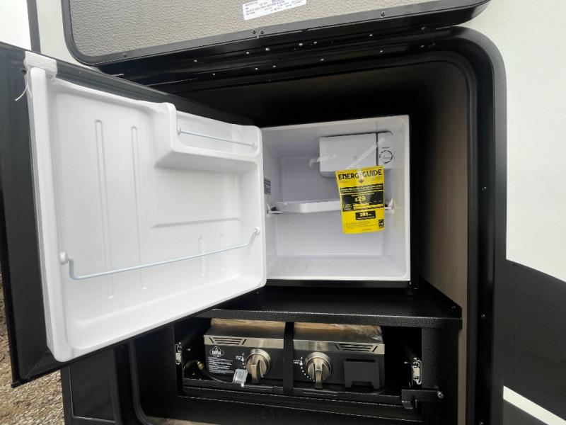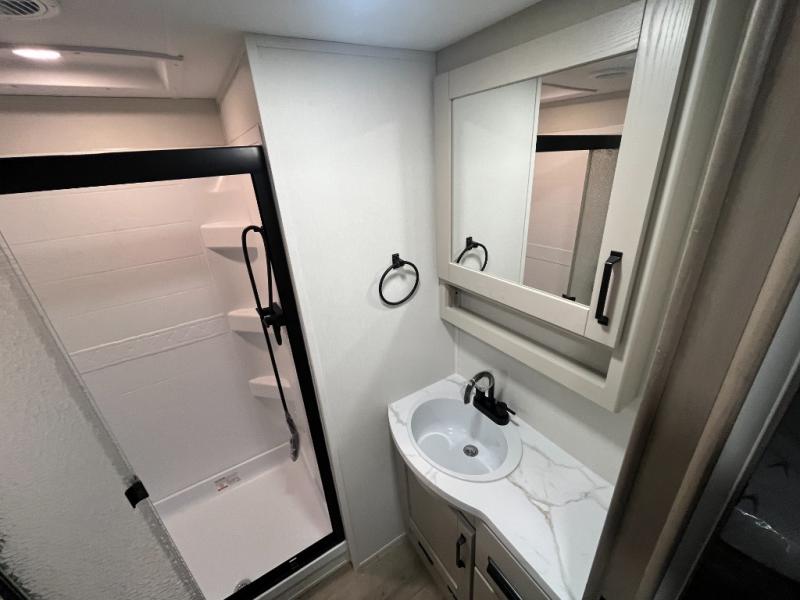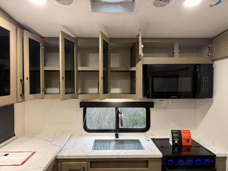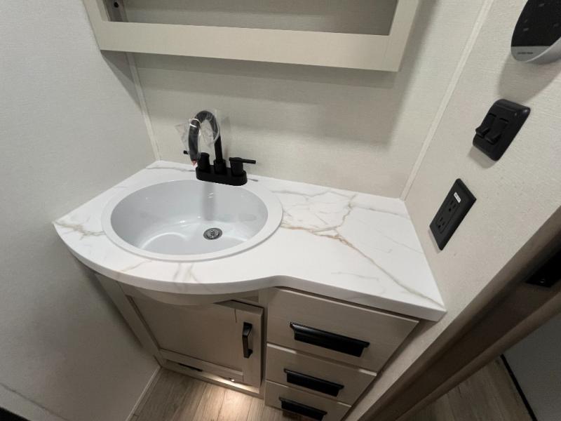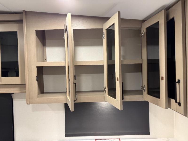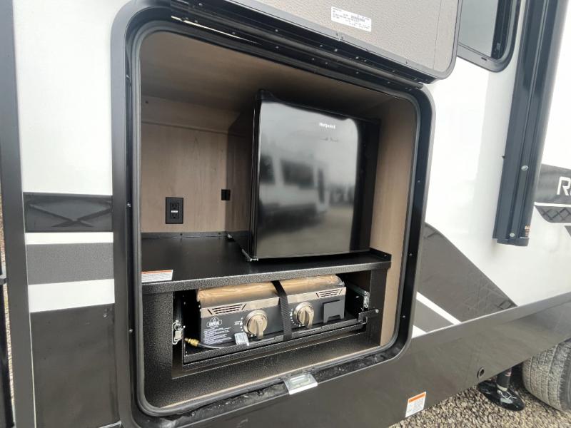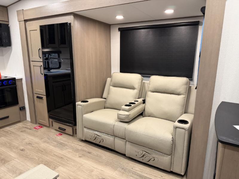 At the front of this fifth wheel, a private bedroom offers a walk-around 60" x 80" queen bed for restful comfort, complemented by dual wardrobes for convenient clothing storage. Down the hall, the full bathroom includes a 30" x 36" residential walk-in shower, a large, mirrored medicine cabinet, and linen storage for towels and toiletries. The middle living area features a cozy fireplace and booth dinette with a TV above perfect for dining while enjoying your favorite shows. Opposite, a slide-out holds the 62" theater seating for relaxing after a day of adventure, alongside a 10-cu. ft. refrigerator and pantry for all your groceries and dry goods. At the rear, an L-shaped kitchen provides generous counter space, a deep-seated stainless-steel sink, and a 30" microwave, allowing you to prepare meals comfortably without relying on campground facilities.