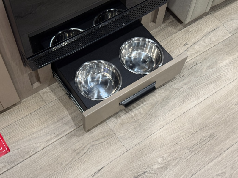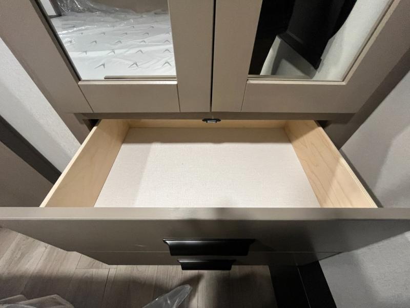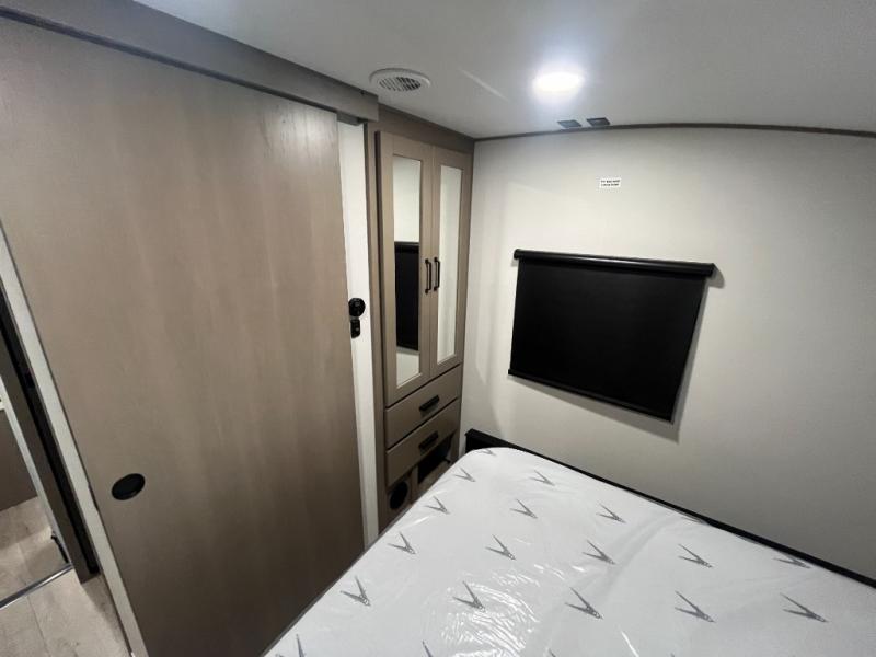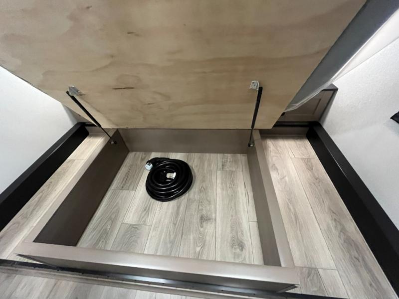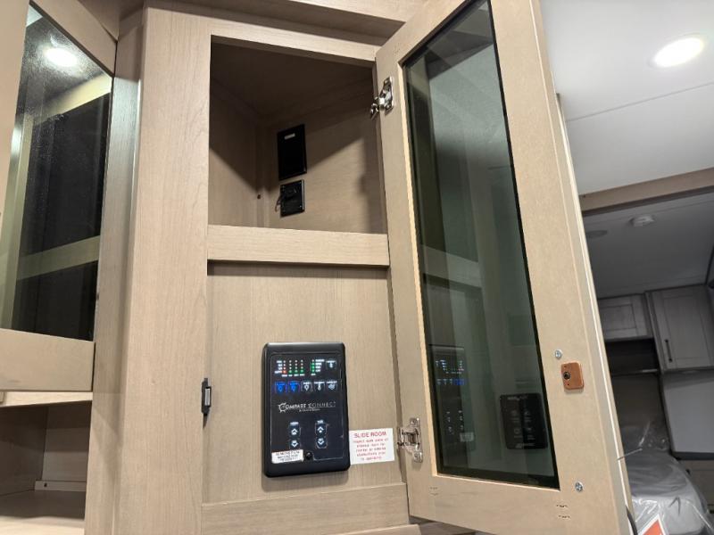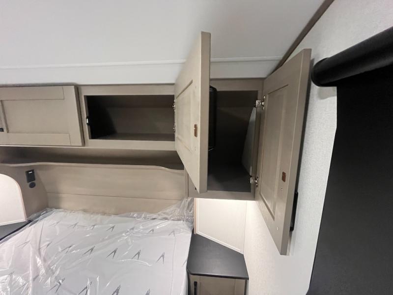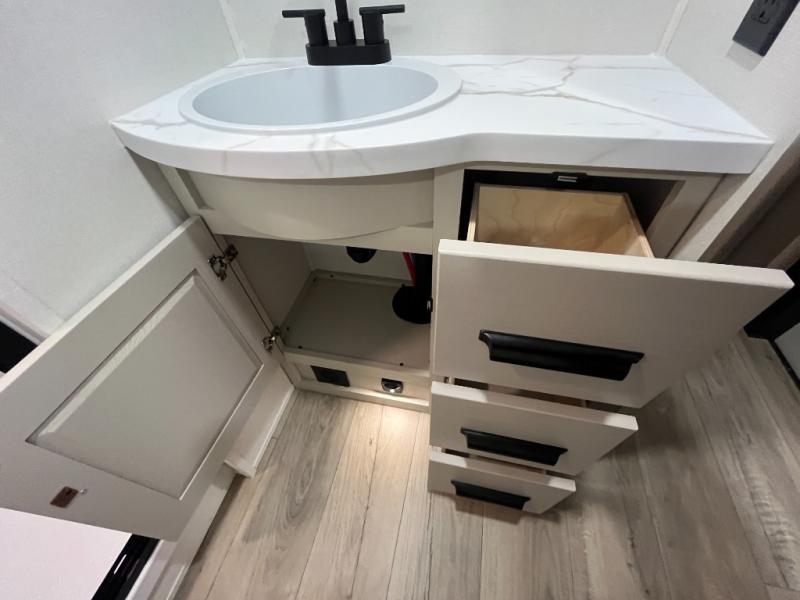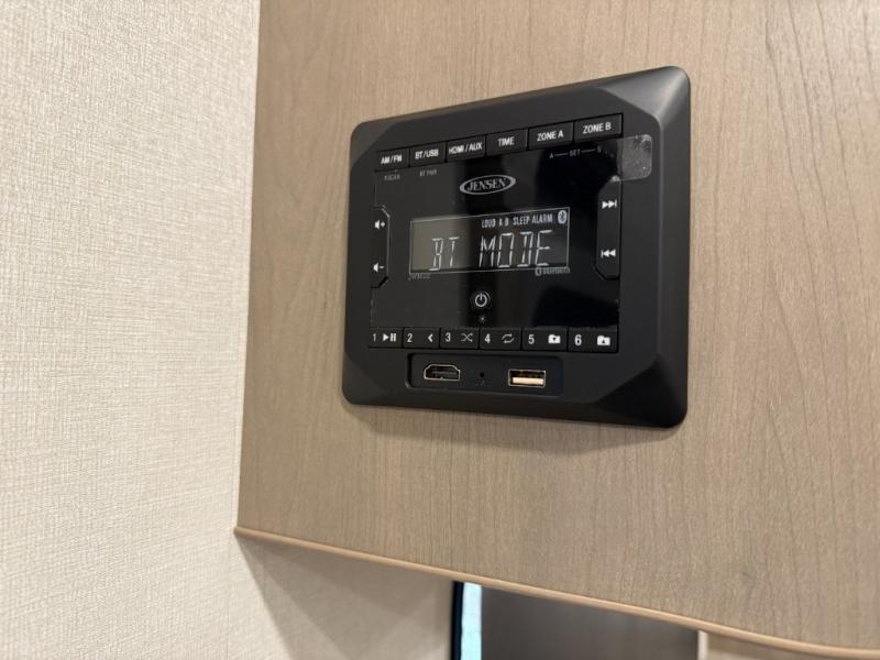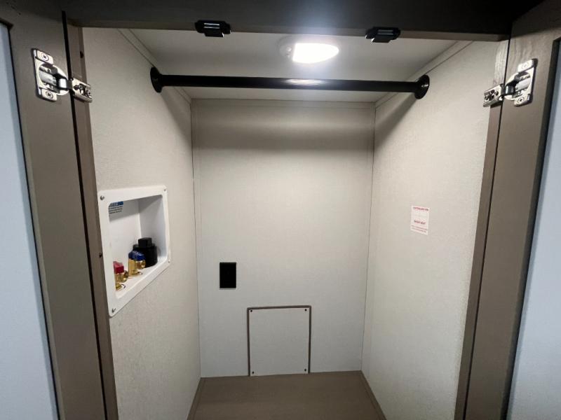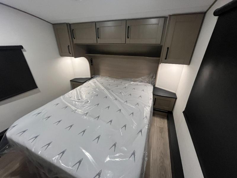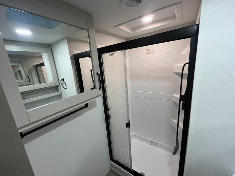 At the front of this fifth wheel, a private bedroom offers a walk-around 60" x 80" queen bed for restful comfort, complemented by dual wardrobes for convenient clothing storage. Down the hall, the full bathroom includes a 30" x 36" residential walk-in shower, a large, mirrored medicine cabinet, and linen storage for towels and toiletries. The middle living area features a cozy fireplace and booth dinette with a TV above perfect for dining while enjoying your favorite shows. Opposite, a slide-out holds the 62" theater seating for relaxing after a day of adventure, alongside a 10-cu. ft. refrigerator and pantry for all your groceries and dry goods. At the rear, an L-shaped kitchen provides generous counter space, a deep-seated stainless-steel sink, and a 30" microwave, allowing you to prepare meals comfortably without relying on campground facilities.
