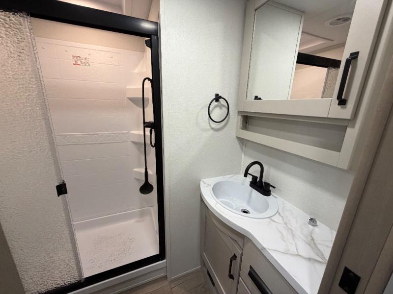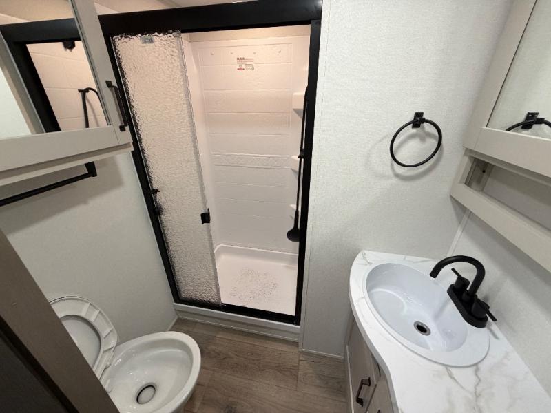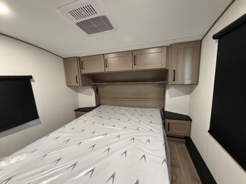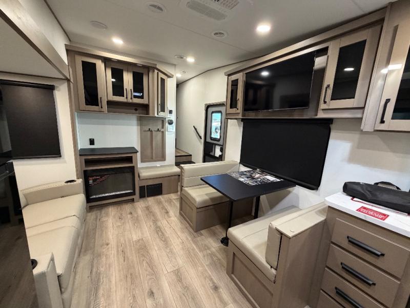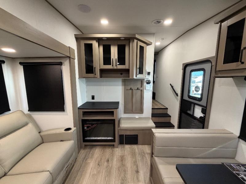 At the front of this fifth wheel, a private bedroom offers a walk-around 60" x 80" queen bed for restful comfort, complemented by dual wardrobes for convenient clothing storage. Down the hall, the full bathroom includes a 30" x 36" residential walk-in shower, a large, mirrored medicine cabinet, and linen storage for towels and toiletries. The middle living area features a cozy fireplace and booth dinette with a TV above perfect for dining while enjoying your favorite shows. Opposite, a slide-out holds the 62" theater seating for relaxing after a day of adventure, alongside a 10-cu. ft. refrigerator and pantry for all your groceries and dry goods. At the rear, an L-shaped kitchen provides generous counter space, a deep-seated stainless-steel sink, and a 30" microwave, allowing you to prepare meals comfortably without relying on campground facilities.