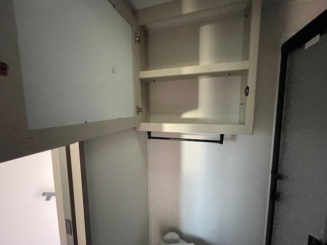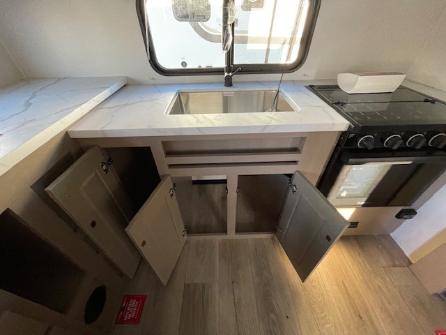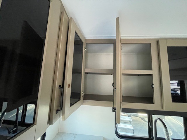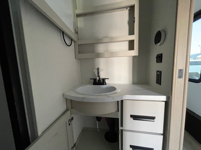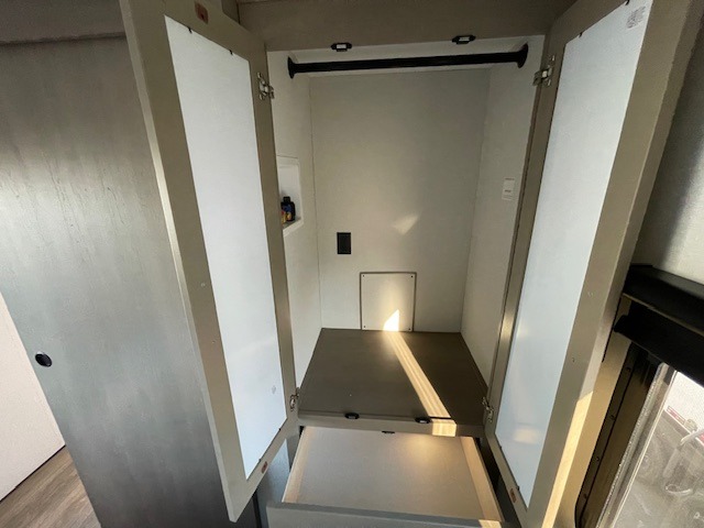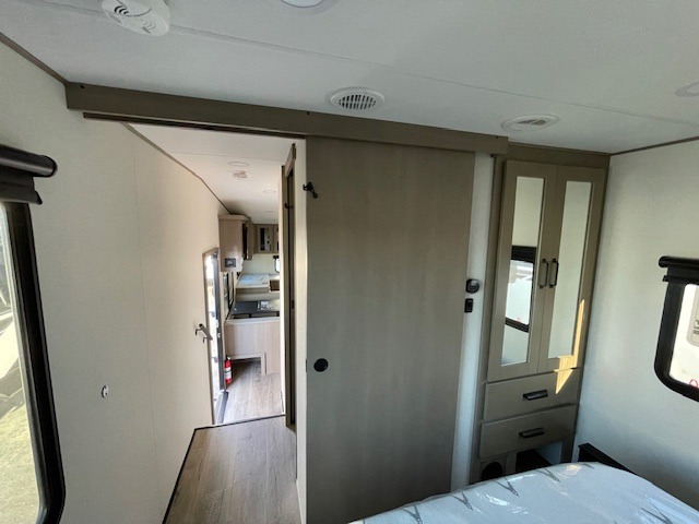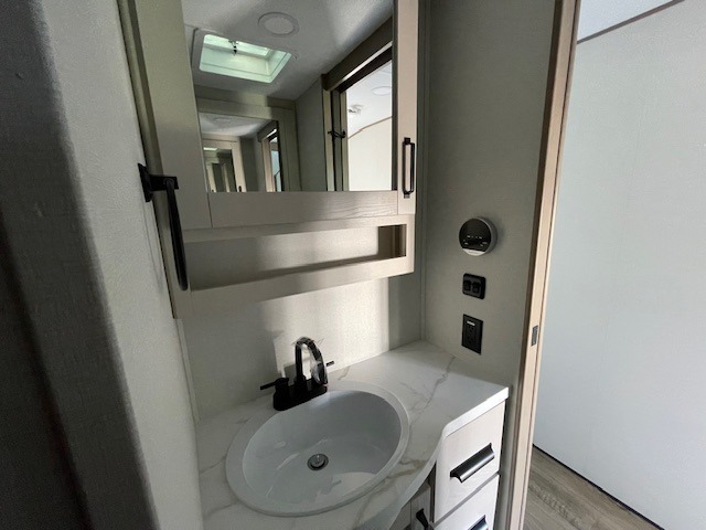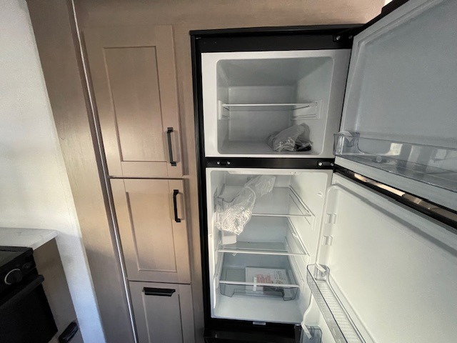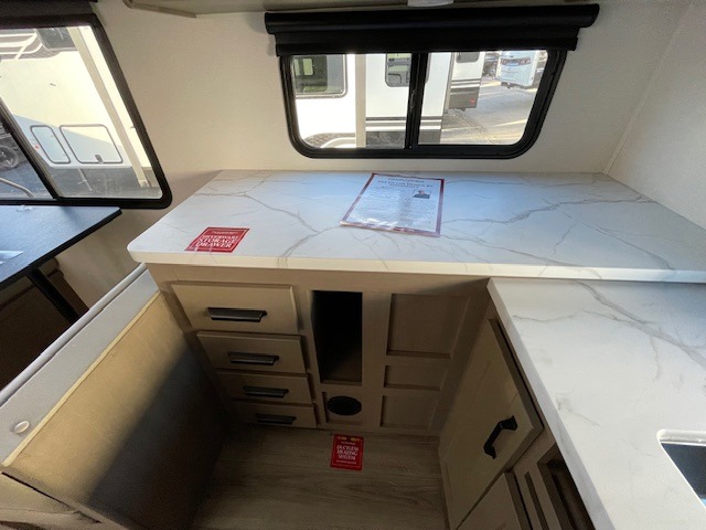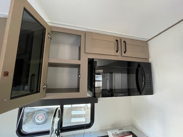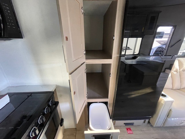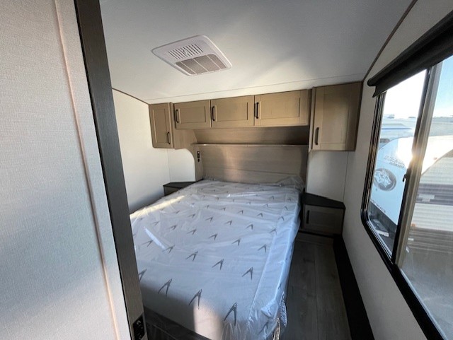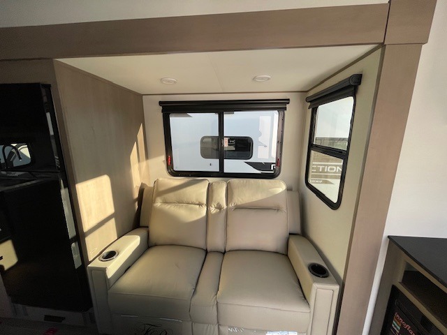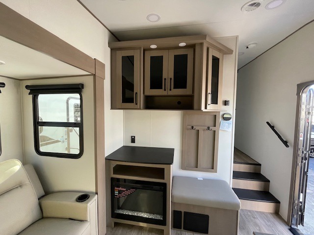 At the front of this fifth wheel, a private bedroom offers a walk-around 60" x 80" queen bed for restful comfort, complemented by dual wardrobes for convenient clothing storage. Down the hall, the full bathroom includes a 30" x 36" residential walk-in shower, a large, mirrored medicine cabinet, and linen storage for towels and toiletries. The middle living area features a cozy fireplace and booth dinette with a TV above perfect for dining while enjoying your favorite shows. Opposite, a slide-out holds the 62" theater seating for relaxing after a day of adventure, alongside a 10-cu. ft. refrigerator and pantry for all your groceries and dry goods. At the rear, an L-shaped kitchen provides generous counter space, a deep-seated stainless-steel sink, and a 30" microwave, allowing you to prepare meals comfortably without relying on campground facilities.