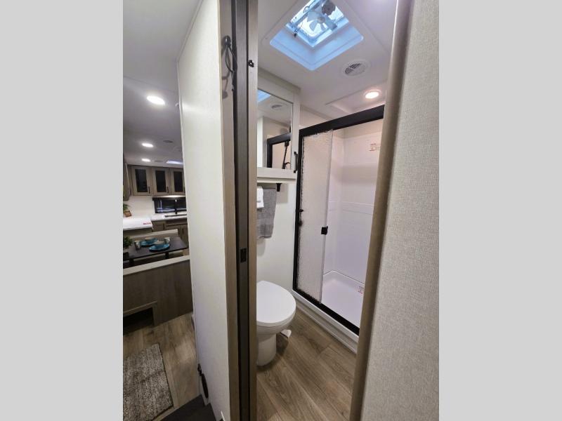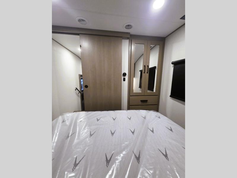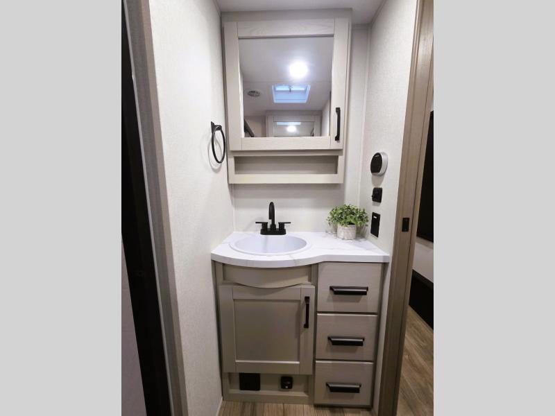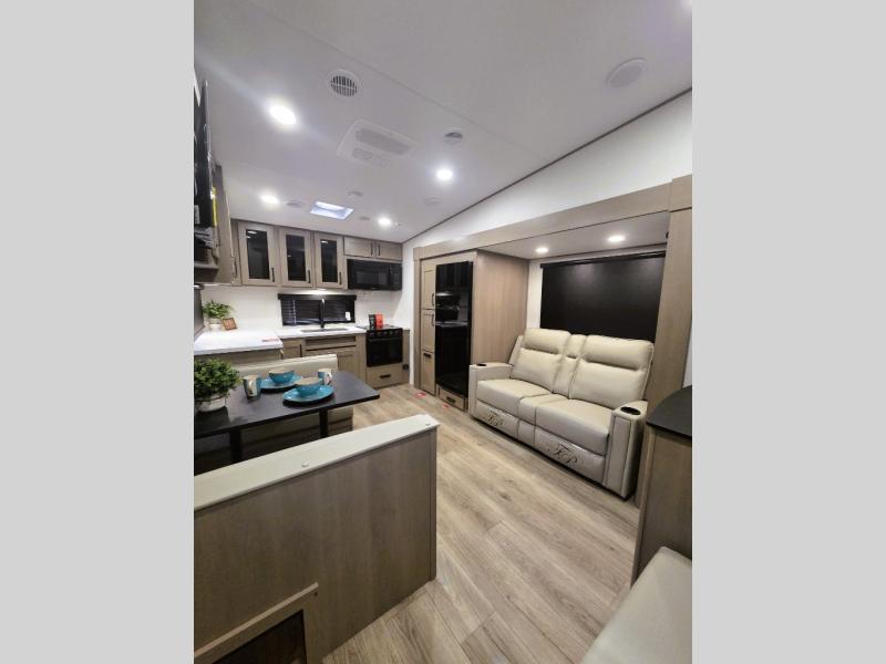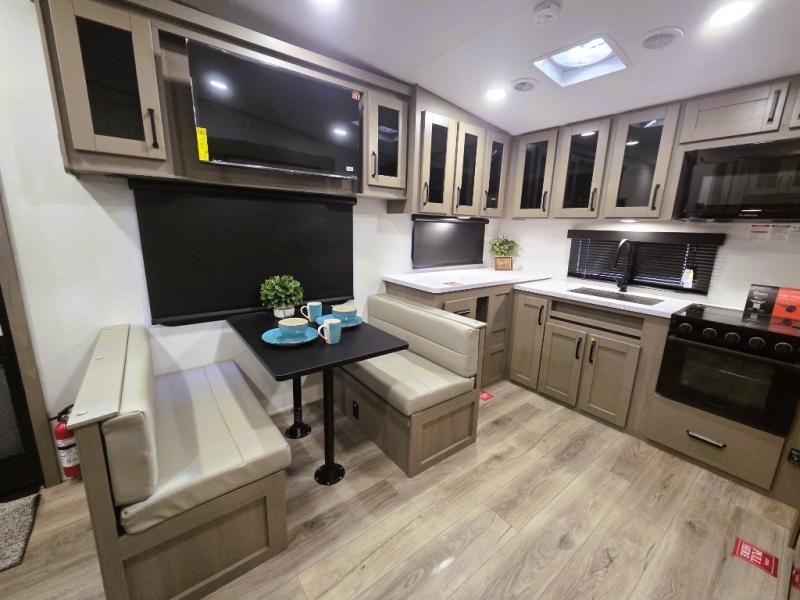 At the front of this fifth wheel, a private bedroom offers a walk-around 60" x 80" queen bed for restful comfort, complemented by dual wardrobes for convenient clothing storage. Down the hall, the full bathroom includes a 30" x 36" residential walk-in shower, a large, mirrored medicine cabinet, and linen storage for towels and toiletries. The middle living area features a cozy fireplace and booth dinette with a TV above perfect for dining while enjoying your favorite shows. Opposite, a slide-out holds the 62" theater seating for relaxing after a day of adventure, alongside a 10-cu. ft. refrigerator and pantry for all your groceries and dry goods. At the rear, an L-shaped kitchen provides generous counter space, a deep-seated stainless-steel sink, and a 30" microwave, allowing you to prepare meals comfortably without relying on campground facilities.