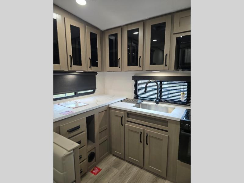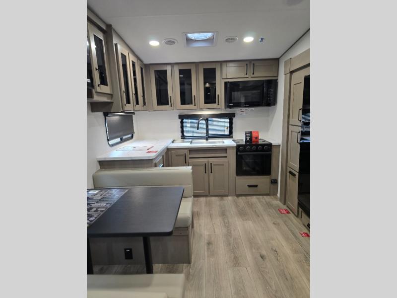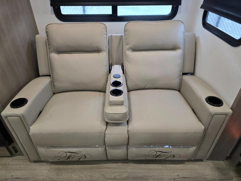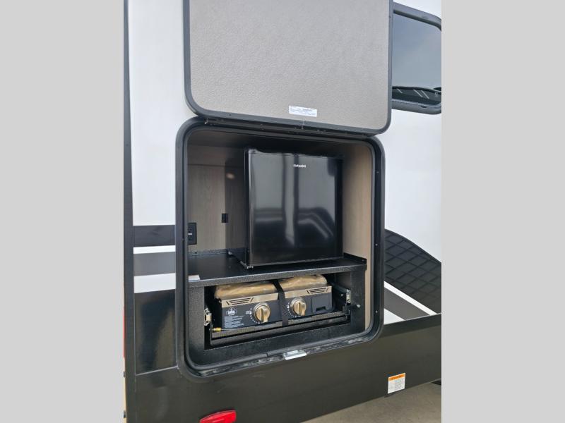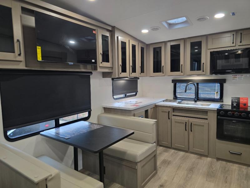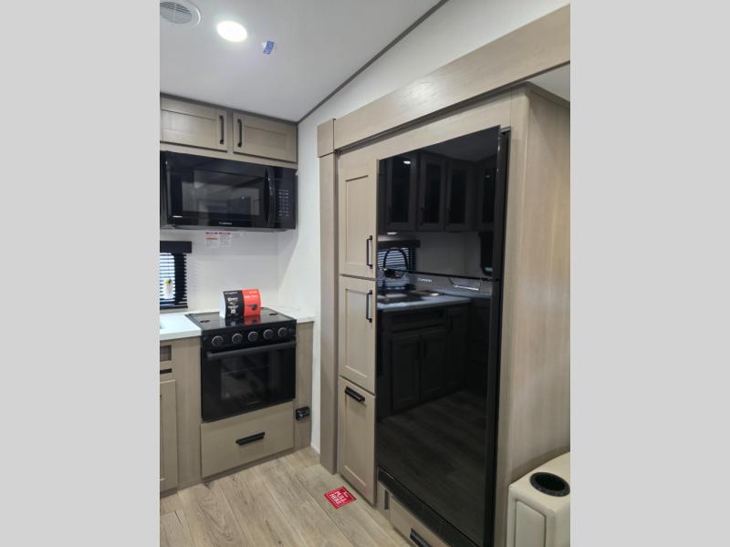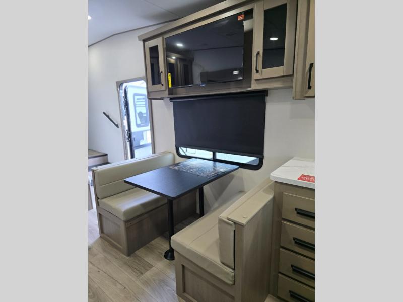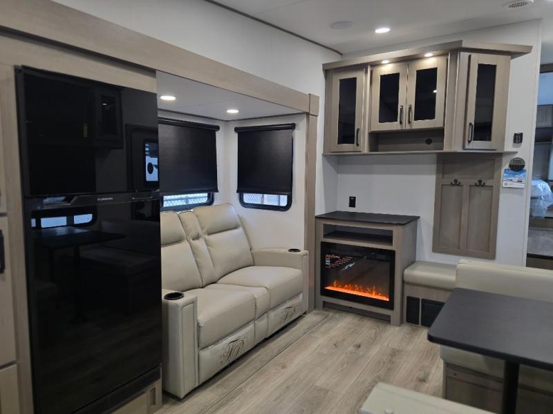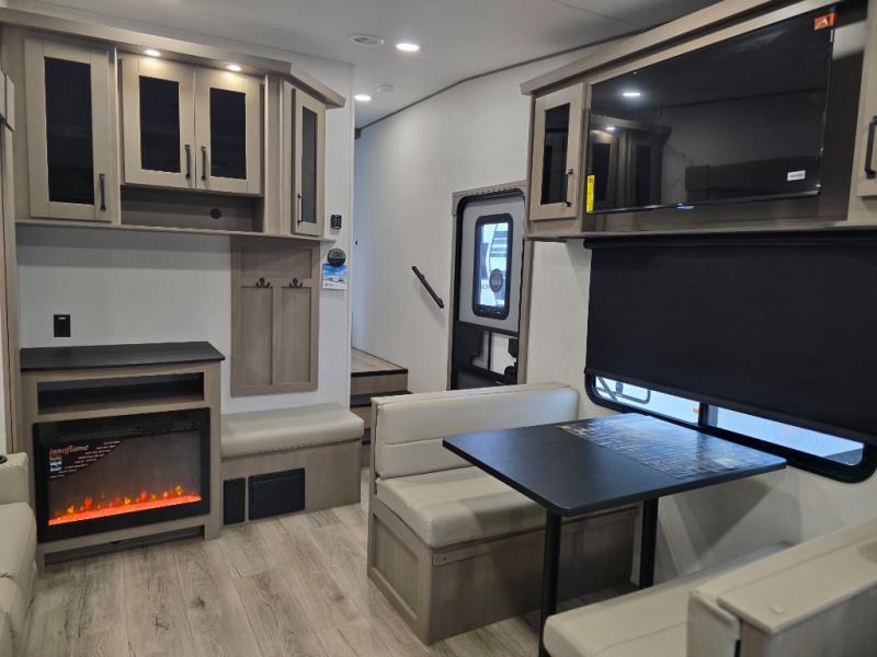 At the front of this fifth wheel, a private bedroom offers a walk-around 60" x 80" queen bed for restful comfort, complemented by dual wardrobes for convenient clothing storage. Down the hall, the full bathroom includes a 30" x 36" residential walk-in shower, a large, mirrored medicine cabinet, and linen storage for towels and toiletries. The middle living area features a cozy fireplace and booth dinette with a TV above perfect for dining while enjoying your favorite shows. Opposite, a slide-out holds the 62" theater seating for relaxing after a day of adventure, alongside a 10-cu. ft. refrigerator and pantry for all your groceries and dry goods. At the rear, an L-shaped kitchen provides generous counter space, a deep-seated stainless-steel sink, and a 30" microwave, allowing you to prepare meals comfortably without relying on campground facilities.