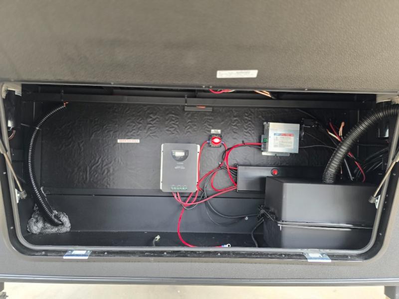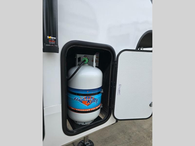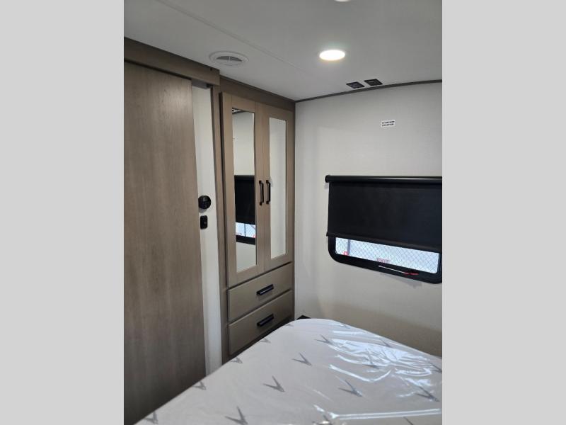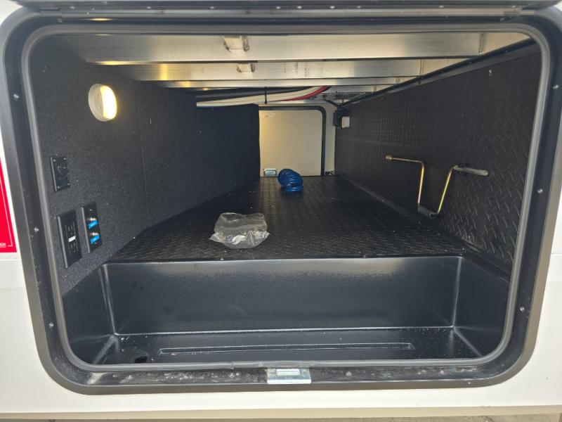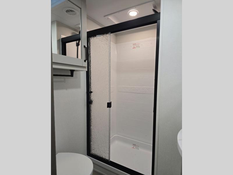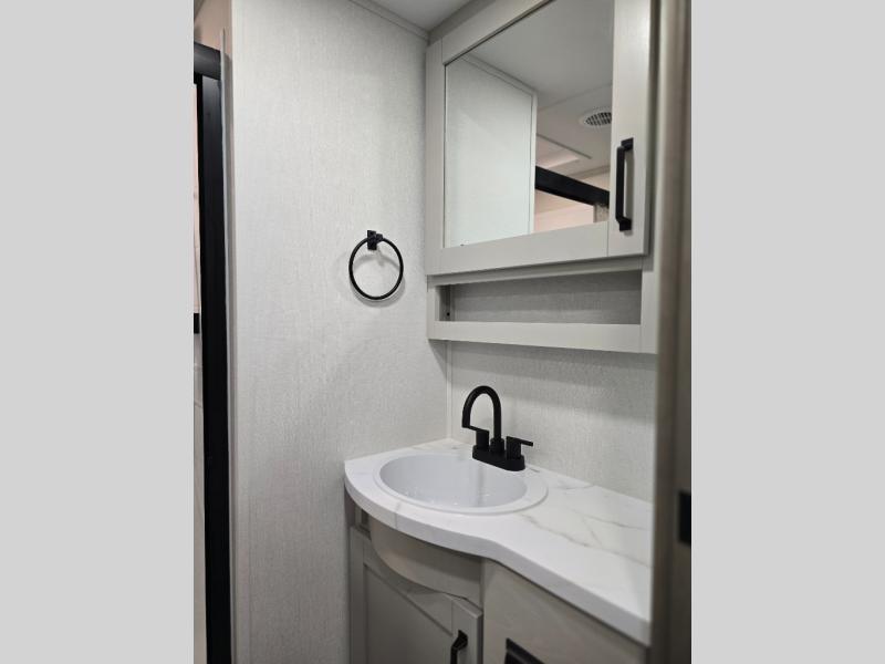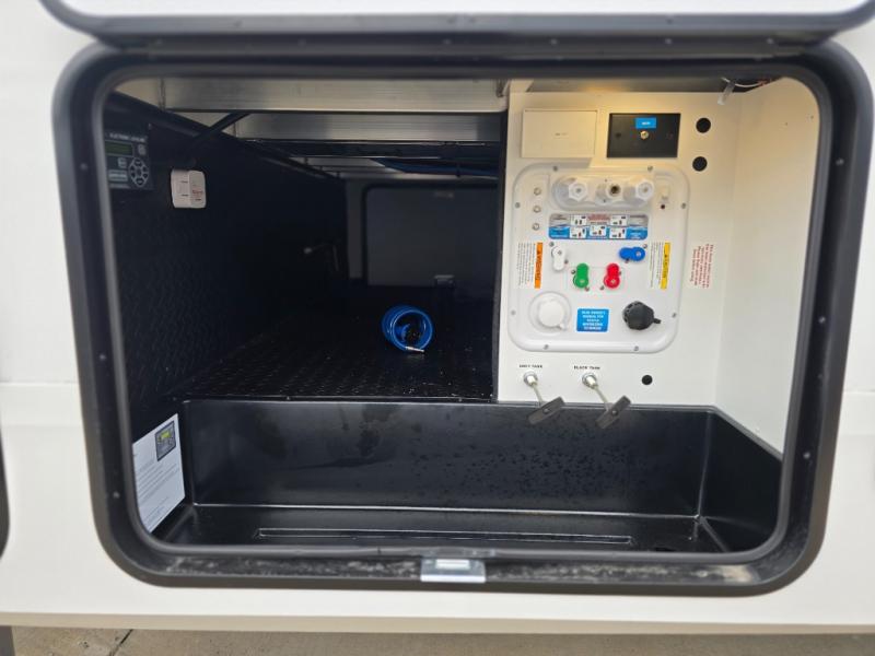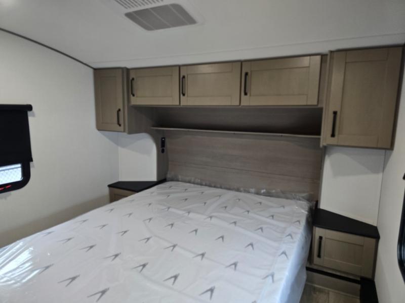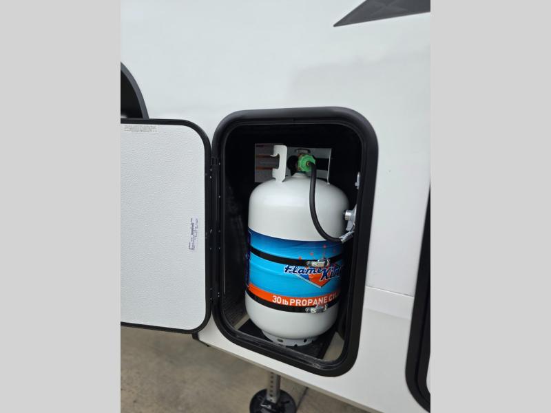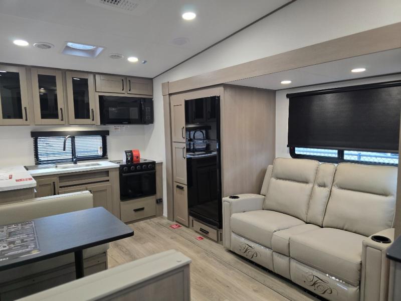 At the front of this fifth wheel, a private bedroom offers a walk-around 60" x 80" queen bed for restful comfort, complemented by dual wardrobes for convenient clothing storage. Down the hall, the full bathroom includes a 30" x 36" residential walk-in shower, a large, mirrored medicine cabinet, and linen storage for towels and toiletries. The middle living area features a cozy fireplace and booth dinette with a TV above perfect for dining while enjoying your favorite shows. Opposite, a slide-out holds the 62" theater seating for relaxing after a day of adventure, alongside a 10-cu. ft. refrigerator and pantry for all your groceries and dry goods. At the rear, an L-shaped kitchen provides generous counter space, a deep-seated stainless-steel sink, and a 30" microwave, allowing you to prepare meals comfortably without relying on campground facilities.