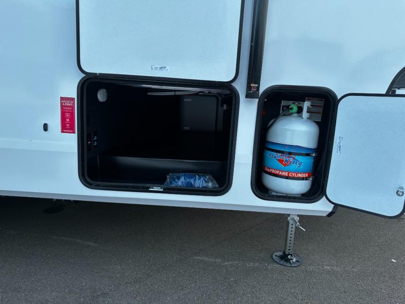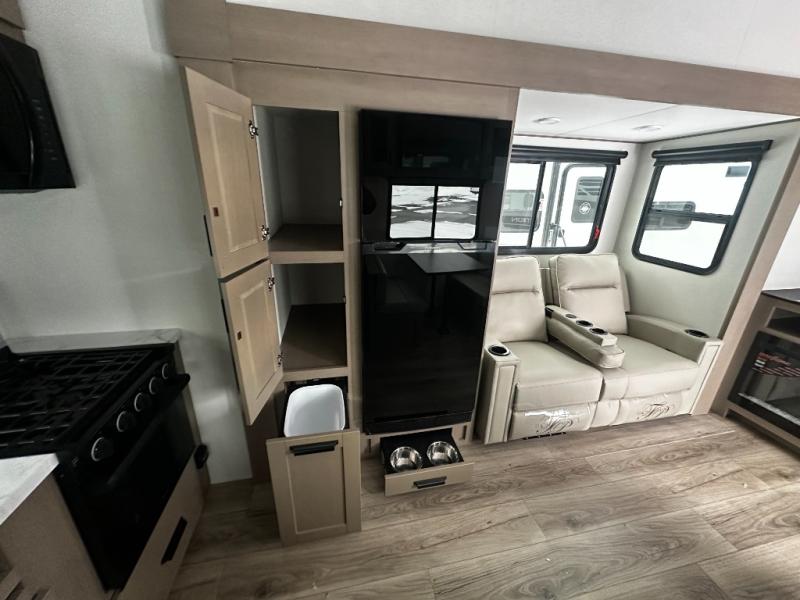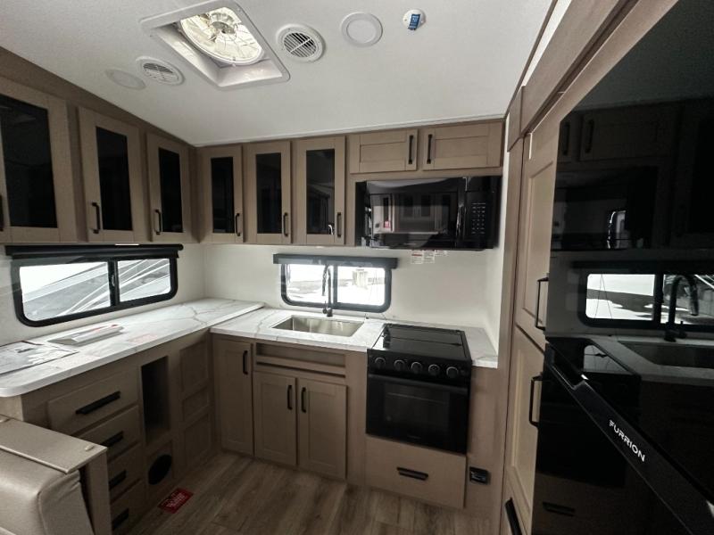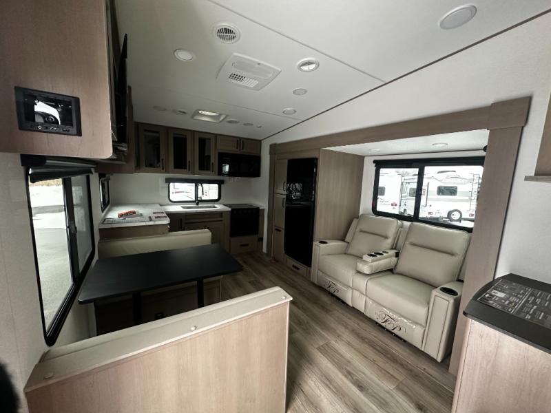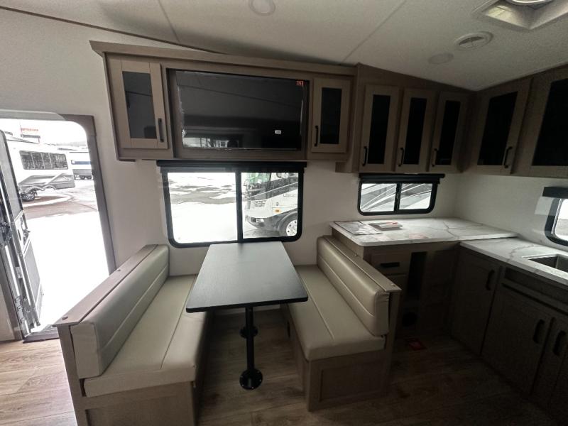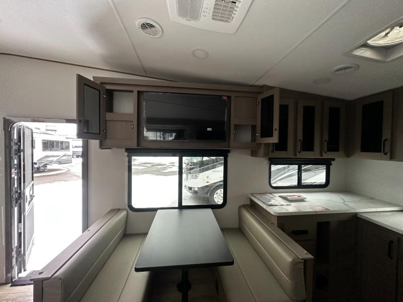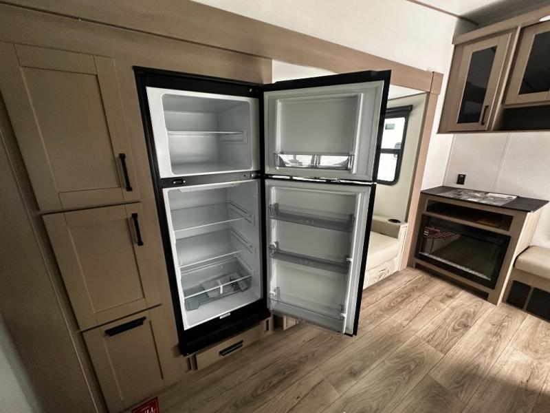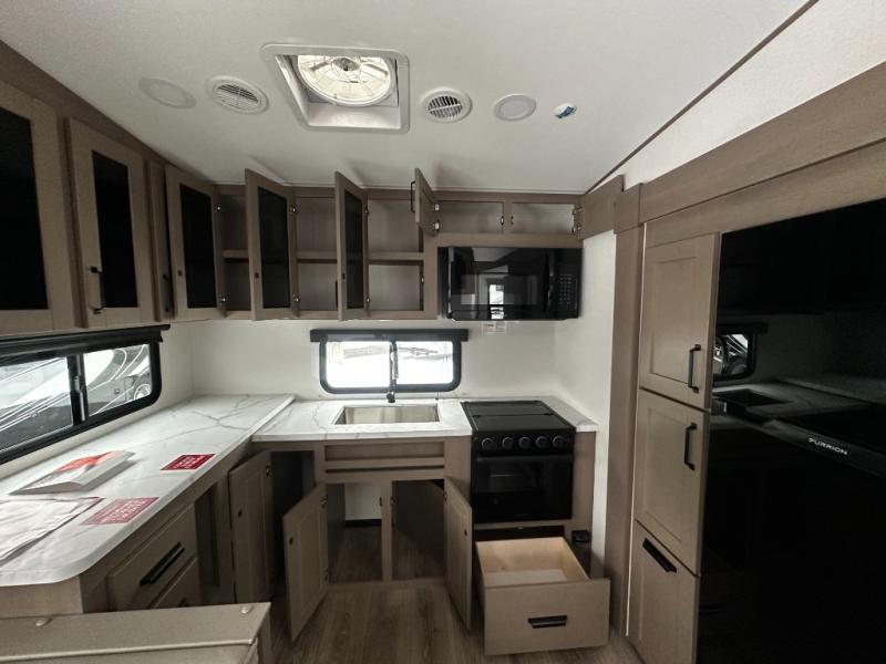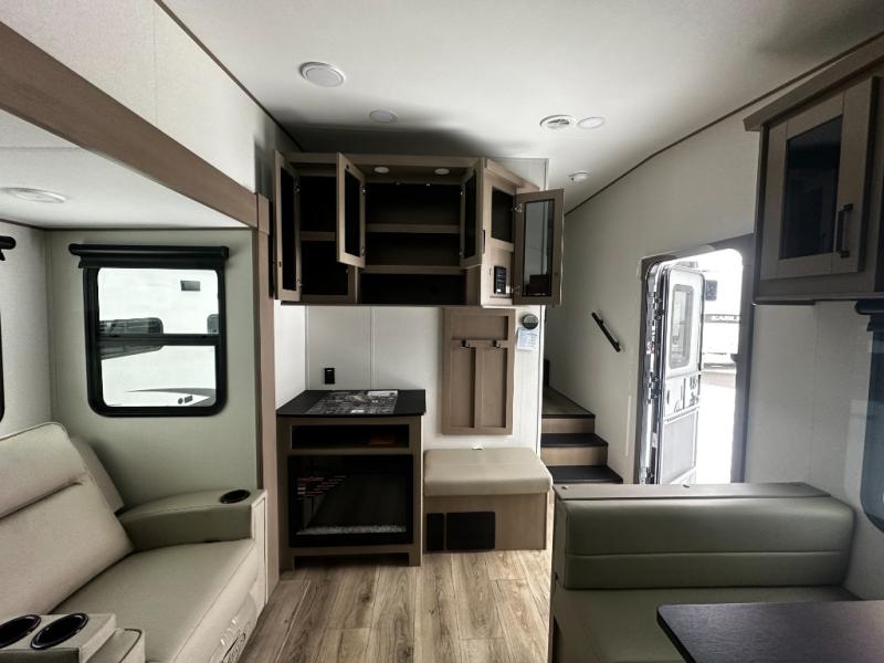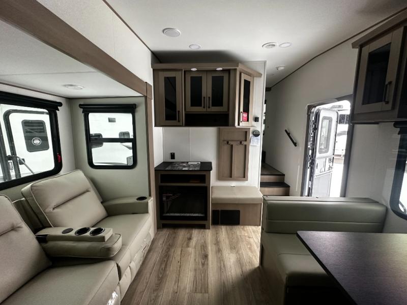 At the front of this fifth wheel, a private bedroom offers a walk-around 60" x 80" queen bed for restful comfort, complemented by dual wardrobes for convenient clothing storage. Down the hall, the full bathroom includes a 30" x 36" residential walk-in shower, a large, mirrored medicine cabinet, and linen storage for towels and toiletries. The middle living area features a cozy fireplace and booth dinette with a TV above perfect for dining while enjoying your favorite shows. Opposite, a slide-out holds the 62" theater seating for relaxing after a day of adventure, alongside a 10-cu. ft. refrigerator and pantry for all your groceries and dry goods. At the rear, an L-shaped kitchen provides generous counter space, a deep-seated stainless-steel sink, and a 30" microwave, allowing you to prepare meals comfortably without relying on campground facilities.