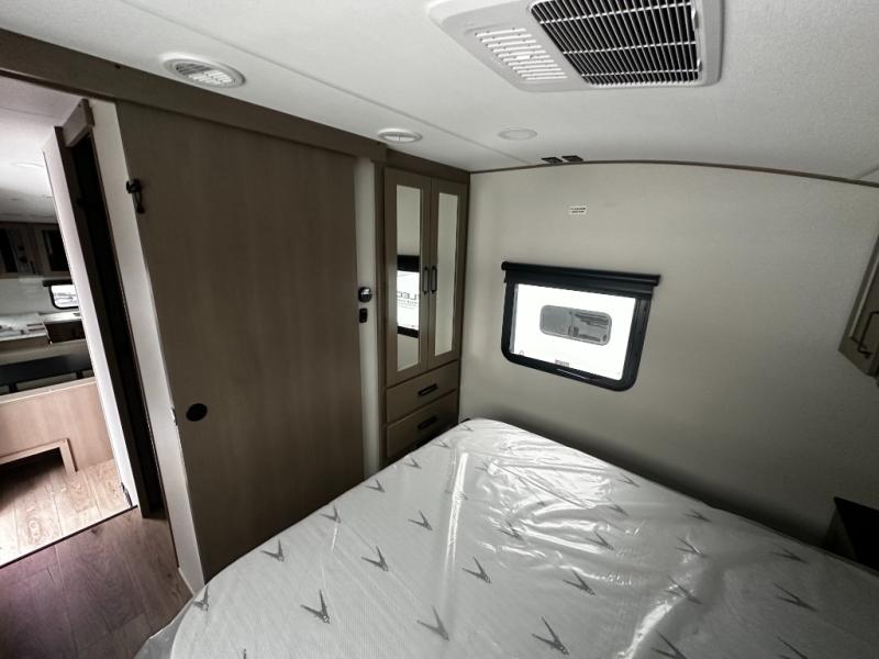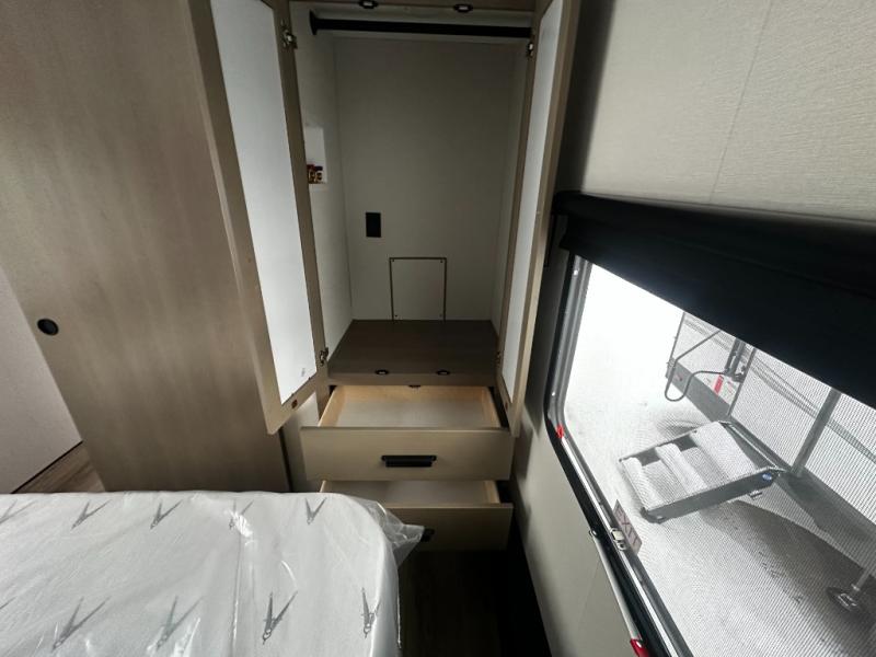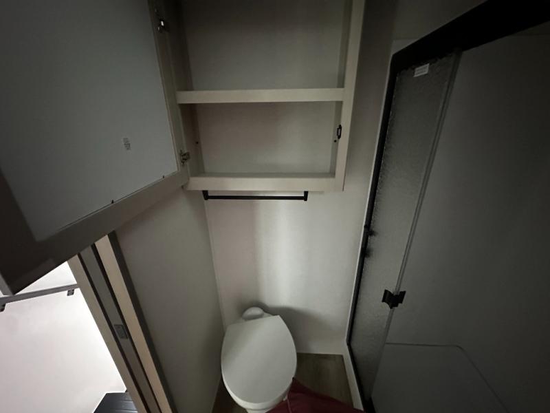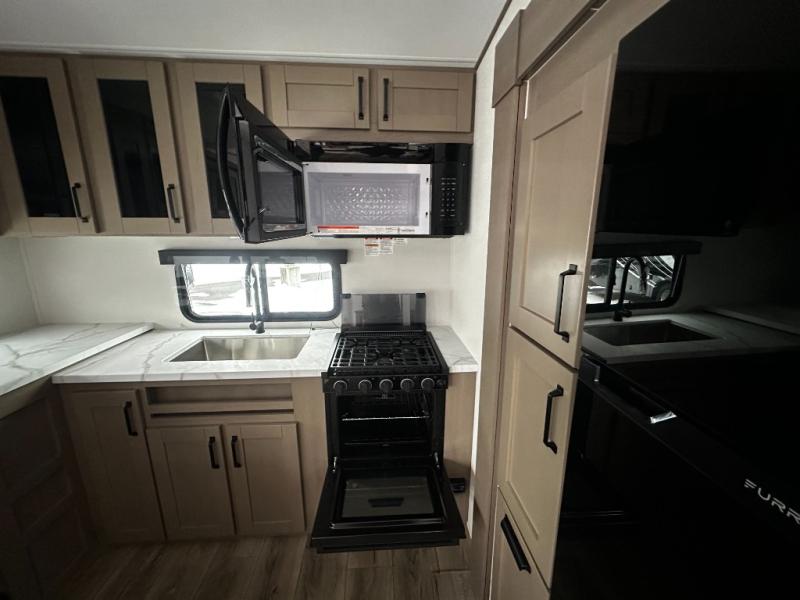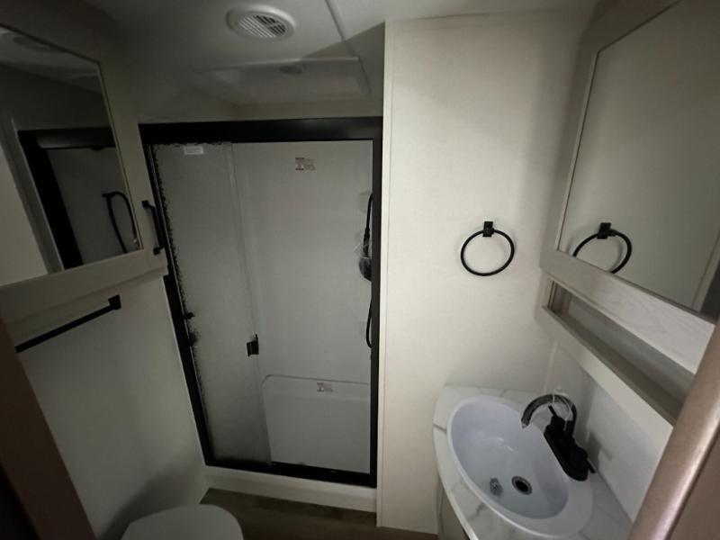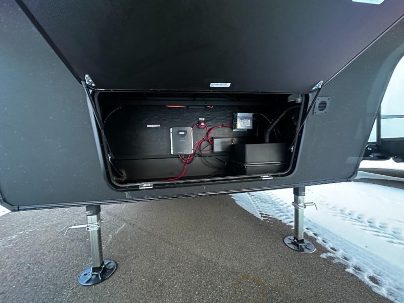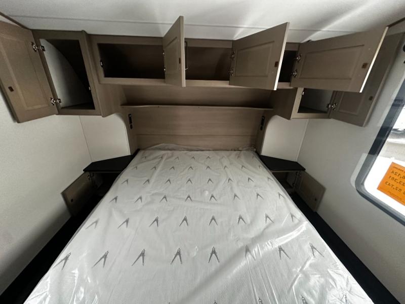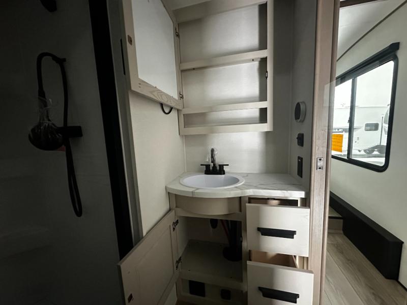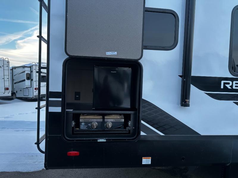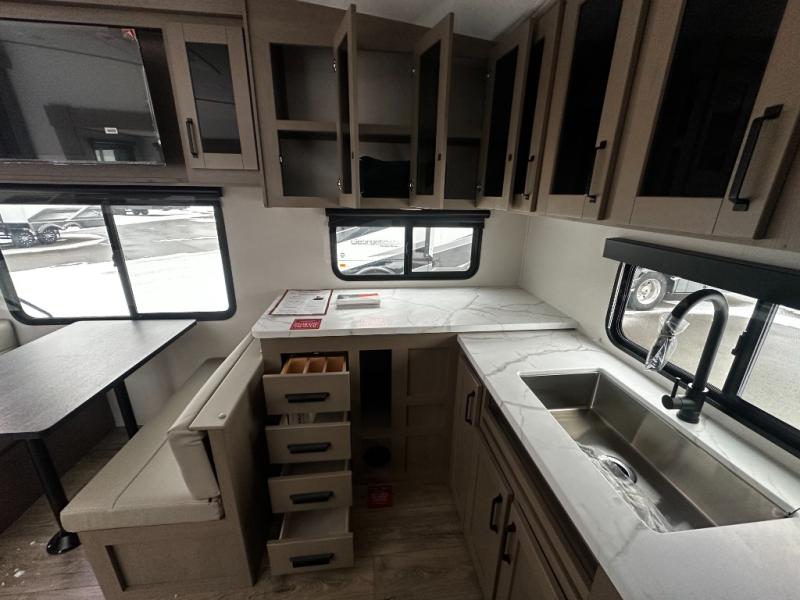 At the front of this fifth wheel, a private bedroom offers a walk-around 60" x 80" queen bed for restful comfort, complemented by dual wardrobes for convenient clothing storage. Down the hall, the full bathroom includes a 30" x 36" residential walk-in shower, a large, mirrored medicine cabinet, and linen storage for towels and toiletries. The middle living area features a cozy fireplace and booth dinette with a TV above perfect for dining while enjoying your favorite shows. Opposite, a slide-out holds the 62" theater seating for relaxing after a day of adventure, alongside a 10-cu. ft. refrigerator and pantry for all your groceries and dry goods. At the rear, an L-shaped kitchen provides generous counter space, a deep-seated stainless-steel sink, and a 30" microwave, allowing you to prepare meals comfortably without relying on campground facilities.