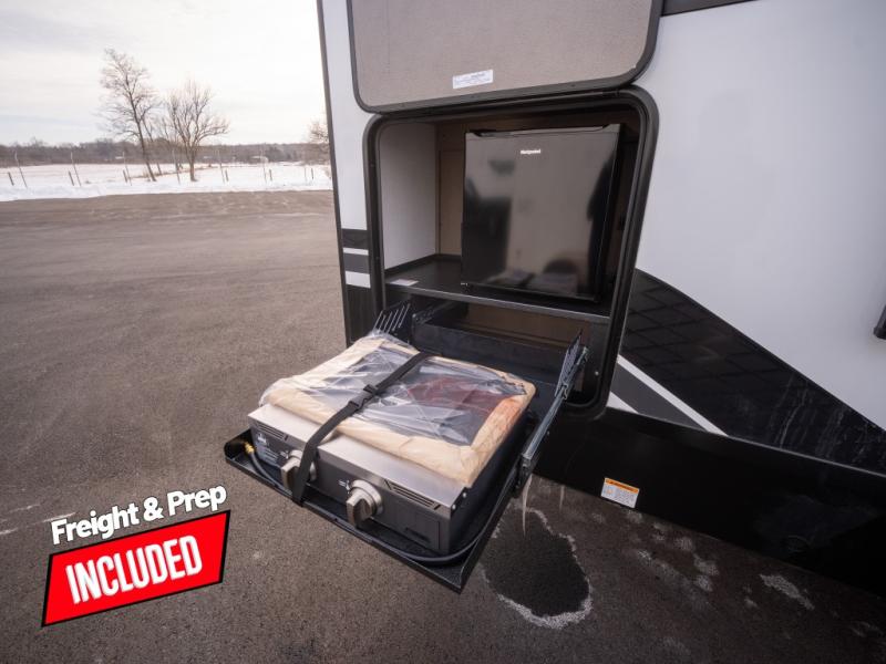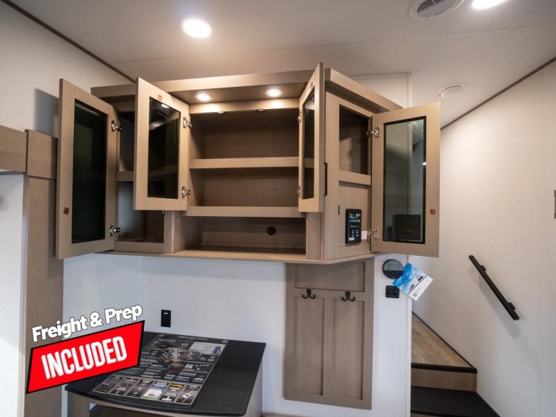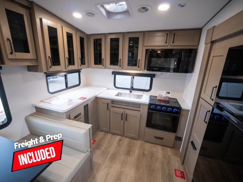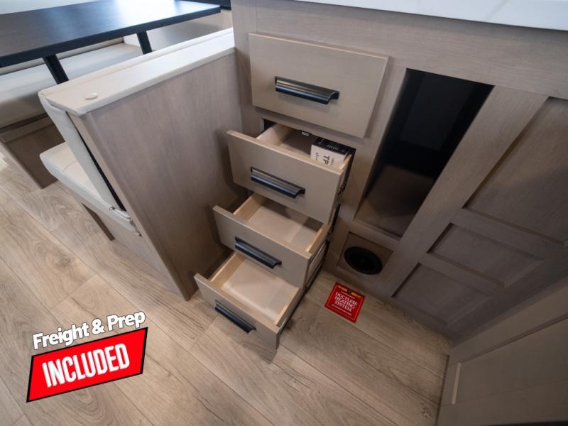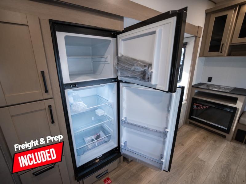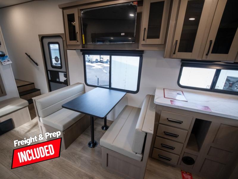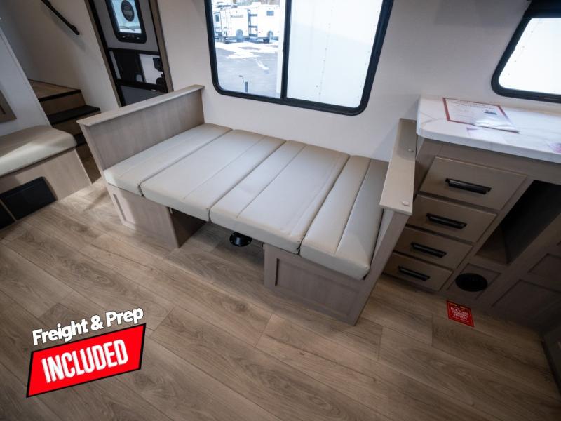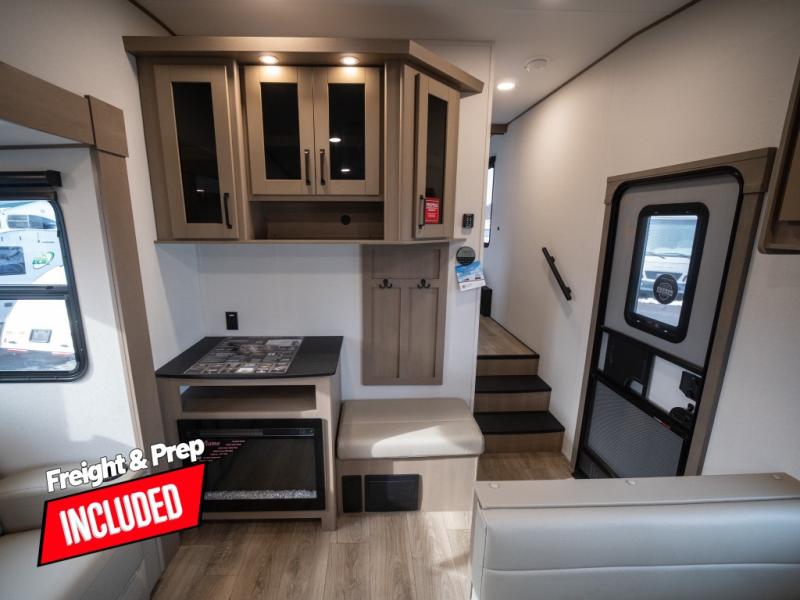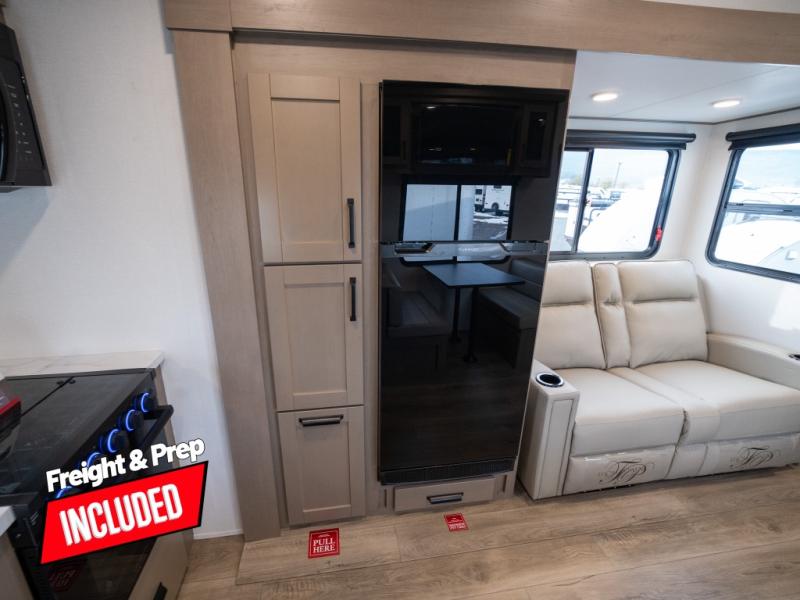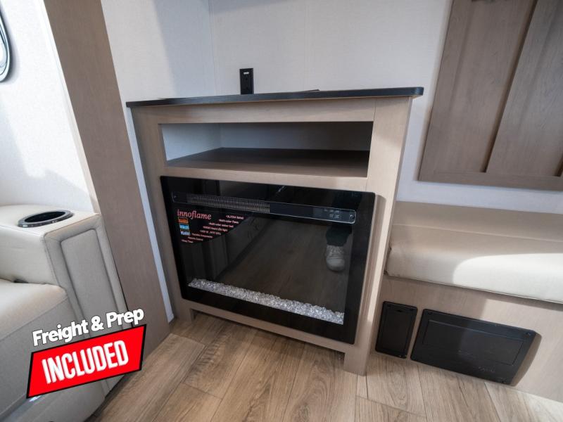 At the front of this fifth wheel, a private bedroom offers a walk-around 60" x 80" queen bed for restful comfort, complemented by dual wardrobes for convenient clothing storage. Down the hall, the full bathroom includes a 30" x 36" residential walk-in shower, a large, mirrored medicine cabinet, and linen storage for towels and toiletries. The middle living area features a cozy fireplace and booth dinette with a TV above perfect for dining while enjoying your favorite shows. Opposite, a slide-out holds the 62" theater seating for relaxing after a day of adventure, alongside a 10-cu. ft. refrigerator and pantry for all your groceries and dry goods. At the rear, an L-shaped kitchen provides generous counter space, a deep-seated stainless-steel sink, and a 30" microwave, allowing you to prepare meals comfortably without relying on campground facilities.