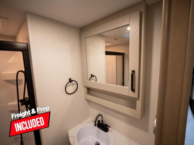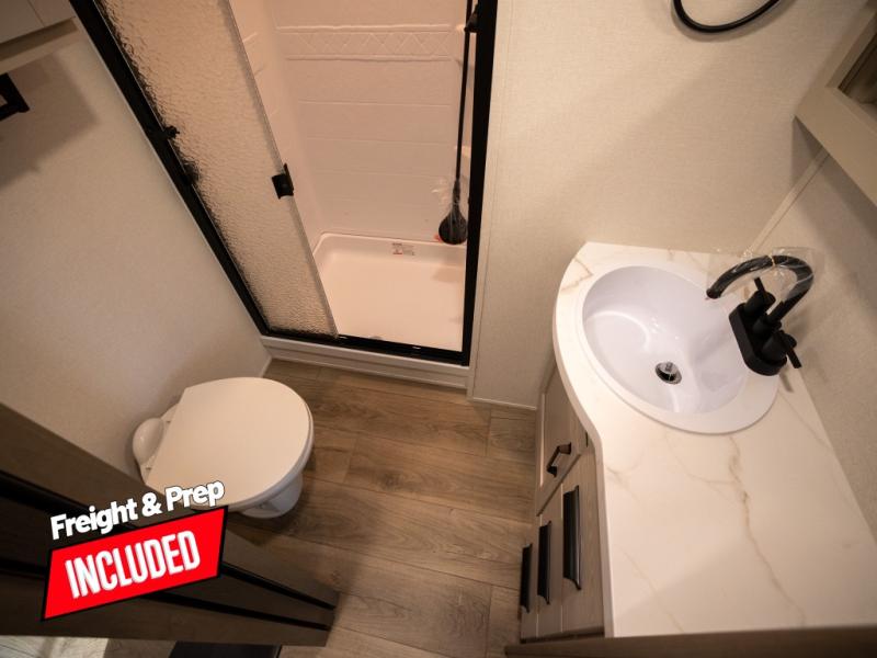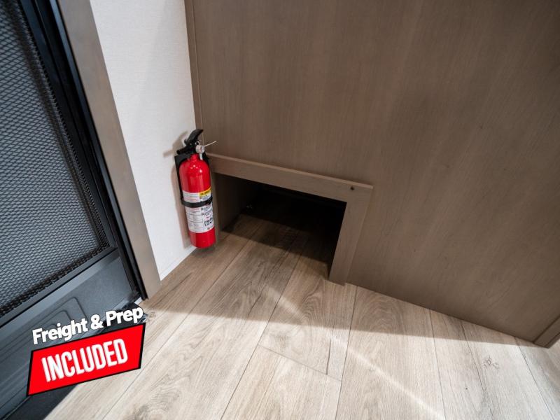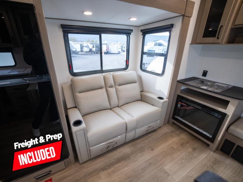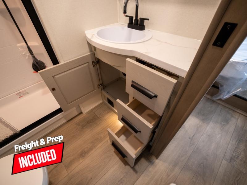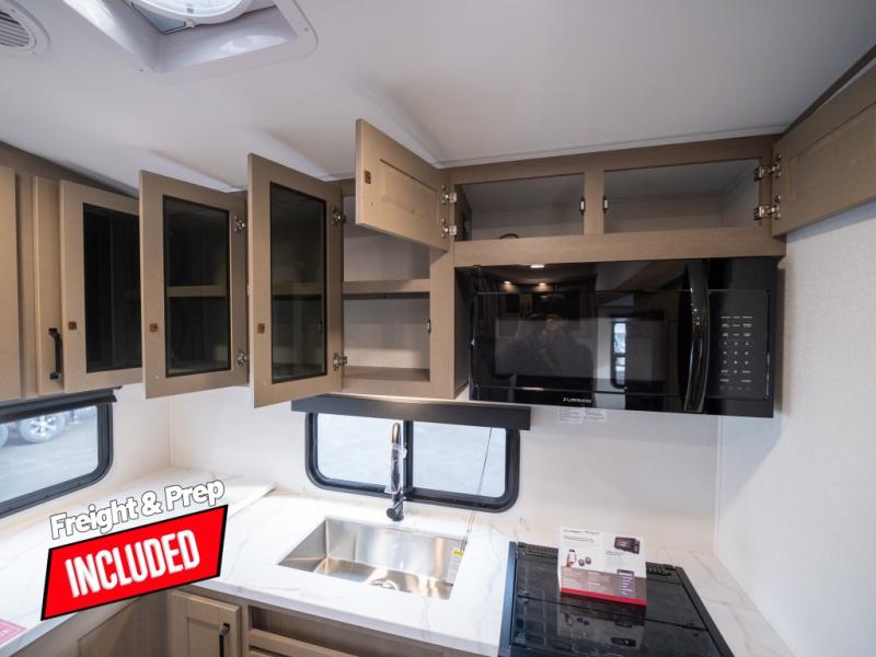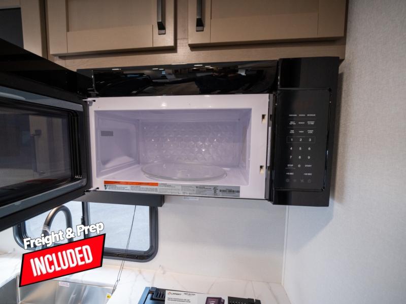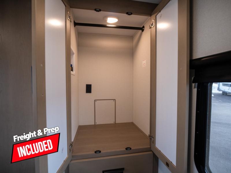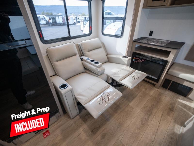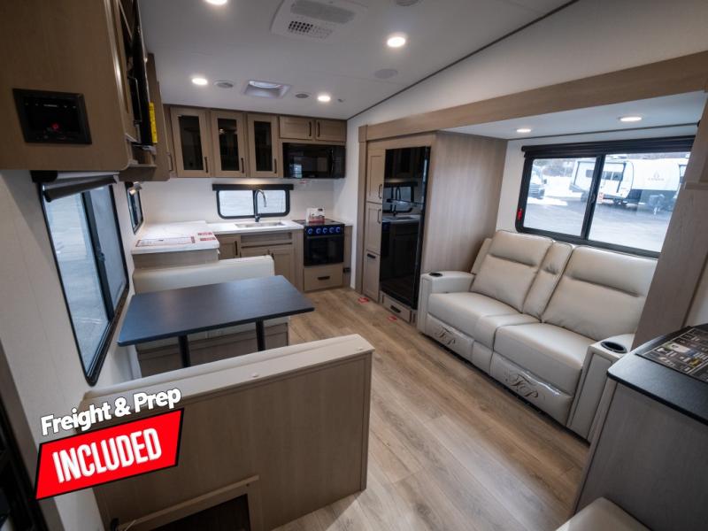At the front of this fifth wheel, a private bedroom offers a walk-around 60" x 80" queen bed for restful comfort, complemented by dual wardrobes for convenient clothing storage. Down the hall, the full bathroom includes a 30" x 36" residential walk-in shower, a large, mirrored medicine cabinet, and linen storage for towels and toiletries. The middle living area features a cozy fireplace and booth dinette with a TV above perfect for dining while enjoying your favorite shows. Opposite, a slide-out holds the 62" theater seating for relaxing after a day of adventure, alongside a 10-cu. ft. refrigerator and pantry for all your groceries and dry goods. At the rear, an L-shaped kitchen provides generous counter space, a deep-seated stainless-steel sink, and a 30" microwave, allowing you to prepare meals comfortably without relying on campground facilities.