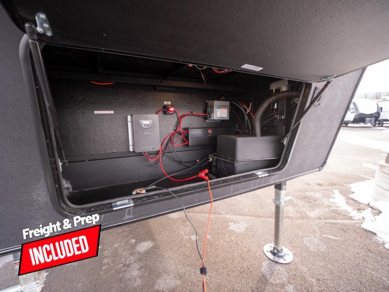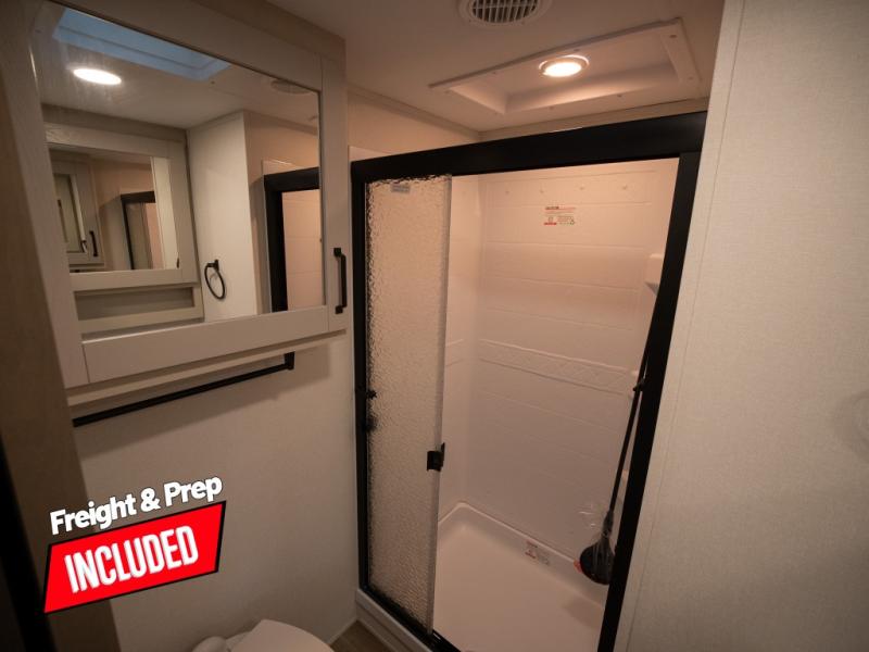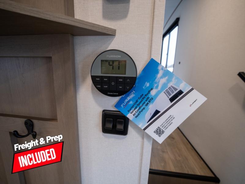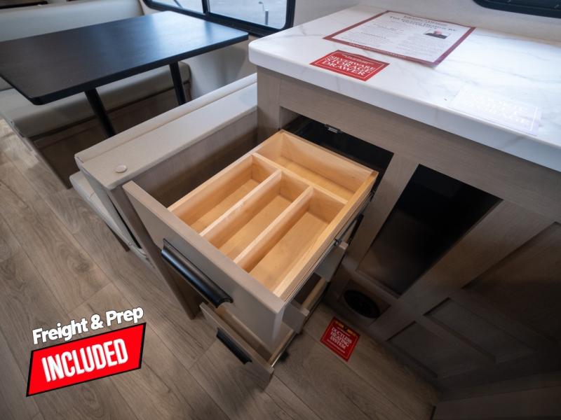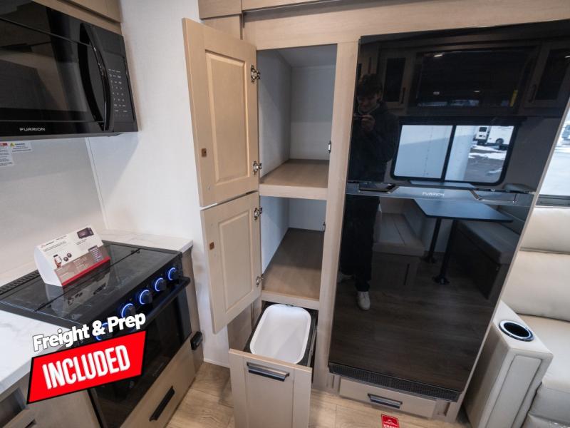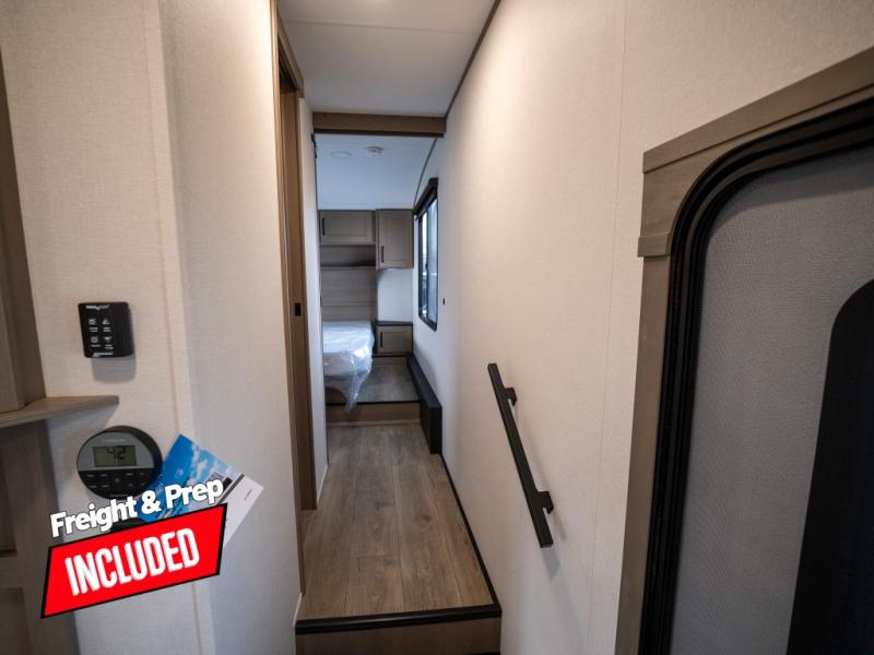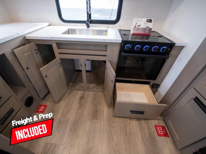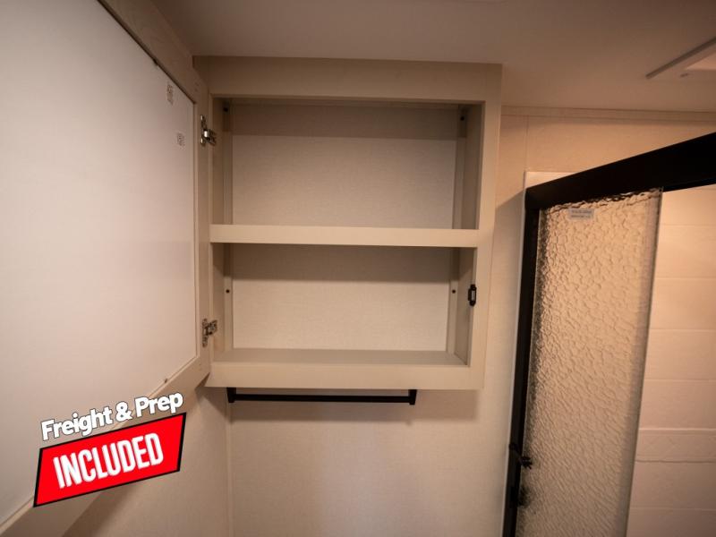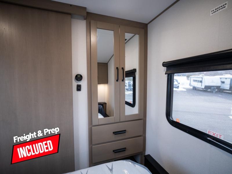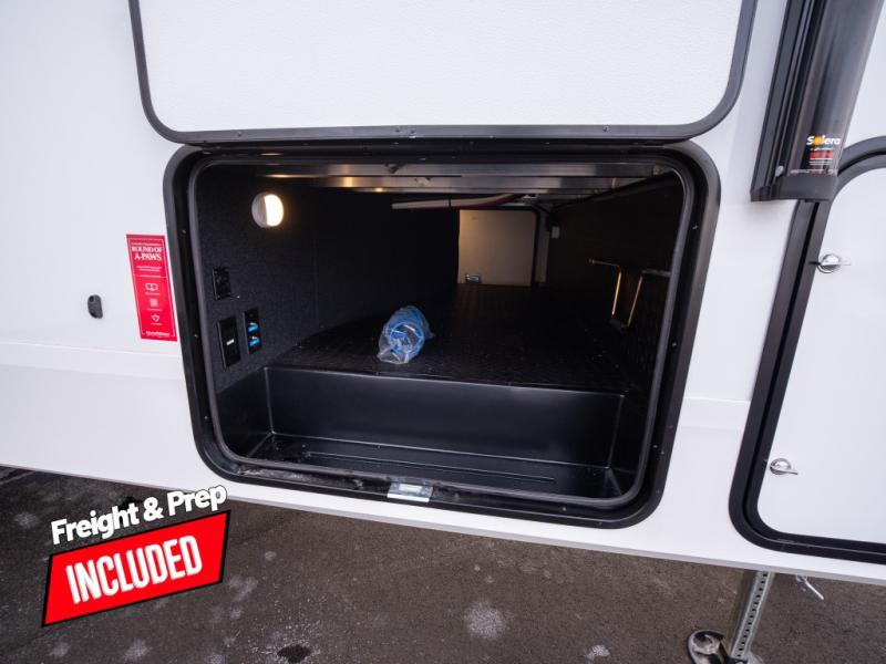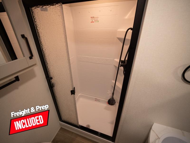 At the front of this fifth wheel, a private bedroom offers a walk-around 60" x 80" queen bed for restful comfort, complemented by dual wardrobes for convenient clothing storage. Down the hall, the full bathroom includes a 30" x 36" residential walk-in shower, a large, mirrored medicine cabinet, and linen storage for towels and toiletries. The middle living area features a cozy fireplace and booth dinette with a TV above perfect for dining while enjoying your favorite shows. Opposite, a slide-out holds the 62" theater seating for relaxing after a day of adventure, alongside a 10-cu. ft. refrigerator and pantry for all your groceries and dry goods. At the rear, an L-shaped kitchen provides generous counter space, a deep-seated stainless-steel sink, and a 30" microwave, allowing you to prepare meals comfortably without relying on campground facilities.