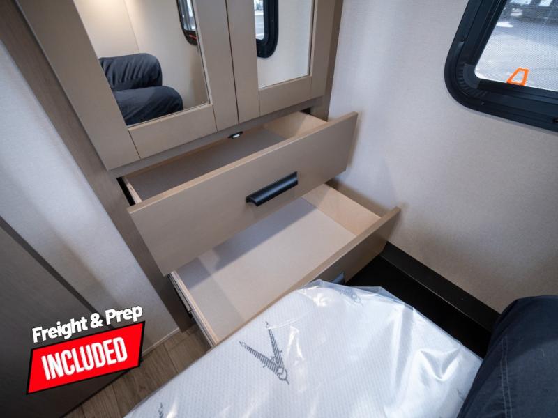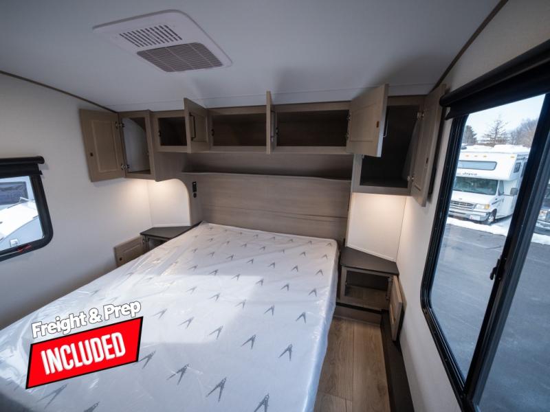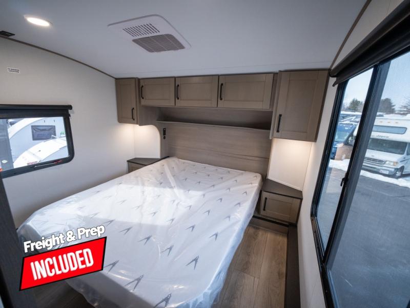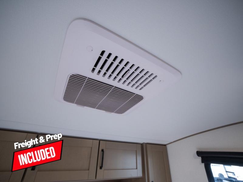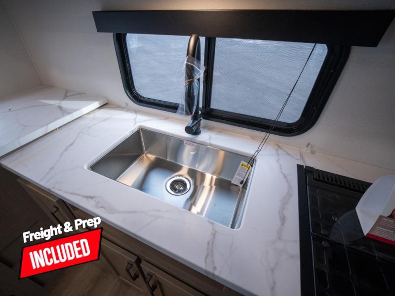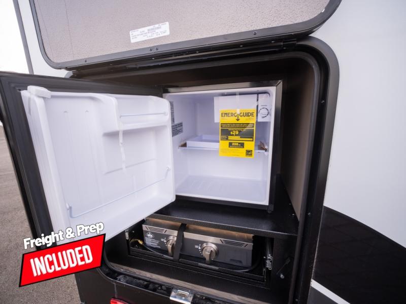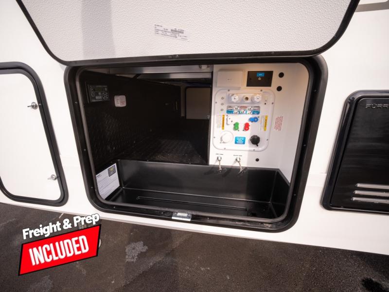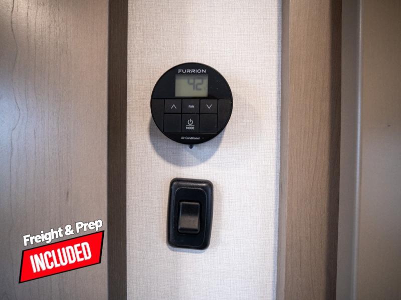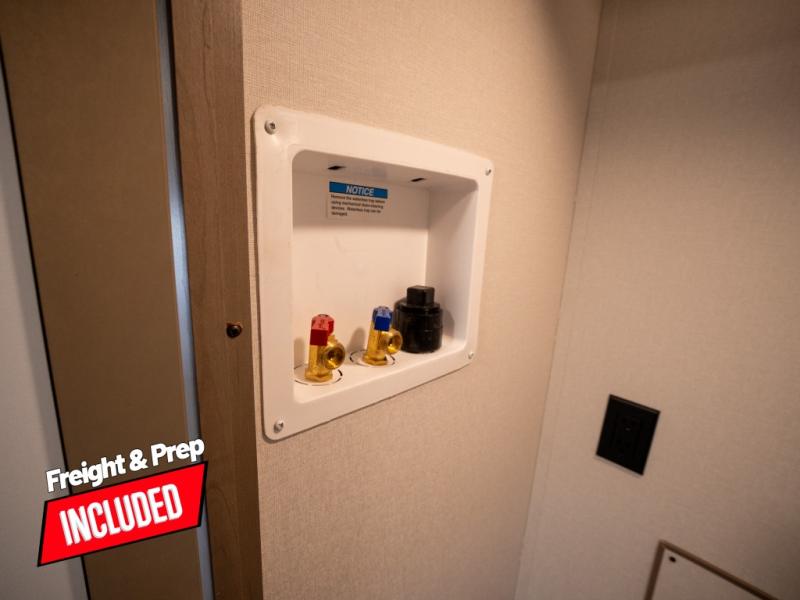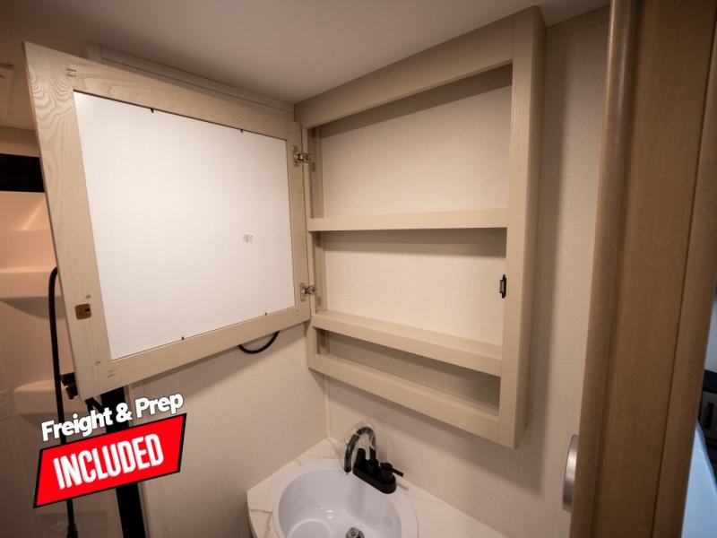 At the front of this fifth wheel, a private bedroom offers a walk-around 60" x 80" queen bed for restful comfort, complemented by dual wardrobes for convenient clothing storage. Down the hall, the full bathroom includes a 30" x 36" residential walk-in shower, a large, mirrored medicine cabinet, and linen storage for towels and toiletries. The middle living area features a cozy fireplace and booth dinette with a TV above perfect for dining while enjoying your favorite shows. Opposite, a slide-out holds the 62" theater seating for relaxing after a day of adventure, alongside a 10-cu. ft. refrigerator and pantry for all your groceries and dry goods. At the rear, an L-shaped kitchen provides generous counter space, a deep-seated stainless-steel sink, and a 30" microwave, allowing you to prepare meals comfortably without relying on campground facilities.
