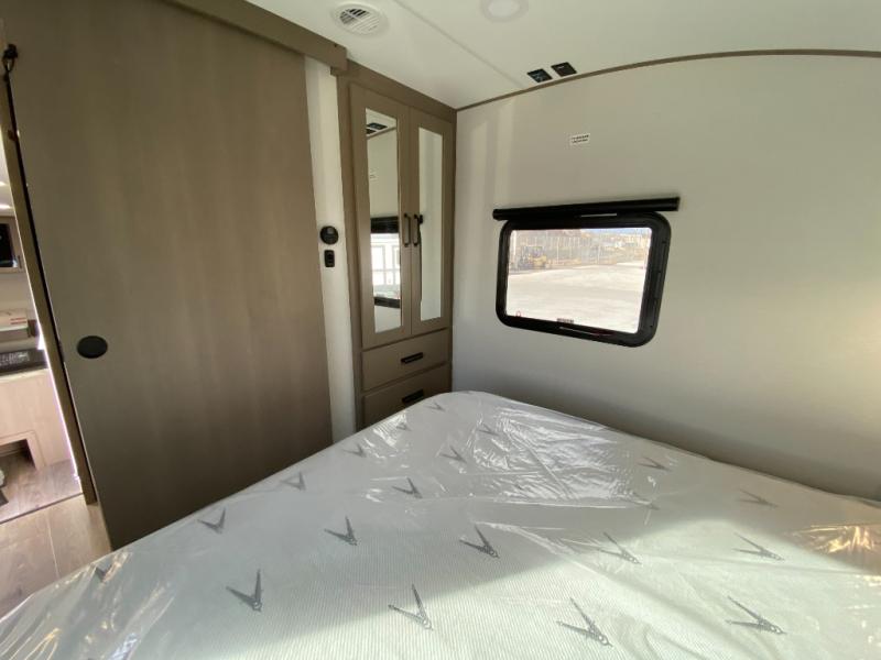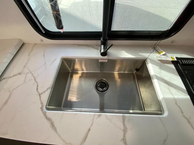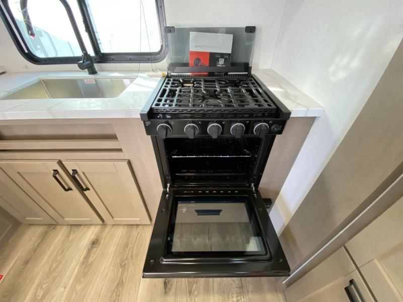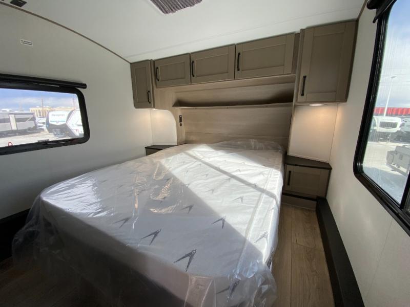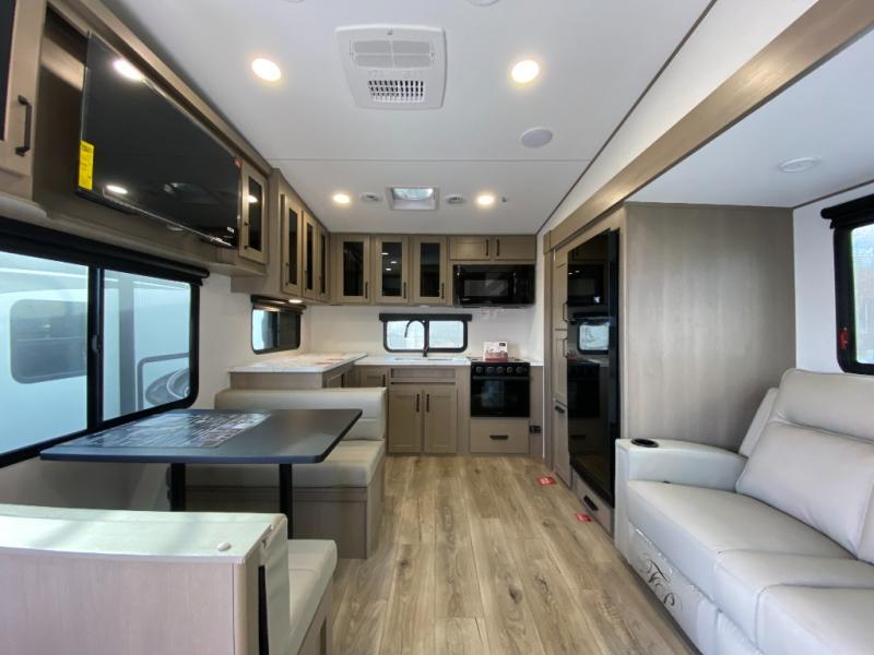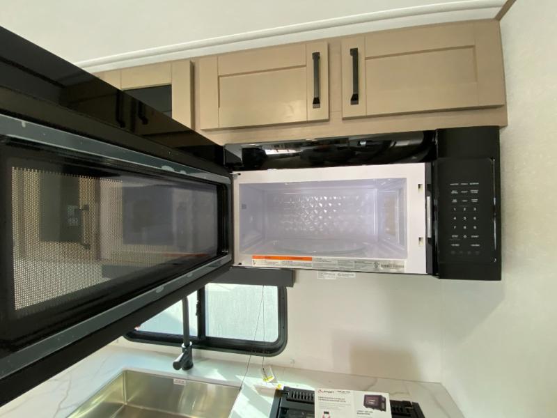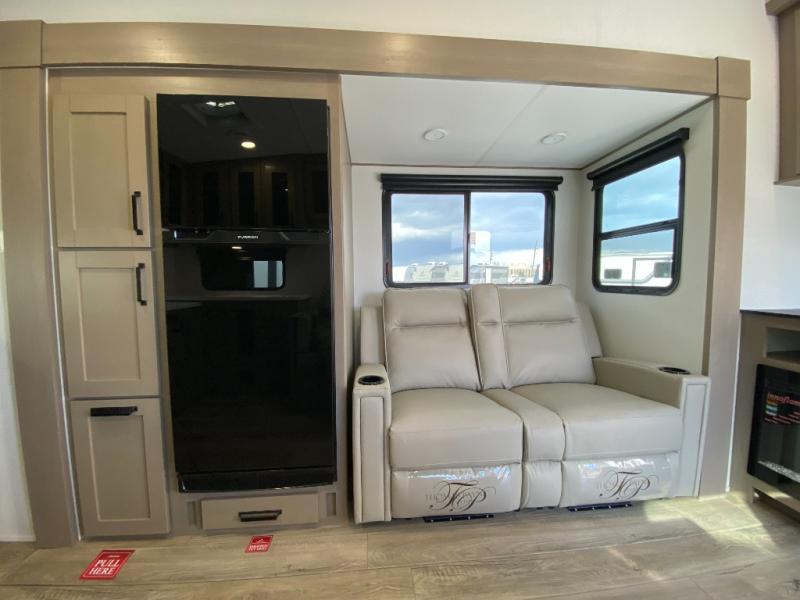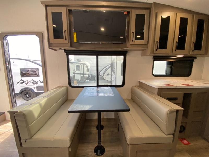 At the front of this fifth wheel, a private bedroom offers a walk-around 60" x 80" queen bed for restful comfort, complemented by dual wardrobes for convenient clothing storage. Down the hall, the full bathroom includes a 30" x 36" residential walk-in shower, a large, mirrored medicine cabinet, and linen storage for towels and toiletries. The middle living area features a cozy fireplace and booth dinette with a TV above perfect for dining while enjoying your favorite shows. Opposite, a slide-out holds the 62" theater seating for relaxing after a day of adventure, alongside a 10-cu. ft. refrigerator and pantry for all your groceries and dry goods. At the rear, an L-shaped kitchen provides generous counter space, a deep-seated stainless-steel sink, and a 30" microwave, allowing you to prepare meals comfortably without relying on campground facilities.