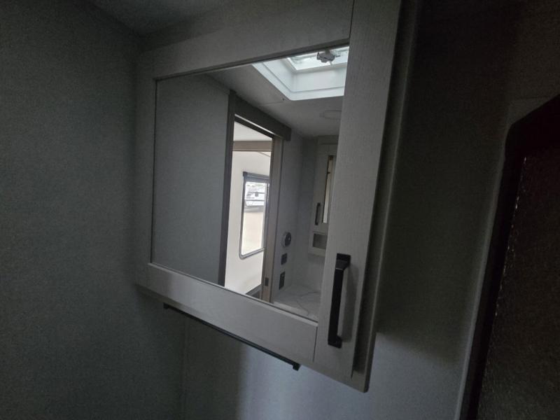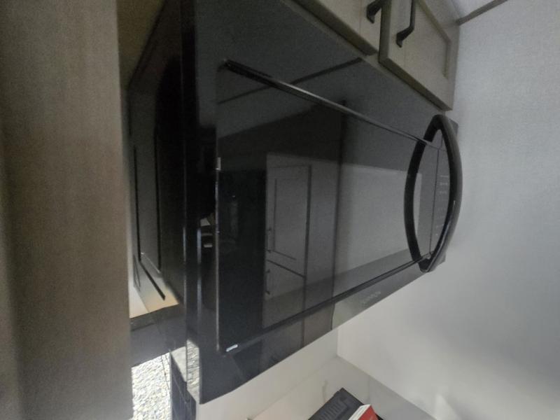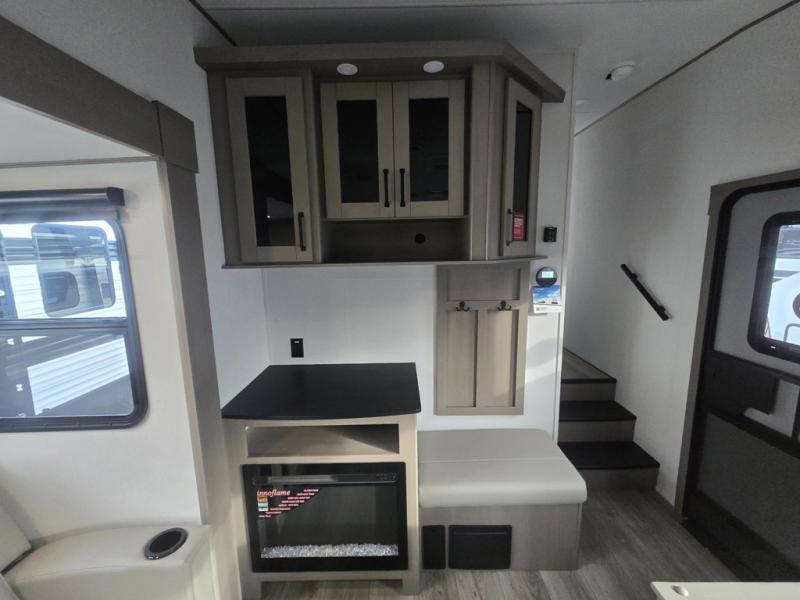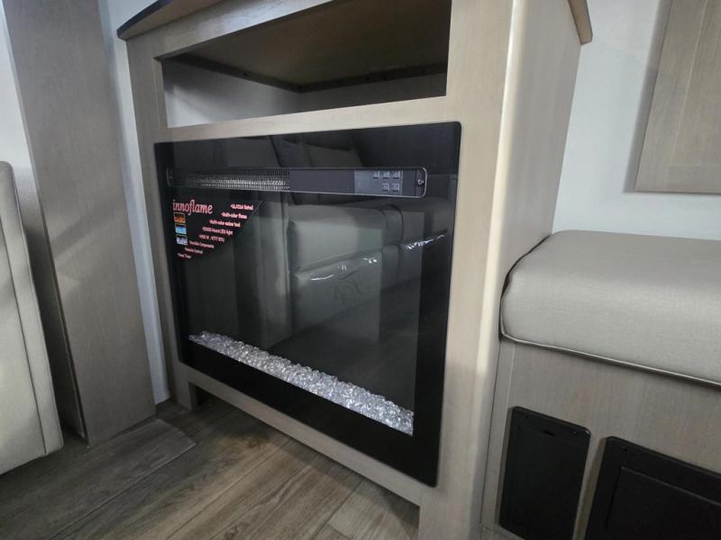 At the front of this fifth wheel, a private bedroom offers a walk-around 60" x 80" queen bed for restful comfort, complemented by dual wardrobes for convenient clothing storage. Down the hall, the full bathroom includes a 30" x 36" residential walk-in shower, a large, mirrored medicine cabinet, and linen storage for towels and toiletries. The middle living area features a cozy fireplace and booth dinette with a TV above perfect for dining while enjoying your favorite shows. Opposite, a slide-out holds the 62" theater seating for relaxing after a day of adventure, alongside a 10-cu. ft. refrigerator and pantry for all your groceries and dry goods. At the rear, an L-shaped kitchen provides generous counter space, a deep-seated stainless-steel sink, and a 30" microwave, allowing you to prepare meals comfortably without relying on campground facilities.