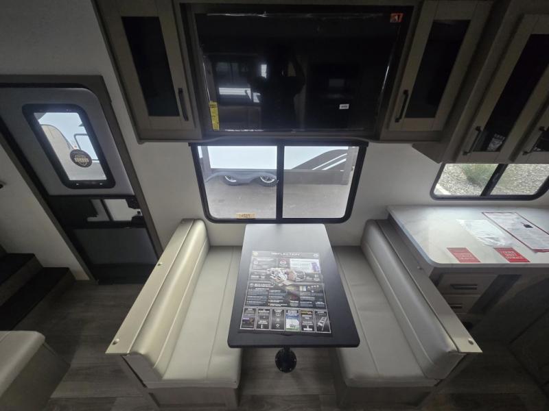 With any Reflection 150 Series fifth wheel by Grand Design, there is more available payload capacity and a broader range of half-ton trucks capable of towing this fifth wheel, and no slider hitch is needed thanks to the 90-degree turning radius which makes them short bed friendly and easier to tow. The mandatory Ultimate Power package provides a "One-Touch" automatic leveling system and a detachable power cord with LED light for easy setup, plus motion sensor pass-through lighting and entry lighting, and the Tire Linc TPMS will help you stay safe on the road. The interior offers residential cabinetry and premium Congoleum flooring, to the booth dinette and residential-style window treatment. Make your refined decision today!