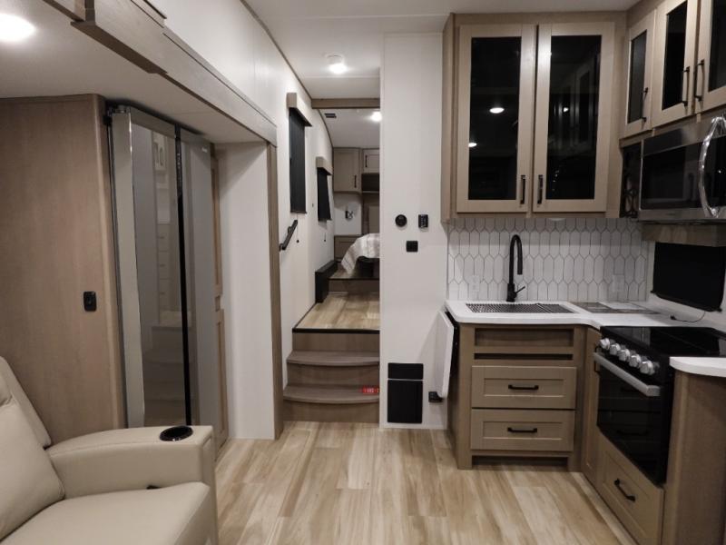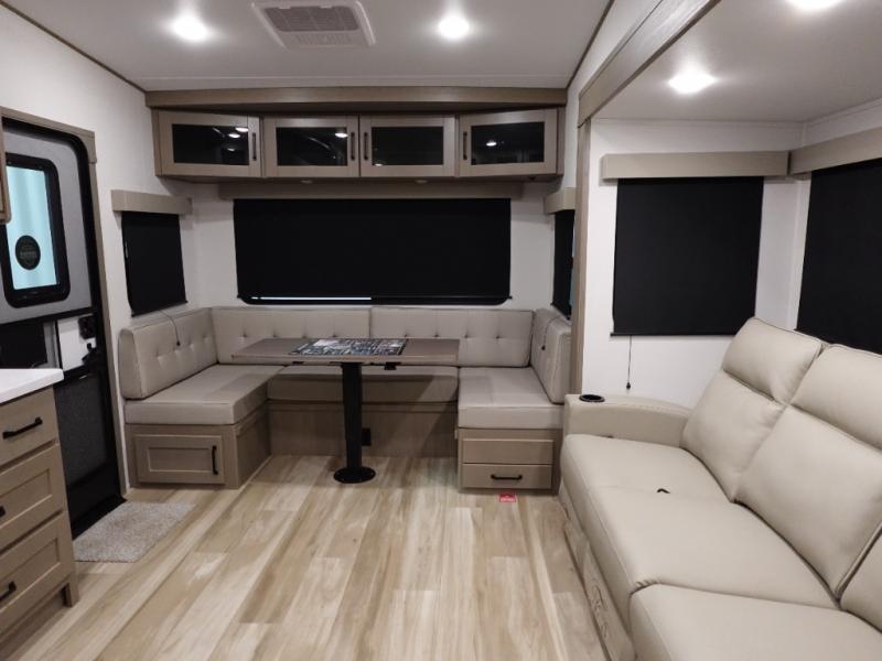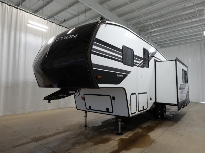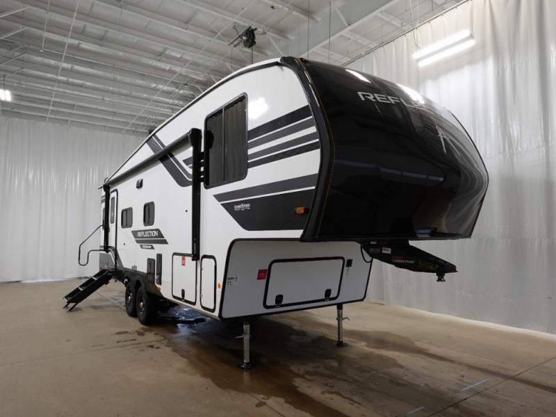 With any Reflection 150 Series fifth wheel by Grand Design, there is more available payload capacity and a broader range of half-ton trucks capable of towing this fifth wheel, and no slider hitch is needed thanks to the 90-degree turning radius which makes them short bed friendly and easier to tow. The mandatory Ultimate Power package provides a "One-Touch" automatic leveling system and a detachable power cord with LED light for easy setup, plus motion sensor pass-through lighting and entry lighting, and the Tire Linc TPMS will help you stay safe on the road. The interior offers residential luxury from the cabinetry and premium Congoleum flooring, to the booth dinette and residential-style window treatment. Make your refined decision today!