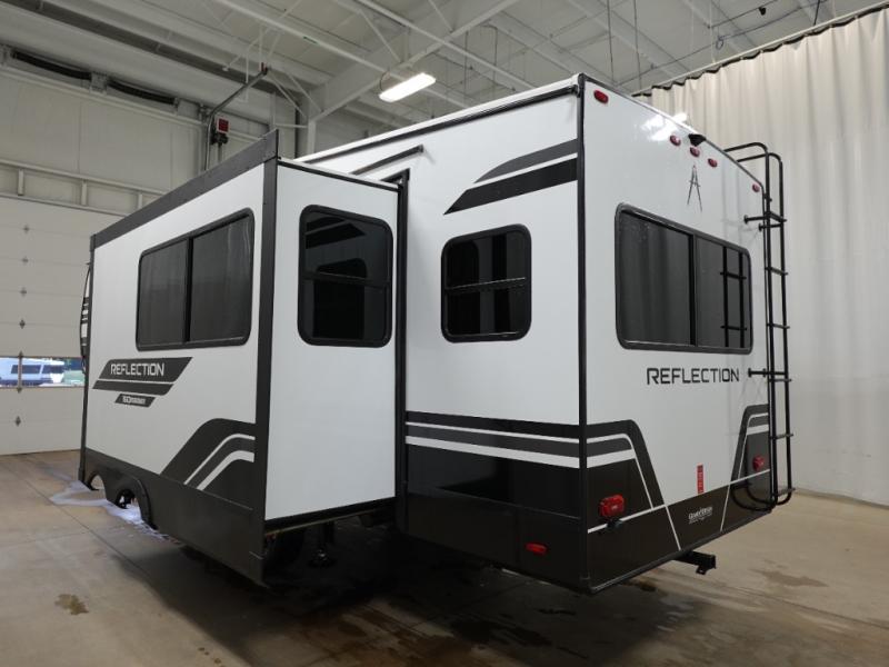 Feel right at home in this Reflection 150 Series with a private bedroom that includes a walk-around queen bed with storage on each side, windows, and a space savings sliding door. The full bathroom offers a walk-in shower, storage for your linens and a sliding door for easy access. When you get hungry, the cook will have an L-shaped kitchen area to make meals, plus full amenities including a 30" microwave, a flip-up counter extension, a pantry for your dry goods and a 16 cu. ft. refrigerator to store lots of food and cold beverages. You can dine at the rear U-shaped dinette lounge and enjoy the view out of all the windows or outside under the 18' electric awning. And the 78" theatre seating will be a nice place to relax and watch the 40" LED HDTV.