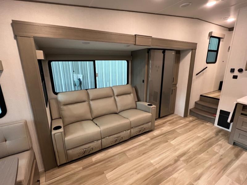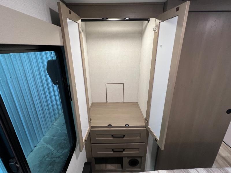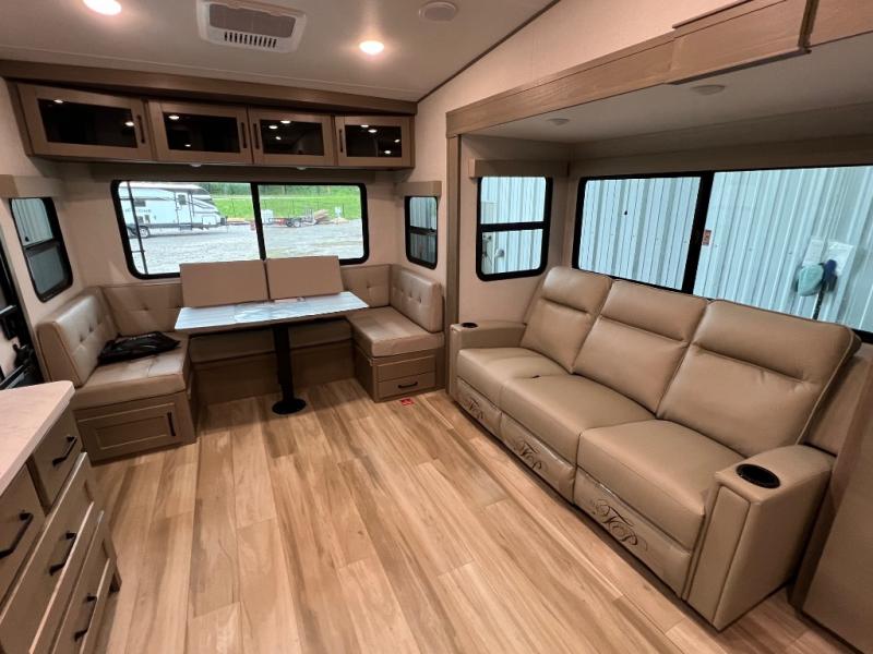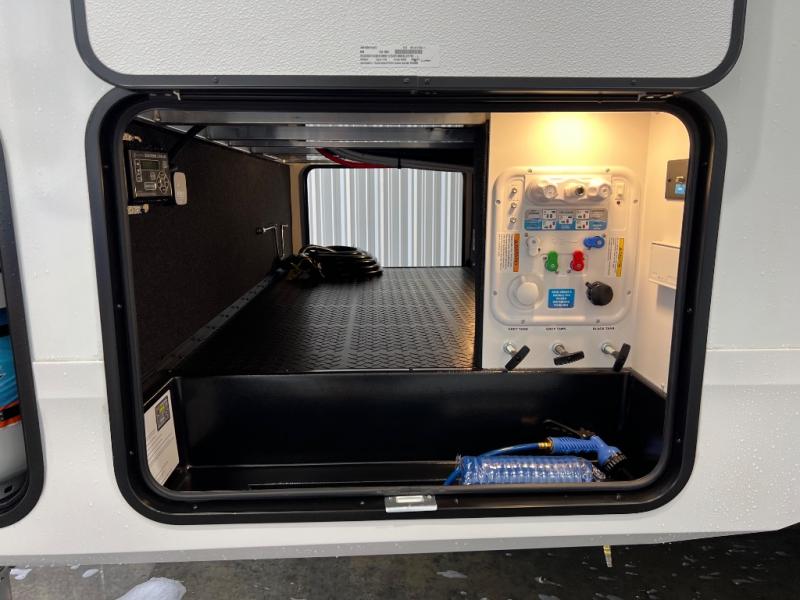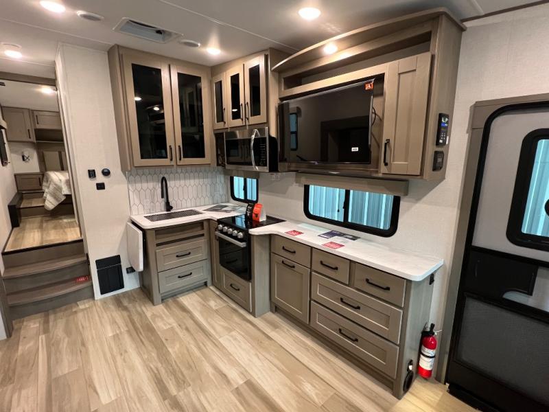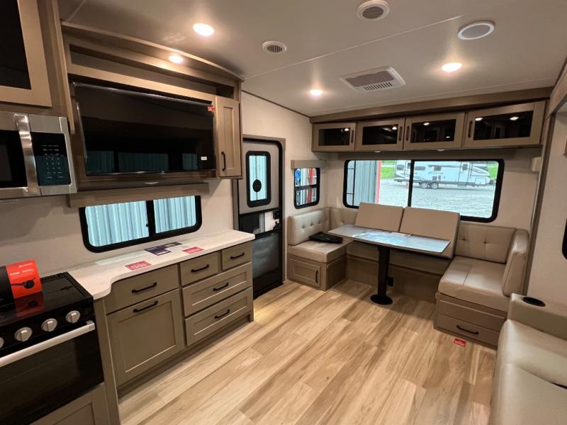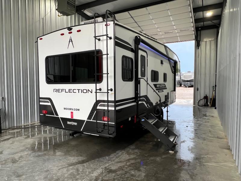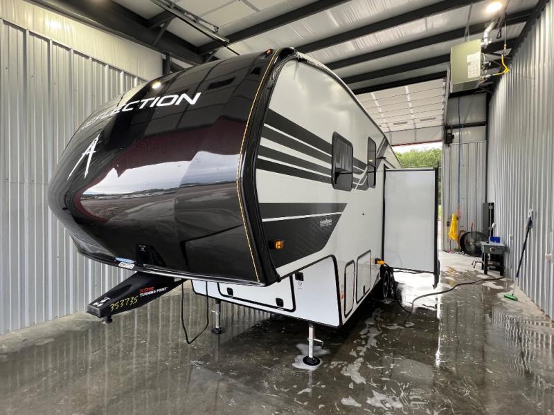 With any Reflection 150 Series fifth wheel by Grand Design, there is more available payload capacity and a broader range of half-ton trucks capable of towing this fifth wheel, and no slider hitch is needed thanks to the 90-degree turning radius which makes them short bed friendly and easier to tow. The mandatory Ultimate Power package provides a "One-Touch" automatic leveling system and a detachable power cord with LED light for easy setup, plus motion sensor pass-through lighting and entry lighting, and the Tire Linc TPMS will help you stay safe on the road. The interior offers residential luxury from the cabinetry and premium Congoleum flooring, to the booth dinette and residential-style window treatment. Make your refined decision today!