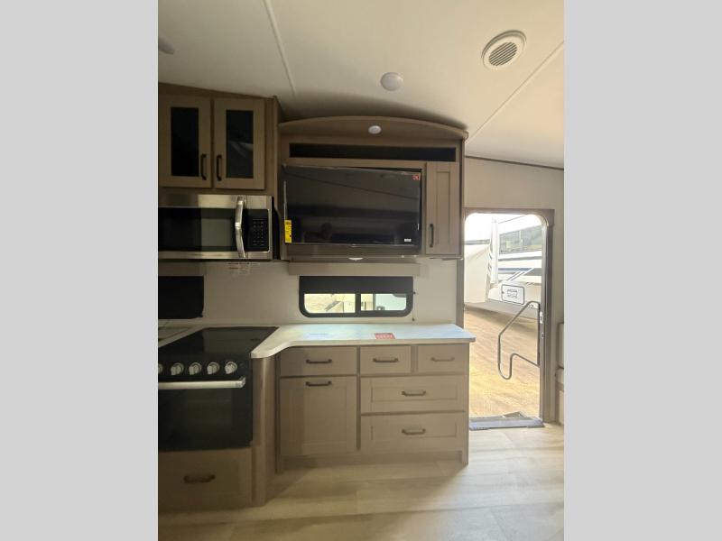 Feel right at home in this Reflection 150 Series with a private bedroom that includes a walk-around queen bed with storage on each side, windows, and a space savings sliding door. The full bathroom offers a walk-in shower, storage for your linens and a sliding door for easy access. When you get hungry, the cook will have an L-shaped kitchen area to make meals, plus full amenities including a 30" microwave, a flip-up counter extension, a pantry for your dry goods and a 16 cu. ft. refrigerator to store lots of food and cold beverages. You can dine at the rear U-shaped dinette lounge and enjoy the view out of all the windows or outside under the 18' electric awning. And the 78" theatre seating will be a nice place to relax and watch the 40" LED HDTV.