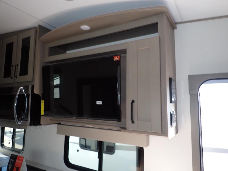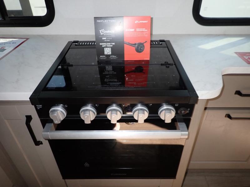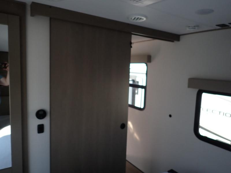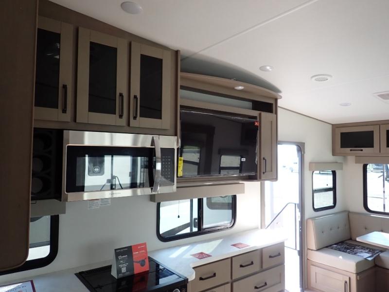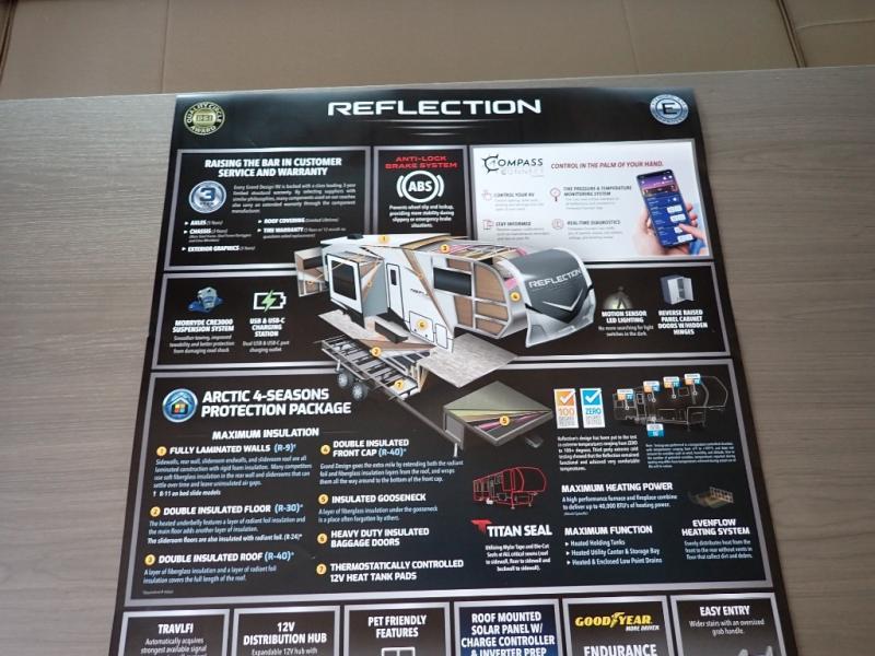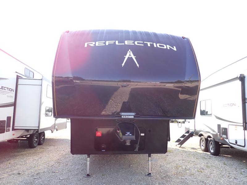 Feel right at home in this Reflection 150 Series with a private bedroom that includes a walk-around queen bed with storage on each side, windows, and a space savings sliding door. The full bathroom offers a walk-in shower, storage for your linens and a sliding door for easy access. When you get hungry, the cook will have an L-shaped kitchen area to make meals, plus full amenities including a 30" microwave, a flip-up counter extension, a pantry for your dry goods and a 16 cu. ft. refrigerator to store lots of food and cold beverages. You can dine at the rear U-shaped dinette lounge and enjoy the view out of all the windows or outside under the 18' electric awning. And the 78" theatre seating will be a nice place to relax and watch the 40" LED HDTV.