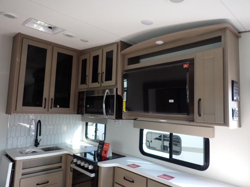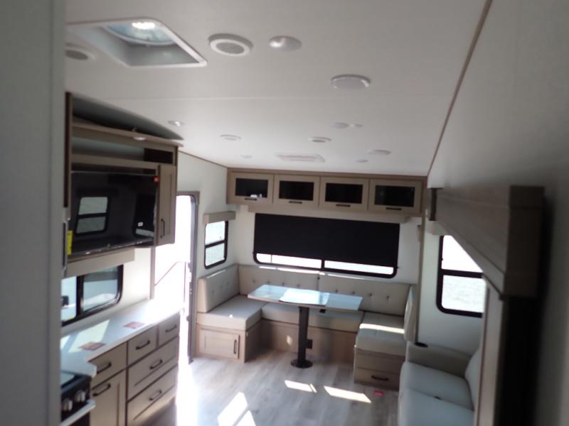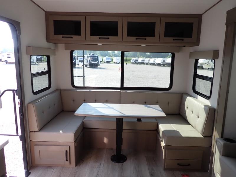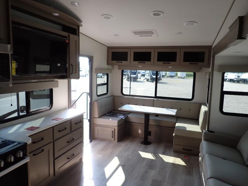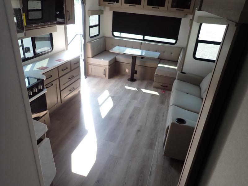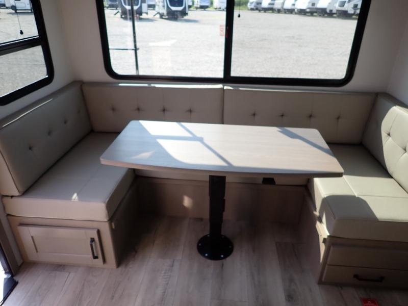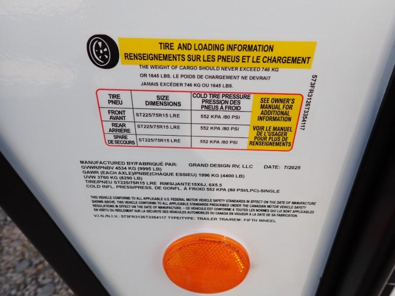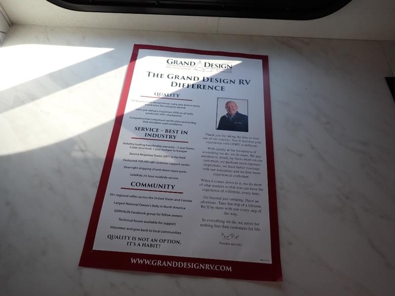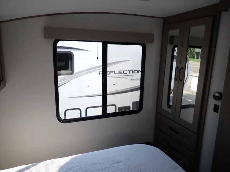 With any Reflection 150 Series fifth wheel by Grand Design, there is more available payload capacity and a broader range of half-ton trucks capable of towing this fifth wheel, and no slider hitch is needed thanks to the 90-degree turning radius which makes them short bed friendly and easier to tow. The mandatory Ultimate Power package provides a "One-Touch" automatic leveling system and a detachable power cord with LED light for easy setup, plus motion sensor pass-through lighting and entry lighting, and the Tire Linc TPMS will help you stay safe on the road. The interior offers residential luxury from the cabinetry and premium Congoleum flooring, to the booth dinette and residential-style window treatment. Make your refined decision today!