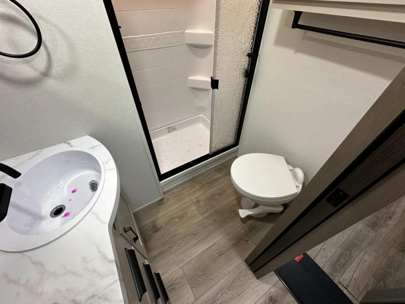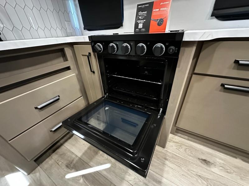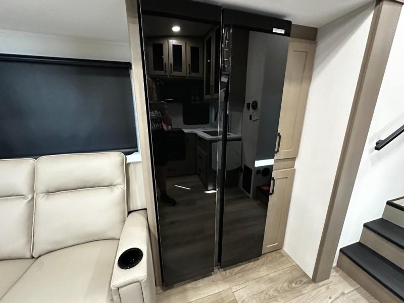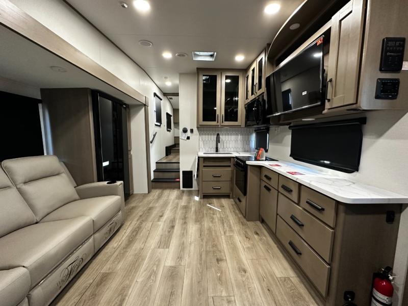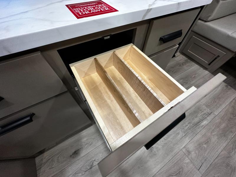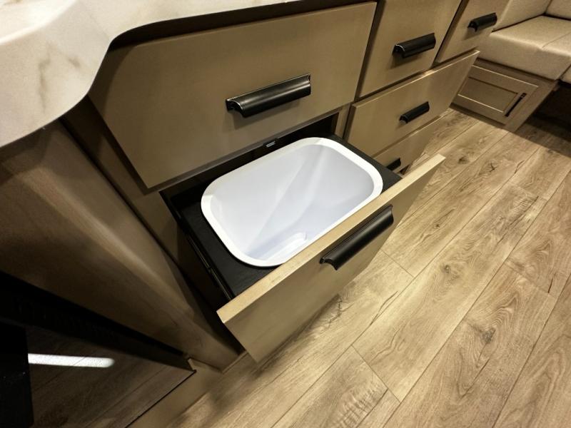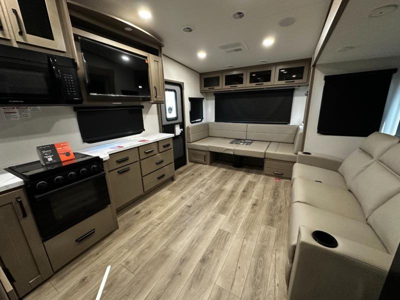 The rear kitchen layout offers maximum functionality in a compact footprint. Solid-surface countertops, a three-burner cooktop, microwave, and residential-style refrigerator make meal preparation simple and enjoyable. Ample cabinetry ensures convenient storage for kitchen essentials, while the dinette provides a comfortable space for dining, working, or relaxing.
