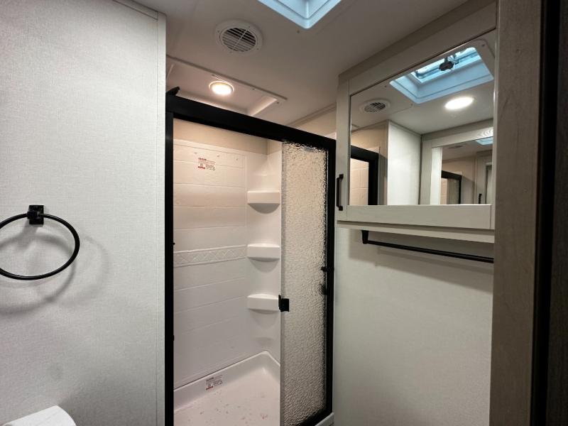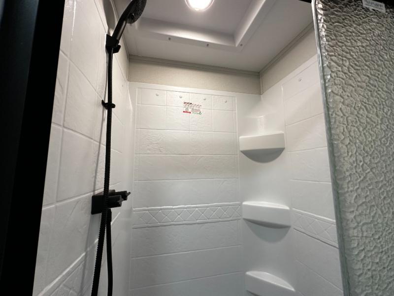 The front master suite is designed for rest and privacy, featuring a walk-around queen bed, dual wardrobes, and overhead storage. The full bathroom includes a spacious shower, vanity, and practical storage, providing residential-style comfort while on the road.