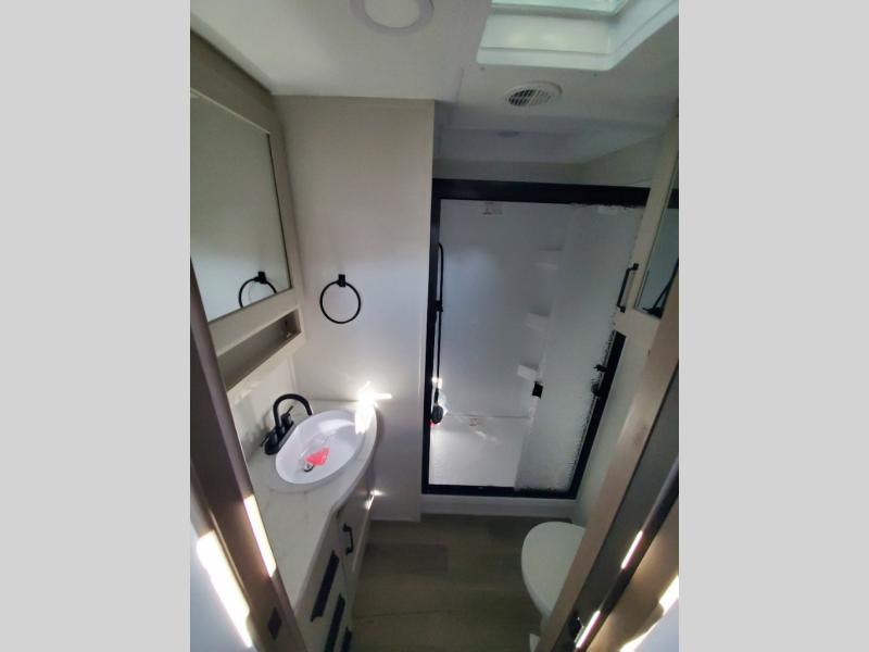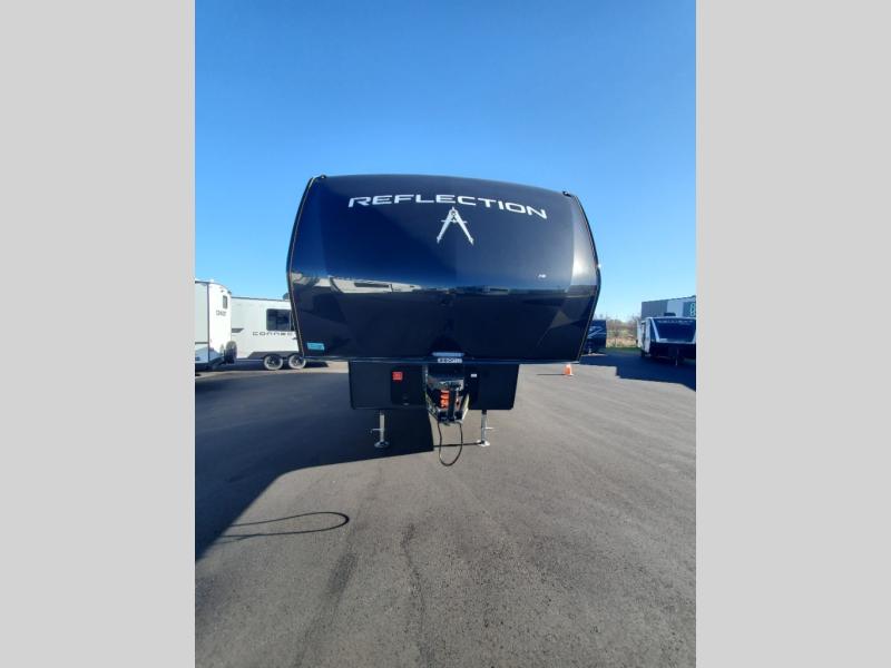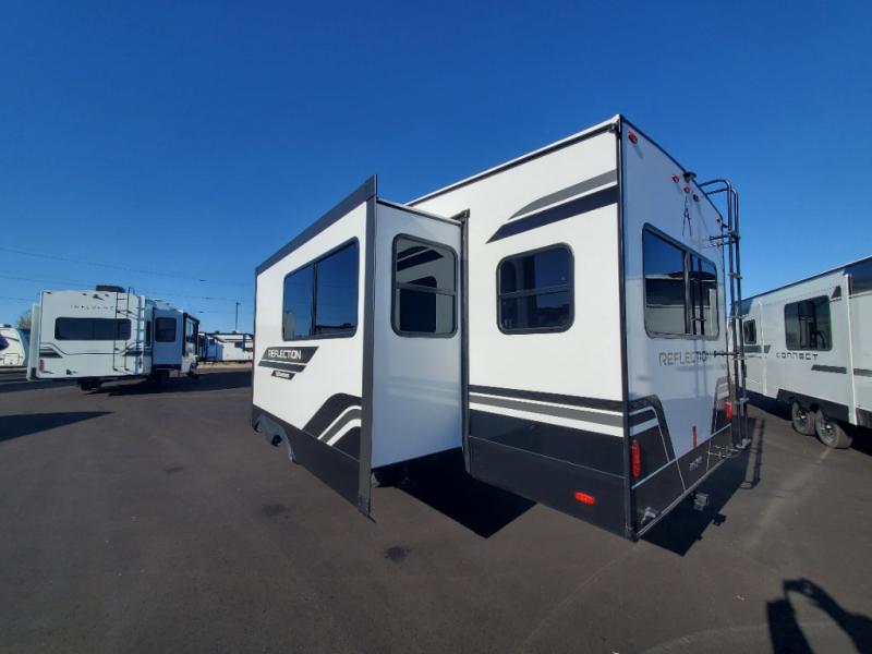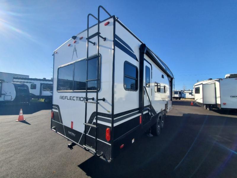 Feel right at home in this Reflection 150 Series with a private bedroom that includes a walk-around queen bed with storage on each side, windows, and a space savings sliding door. The full bathroom offers a walk-in shower, storage for your linens and a sliding door for easy access. When you get hungry, the cook will have an L-shaped kitchen area to make meals, plus full amenities including a 30" microwave, a flip-up counter extension, a pantry for your dry goods and a 16 cu. ft. refrigerator to store lots of food and cold beverages. You can dine at the rear U-shaped dinette lounge and enjoy the view out of all the windows or outside under the 18' electric awning. And the 78" theatre seating will be a nice place to relax and watch the 40" LED HDTV.