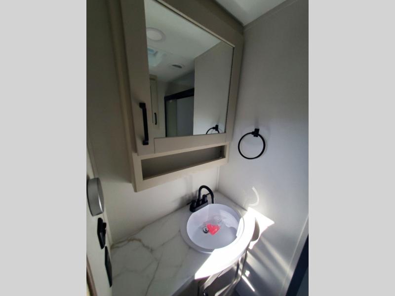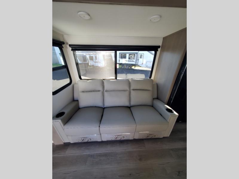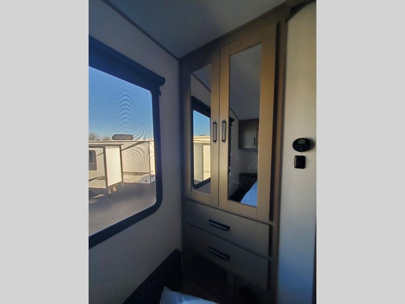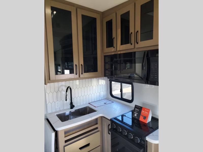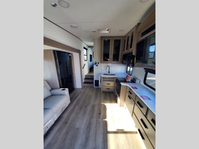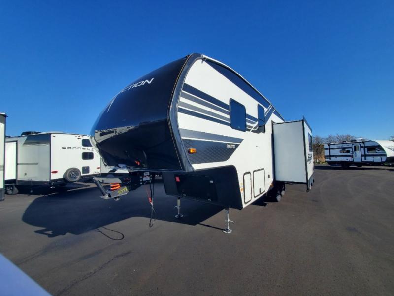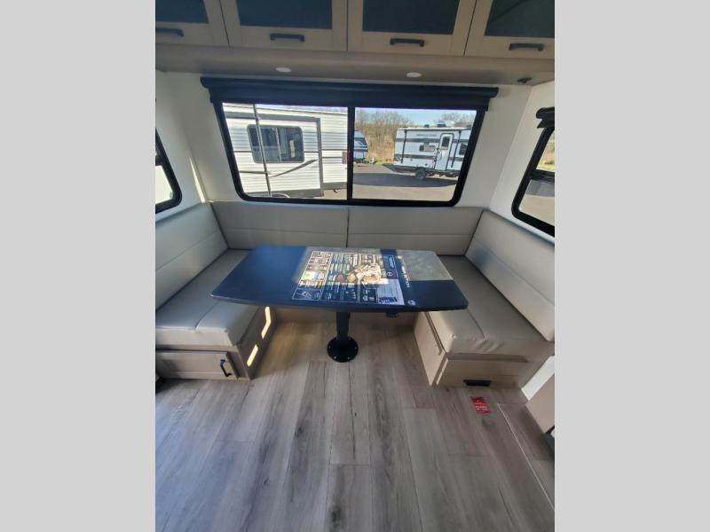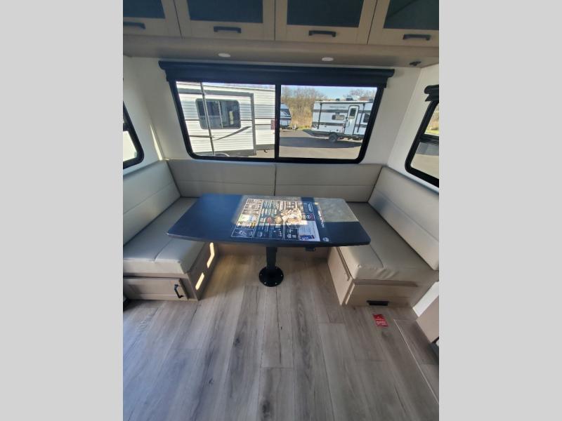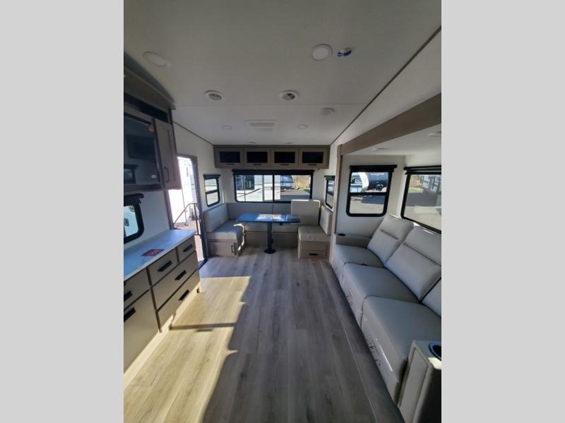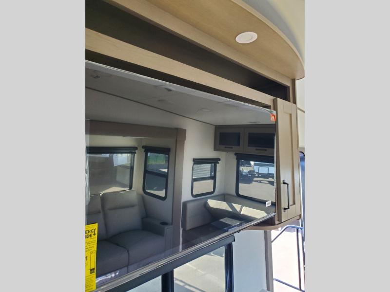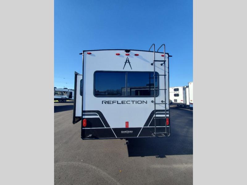 With any Reflection 150 Series fifth wheel by Grand Design, there is more available payload capacity and a broader range of half-ton trucks capable of towing this fifth wheel, and no slider hitch is needed thanks to the 90-degree turning radius which makes them short bed friendly and easier to tow. The mandatory Ultimate Power package provides a "One-Touch" automatic leveling system and a detachable power cord with LED light for easy setup, plus motion sensor pass-through lighting and entry lighting, and the Tire Linc TPMS will help you stay safe on the road. The interior offers residential luxury from the cabinetry and premium Congoleum flooring, to the booth dinette and residential-style window treatment. Make your refined decision today!