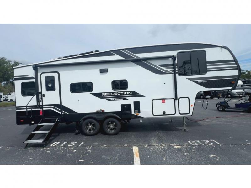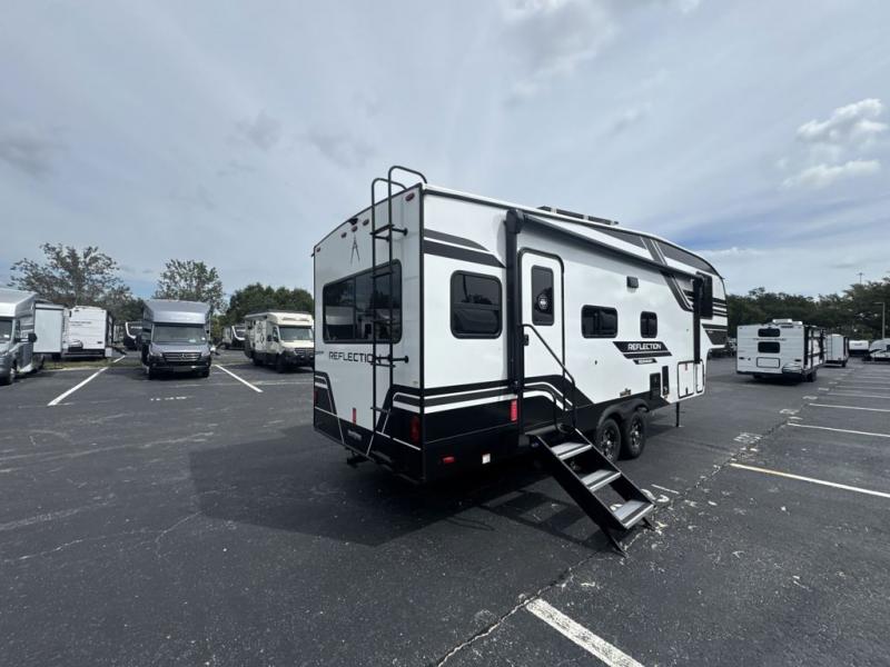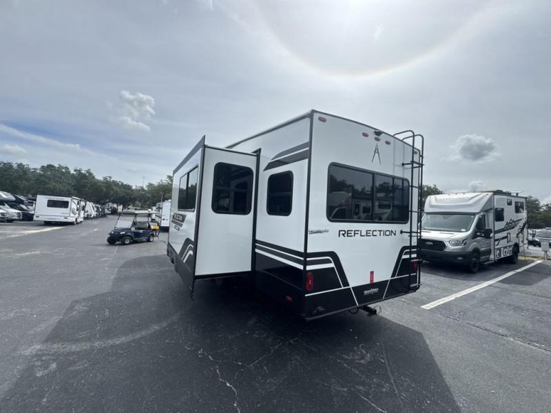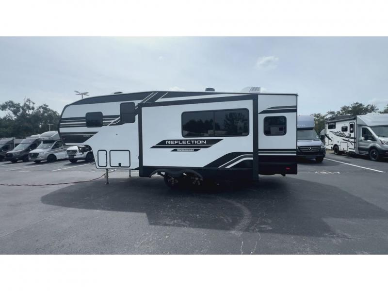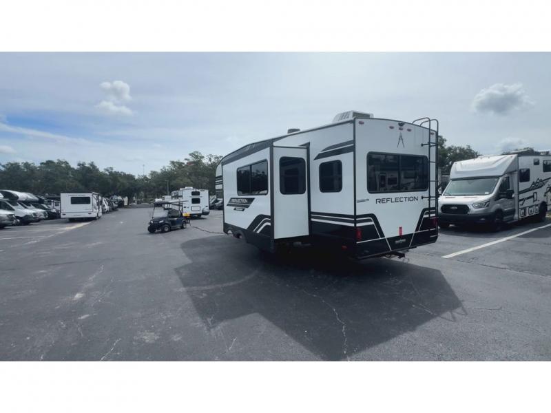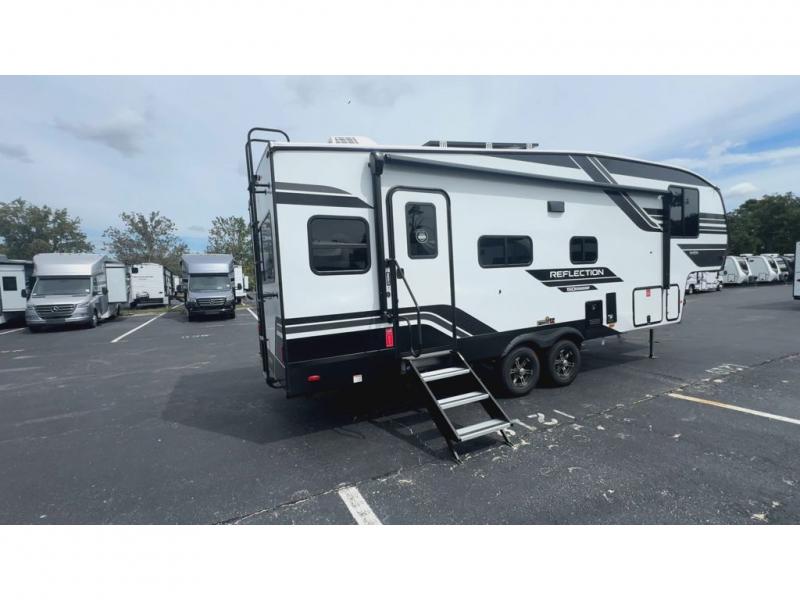 Feel right at home in this Reflection 150 Series with a private bedroom that includes a walk-around queen bed with storage on each side, windows, and a space savings sliding door. The full bathroom offers a walk-in shower, storage for your linens and a sliding door for easy access. When you get hungry, the cook will have an L-shaped kitchen area to make meals, plus full amenities including a 30" microwave, a flip-up counter extension, a pantry for your dry goods and a 16 cu. ft. refrigerator to store lots of food and cold beverages. You can dine at the rear U-shaped dinette lounge and enjoy the view out of all the windows or outside under the 18' electric awning. And the 78" theatre seating will be a nice place to relax and watch the 40" LED HDTV.
