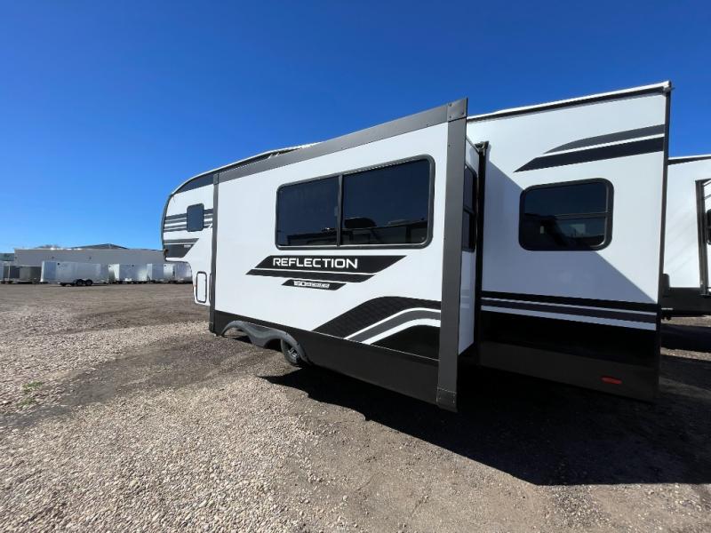 Feel right at home in this Reflection 150 Series with a private bedroom that includes a walk-around queen bed with storage on each side, windows, and a space savings sliding door. The full bathroom offers a walk-in shower, storage for your linens and a sliding door for easy access. When you get hungry, the cook will have an L-shaped kitchen area to make meals, plus full amenities including a 30" microwave, a flip-up counter extension, a pantry for your dry goods and a 16 cu. ft. refrigerator to store lots of food and cold beverages. You can dine at the rear U-shaped dinette lounge and enjoy the view out of all the windows or outside under the 18' electric awning. And the 78" theatre seating will be a nice place to relax and watch the 40" LED HDTV.
