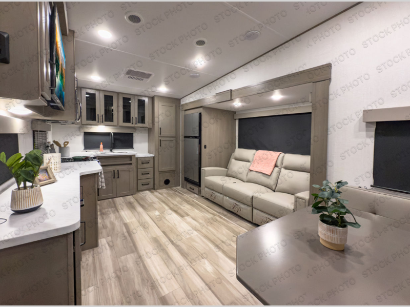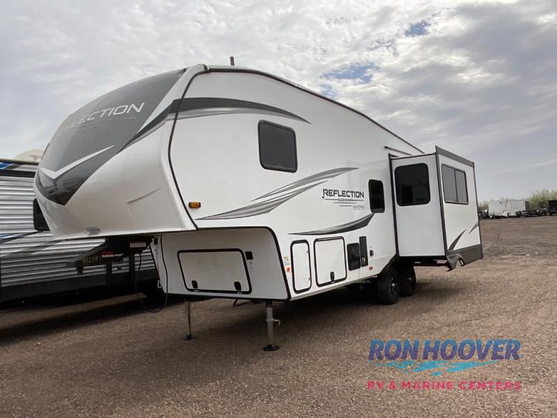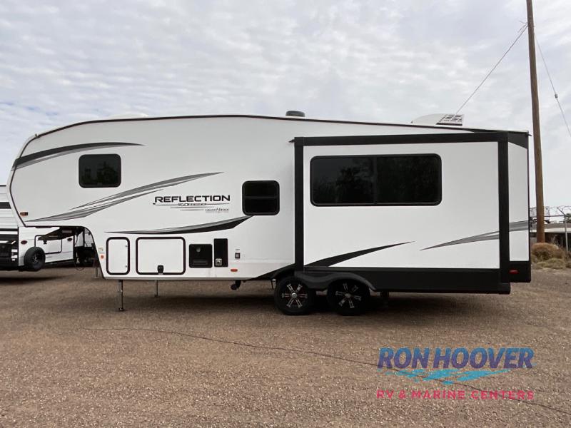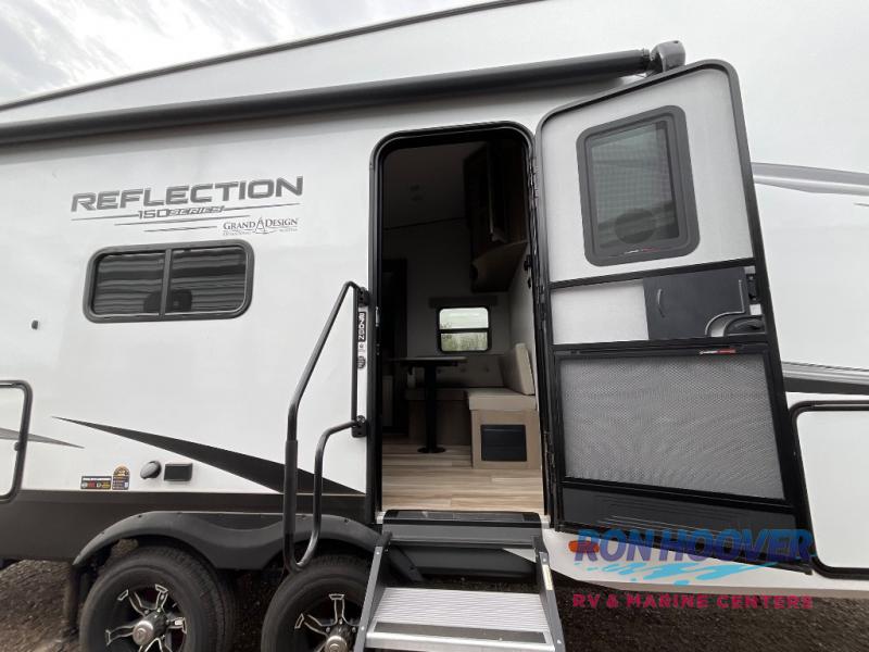 With any Reflection 150 Series fifth wheel by Grand Design, there is more available payload capacity and a broader range of half-ton trucks capable of towing this fifth wheel, and no slider hitch is needed thanks to the 90-degree turning radius which makes them short bed friendly and easier to tow. The mandatory Ultimate Power package provides a "One-Touch" automatic leveling system and a detachable power cord with LED light for easy setup, plus motion sensor pass-through lighting and entry lighting, and the Tire Linc TPMS will help you stay safe on the road. The interior offers residential luxury from the cabinetry and premium Congoleum flooring, to the booth dinette and residential-style window treatment. Make your refined decision today!