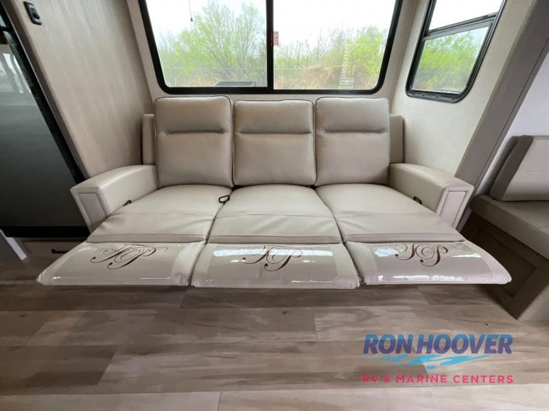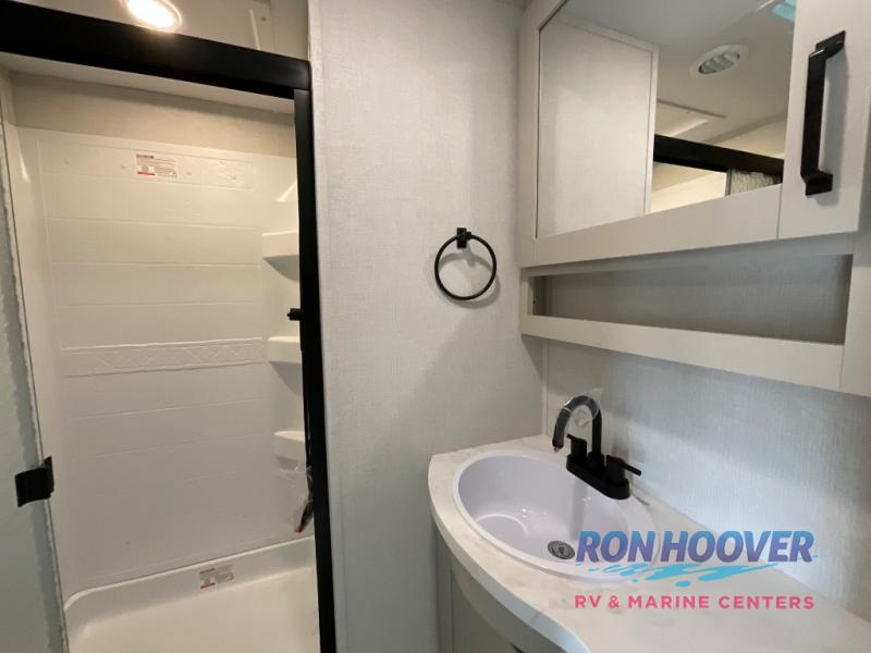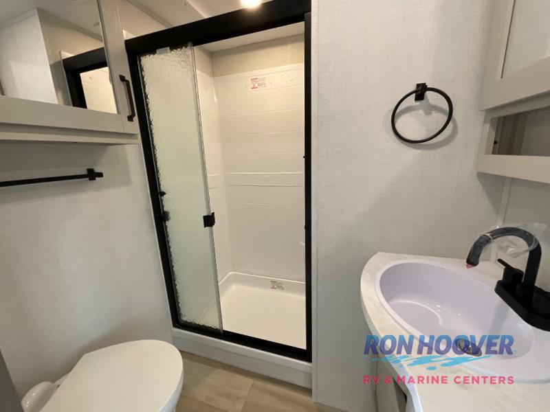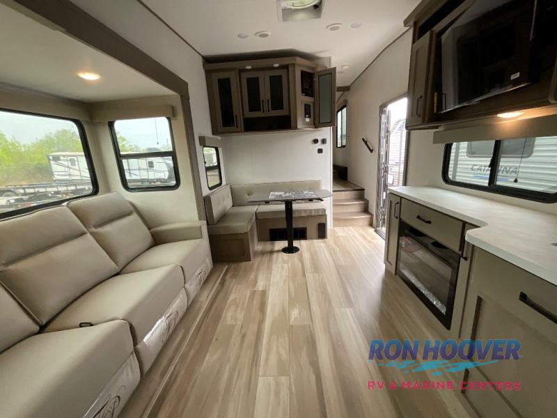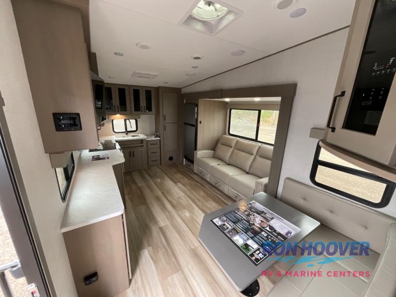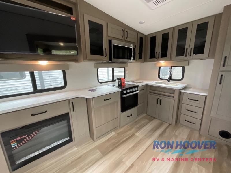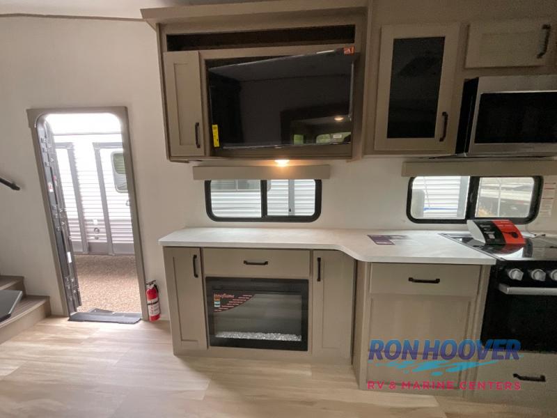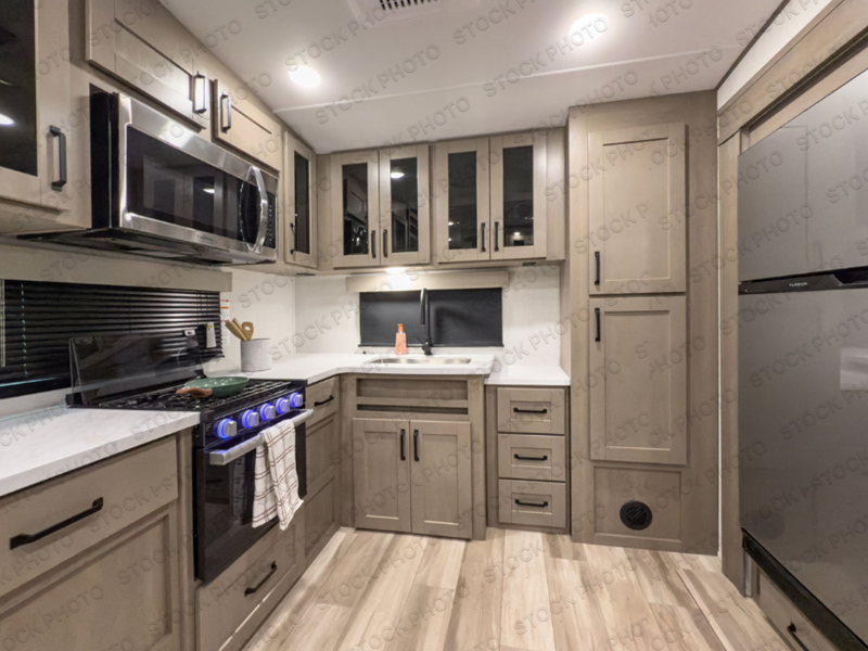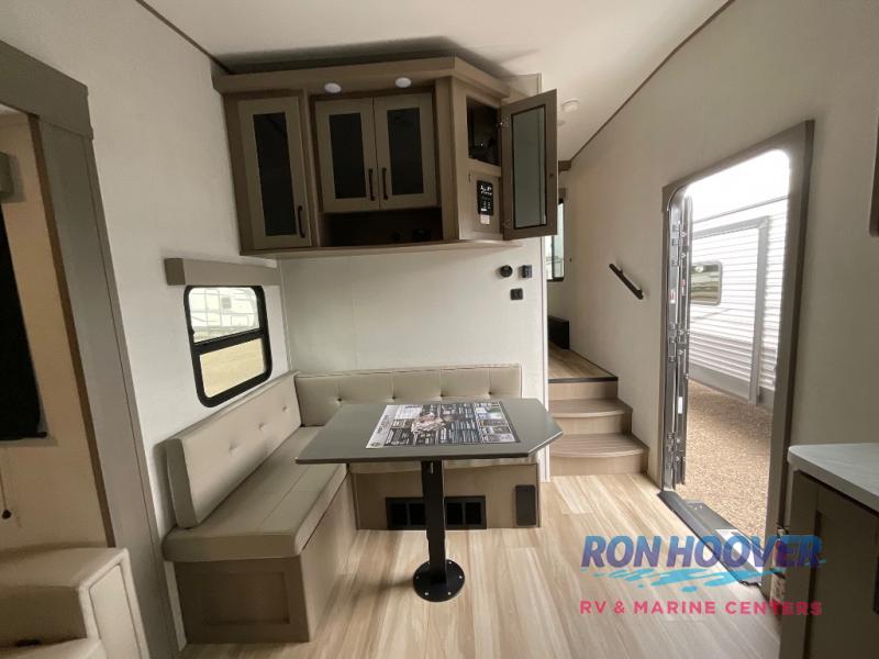 You will love this fifth wheel featuring a single slide for added interior living space and all the comforts and conveniences it provides you while you travel. The slide features a 78" theater seat plus there is a breakfast nook for more seating. Both can easily view the entertainment center with 40" TV. A rear kitchen indoors provides everything you need to create meals like home while on the road, and if you want to spend as much time outside as possible, then the outdoor griddle will certainly accommodate you for meals. Up front, a cozy private bedroom with queen bed, wardrobe, and overhead cabinets. Right next door, you will find a large walk-in shower, as well as a toilet, and a vanity with sink and linen cabinet for your towels and toiletries. You will also love the full unobstructed pass-through compartment for all of your gear, plus so much more!