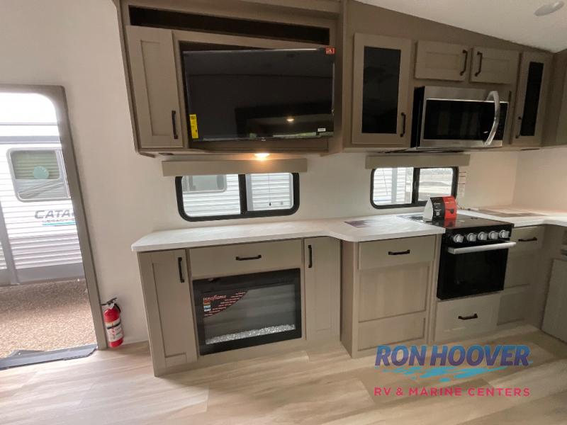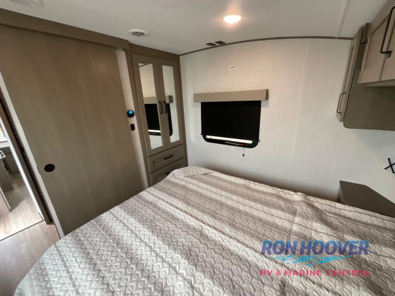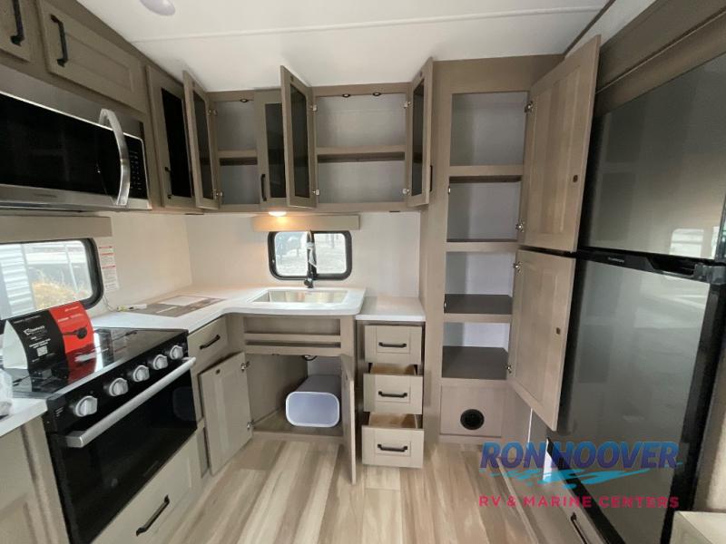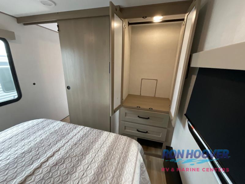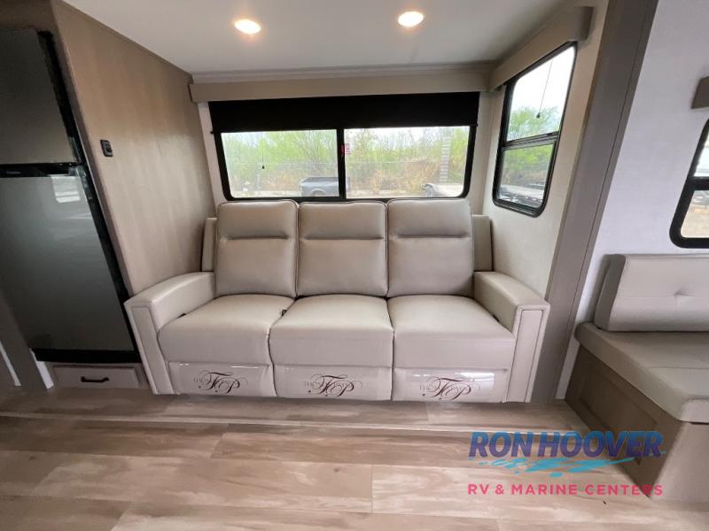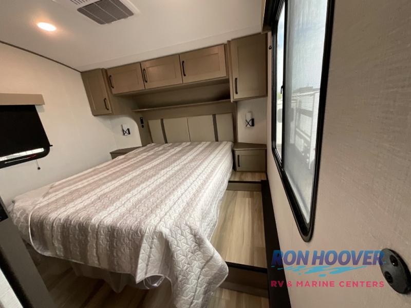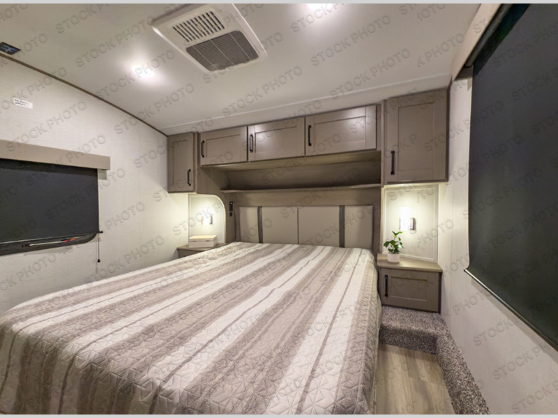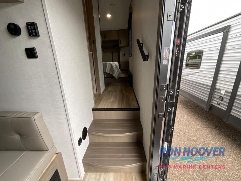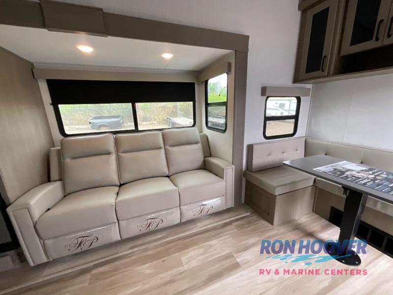 You will love this fifth wheel featuring a single slide for added interior living space and all the comforts and conveniences it provides you while you travel. The slide features a 78" theater seat plus there is a breakfast nook for more seating. Both can easily view the entertainment center with 40" TV. A rear kitchen indoors provides everything you need to create meals like home while on the road, and if you want to spend as much time outside as possible, then the outdoor griddle will certainly accommodate you for meals. Up front, a cozy private bedroom with queen bed, wardrobe, and overhead cabinets. Right next door, you will find a large walk-in shower, as well as a toilet, and a vanity with sink and linen cabinet for your towels and toiletries. You will also love the full unobstructed pass-through compartment for all of your gear, plus so much more!