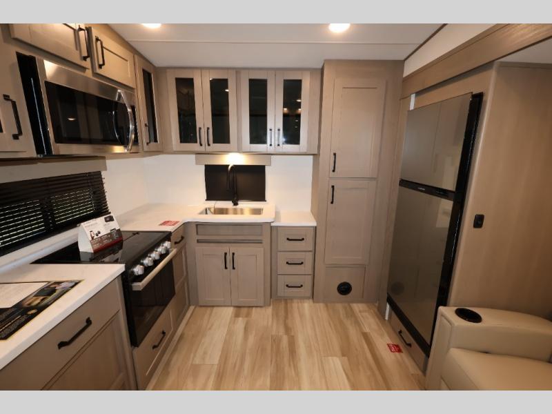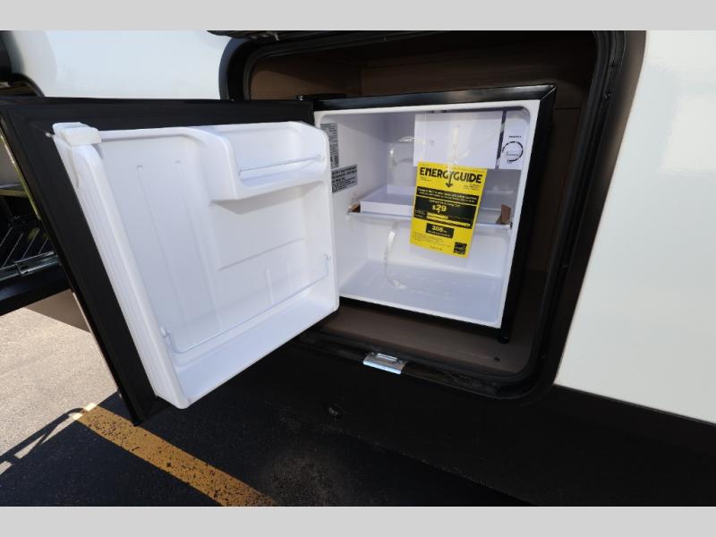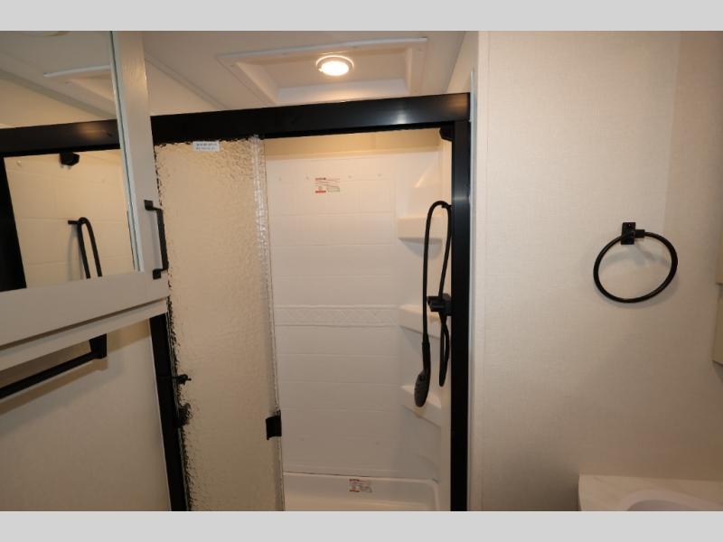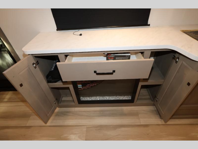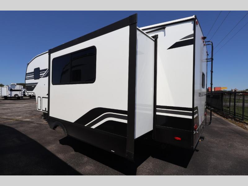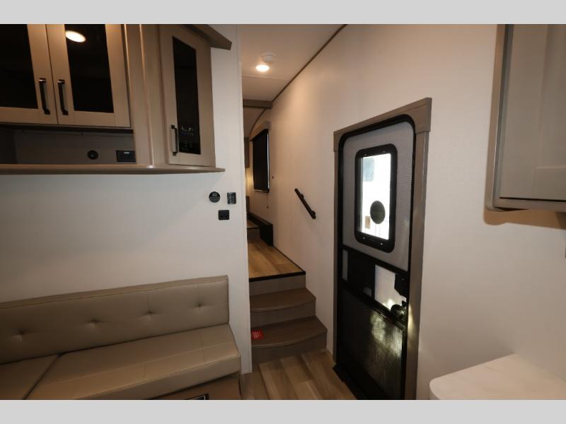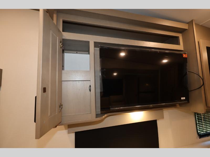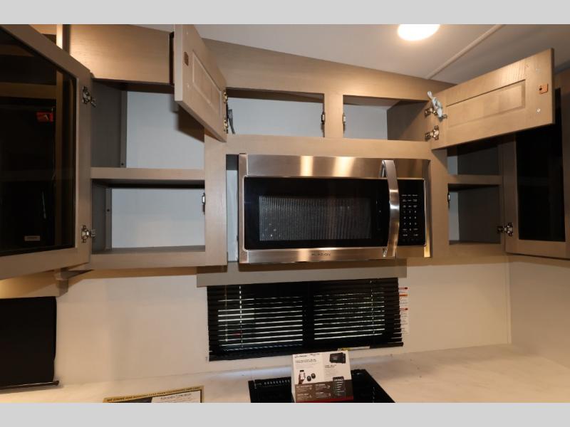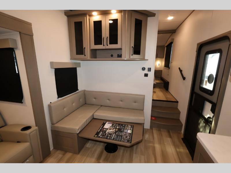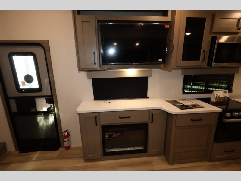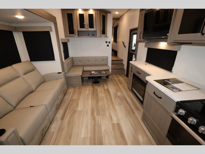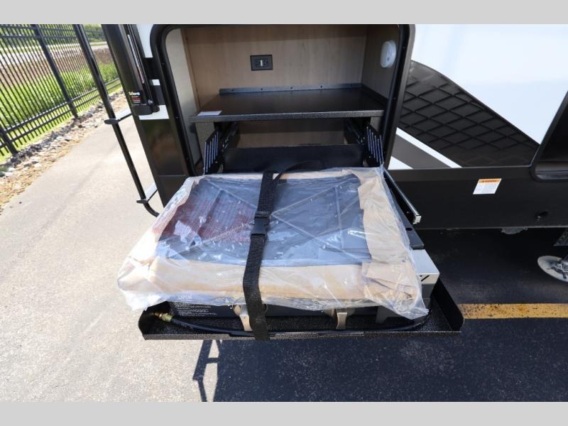 You will love this fifth wheel featuring a single slide for added interior living space and all the comforts and conveniences it provides you while you travel. The slide features a 78" theater seat plus there is a breakfast nook for more seating. Both can easily view the entertainment center with 40" TV. A rear kitchen indoors provides everything you need to create meals like home while on the road, and if you want to spend as much time outside as possible, then the outdoor griddle will certainly accommodate you for meals. Up front, a cozy private bedroom with queen bed, wardrobe, and overhead cabinets. Right next door, you will find a large walk-in shower, as well as a toilet, and a vanity with sink and linen cabinet for your towels and toiletries. You will also love the full unobstructed pass-through compartment for all of your gear, plus so much more!