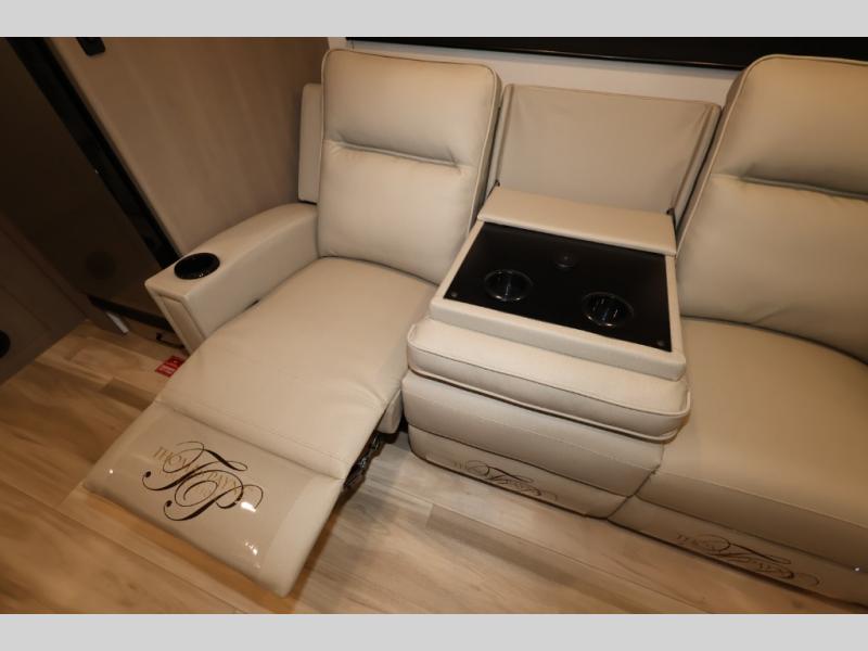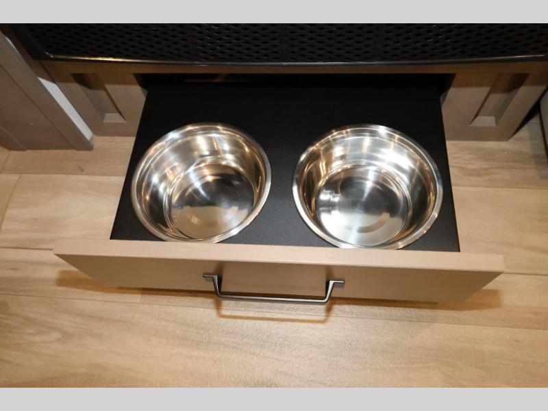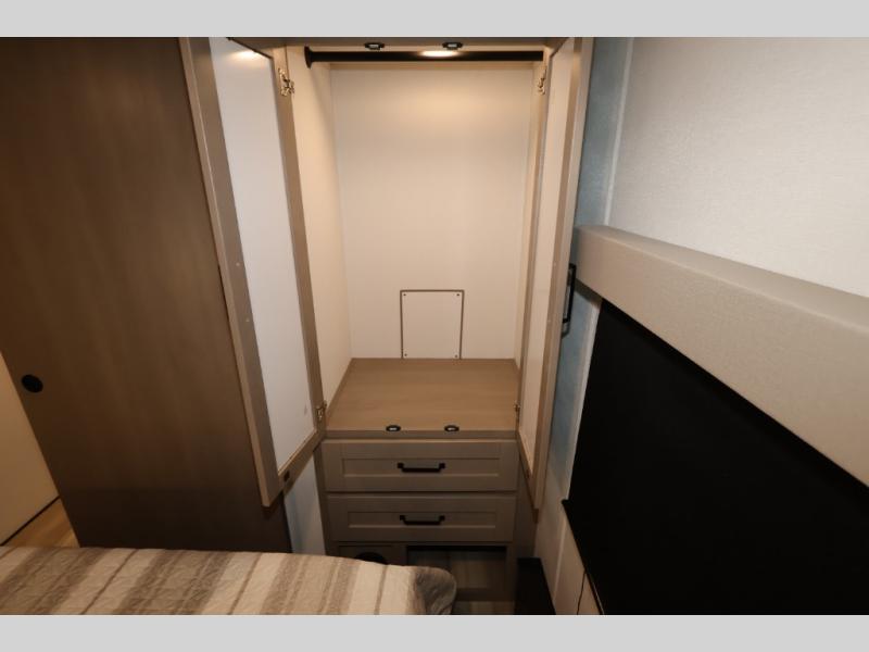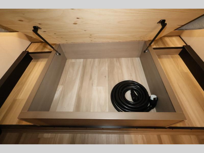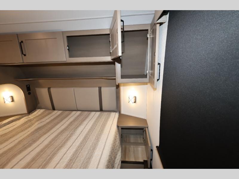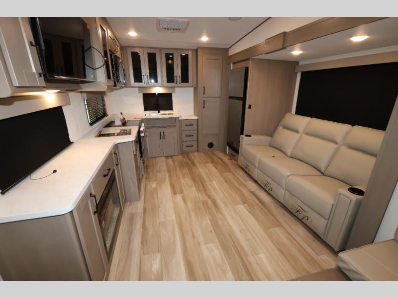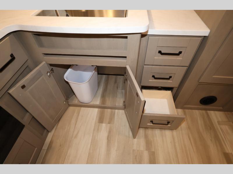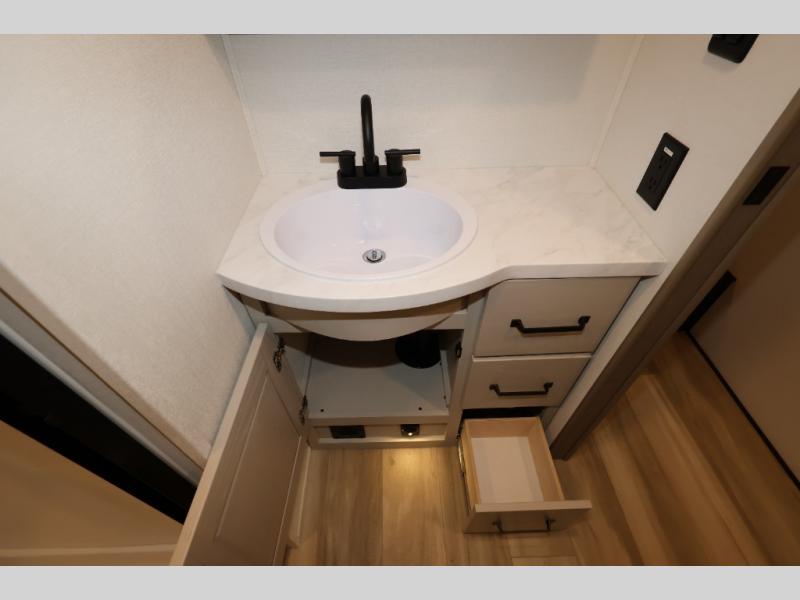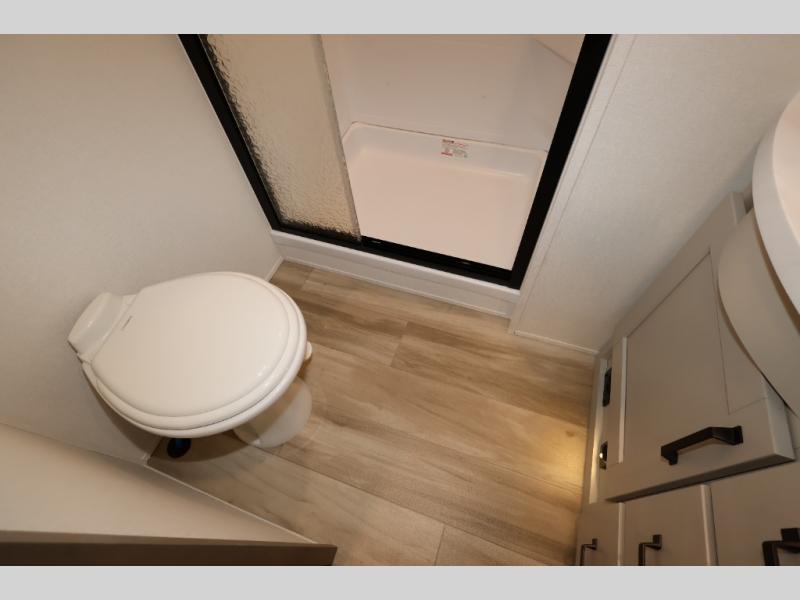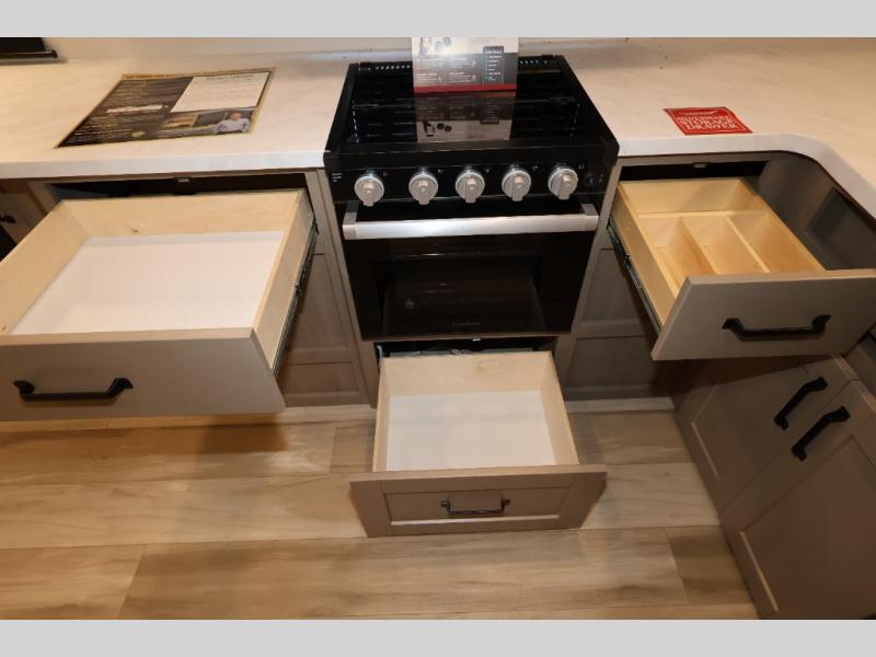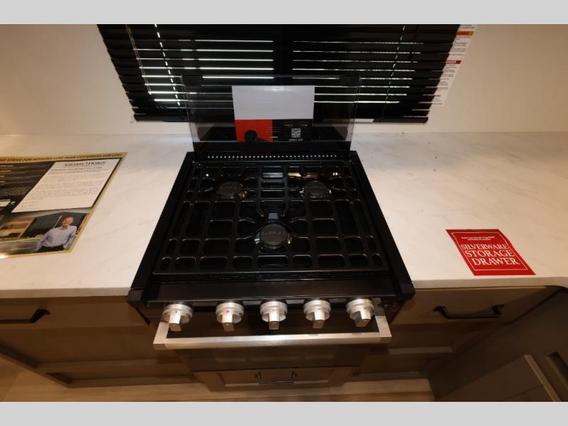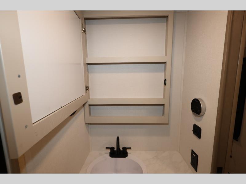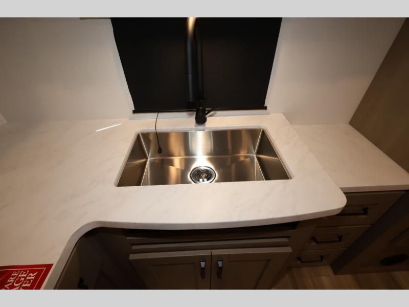You will love this fifth wheel featuring a single slide for added interior living space and all the comforts and conveniences it provides you while you travel. The slide features a 78" theater seat plus there is a breakfast nook for more seating. Both can easily view the entertainment center with 40" TV. A rear kitchen indoors provides everything you need to create meals like home while on the road, and if you want to spend as much time outside as possible, then the outdoor griddle will certainly accommodate you for meals. Up front, a cozy private bedroom with queen bed, wardrobe, and overhead cabinets. Right next door, you will find a large walk-in shower, as well as a toilet, and a vanity with sink and linen cabinet for your towels and toiletries. You will also love the full unobstructed pass-through compartment for all of your gear, plus so much more!