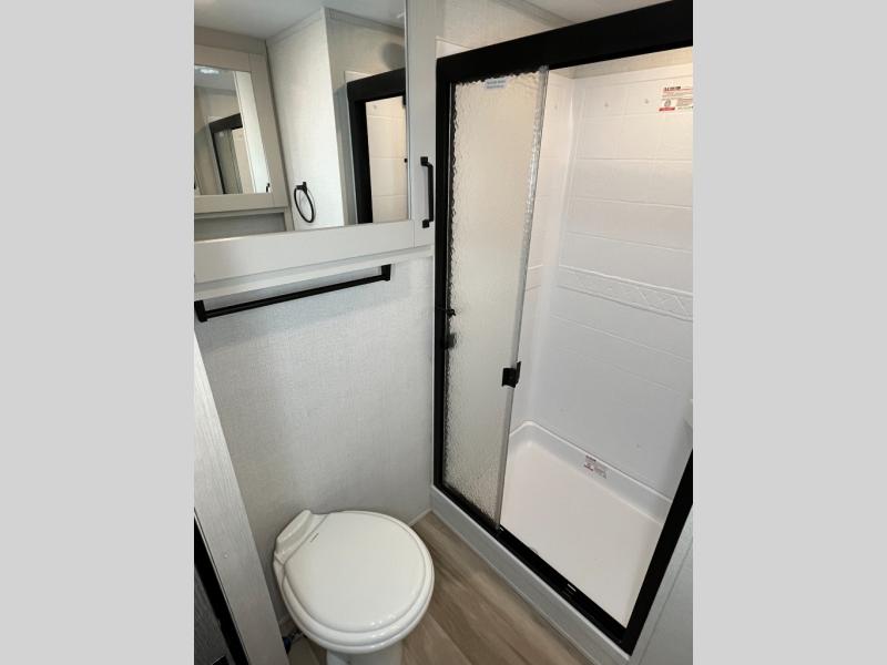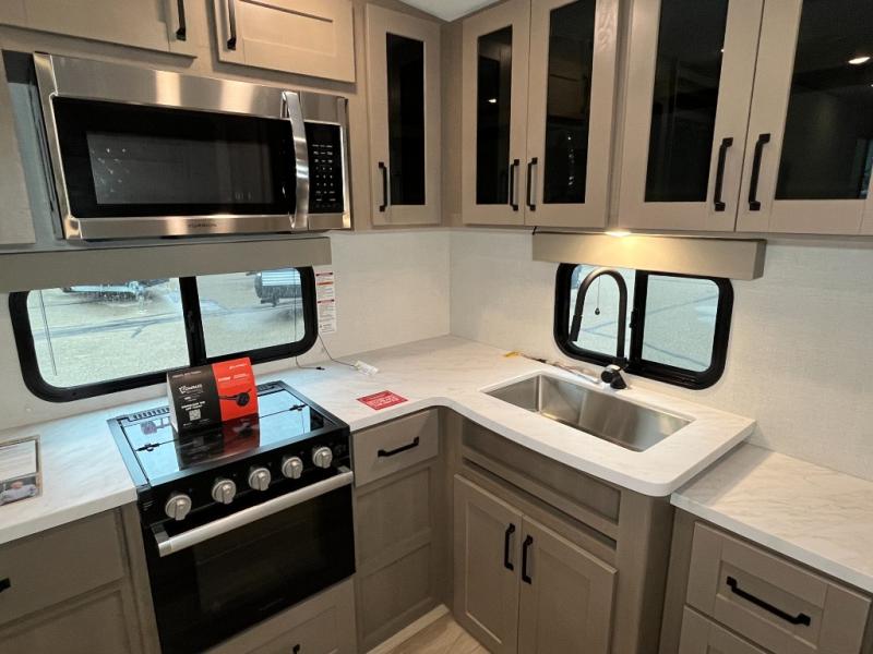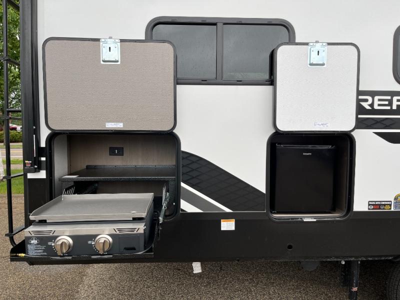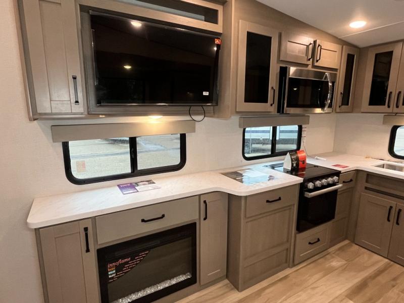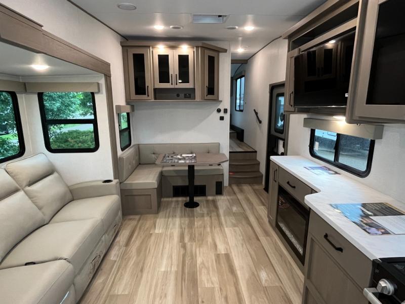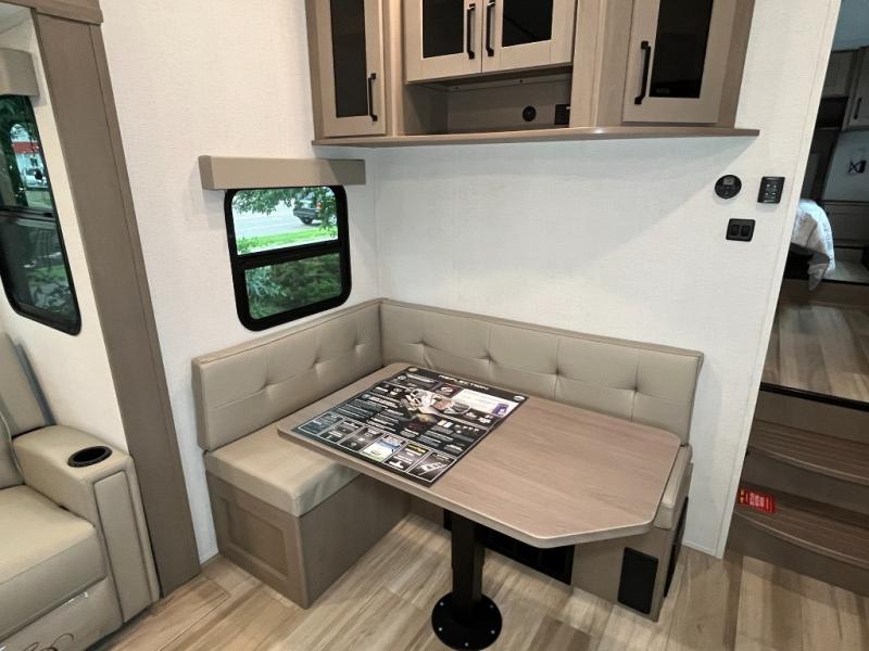 You will love this fifth wheel featuring a single slide for added interior living space and all the comforts and conveniences it provides you while you travel. The slide features a 78" theater seat plus there is a breakfast nook for more seating. Both can easily view the entertainment center with 40" TV. A rear kitchen indoors provides everything you need to create meals like home while on the road, and if you want to spend as much time outside as possible, then the outdoor griddle will certainly accommodate you for meals. Up front, a cozy private bedroom with queen bed, wardrobe, and overhead cabinets. Right next door, you will find a large walk-in shower, as well as a toilet, and a vanity with sink and linen cabinet for your towels and toiletries. You will also love the full unobstructed pass-through compartment for all of your gear, plus so much more!