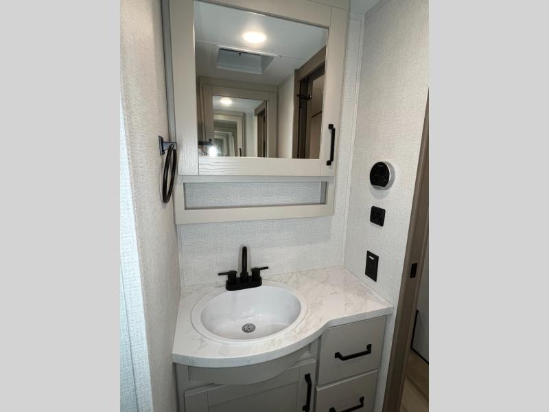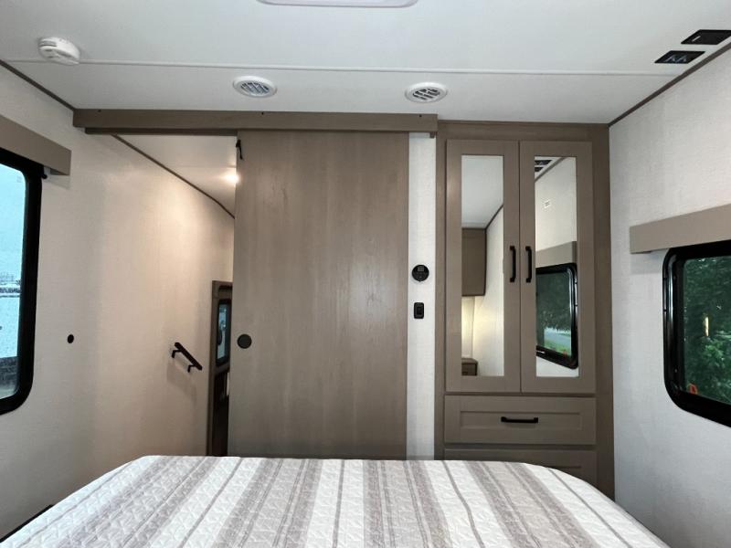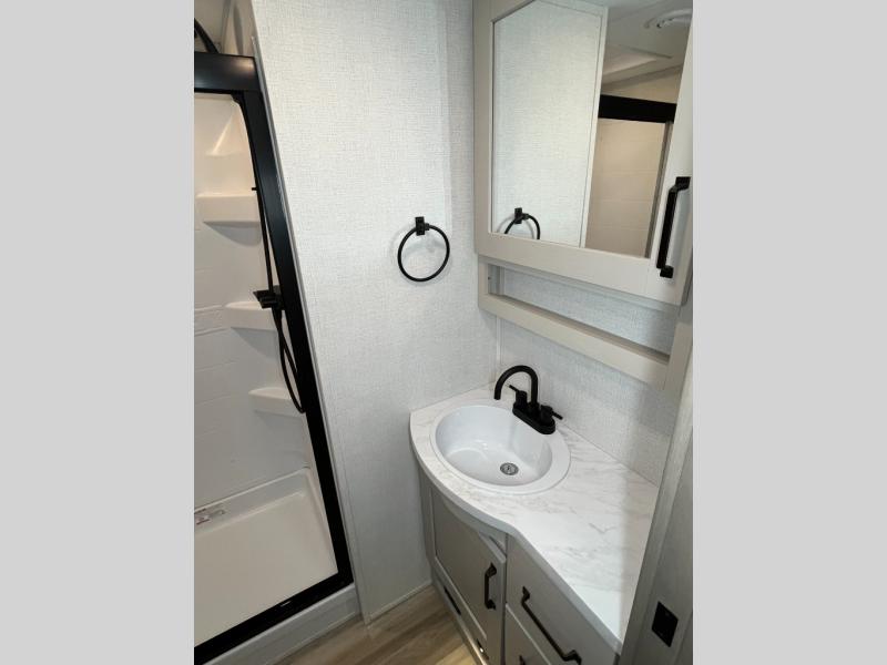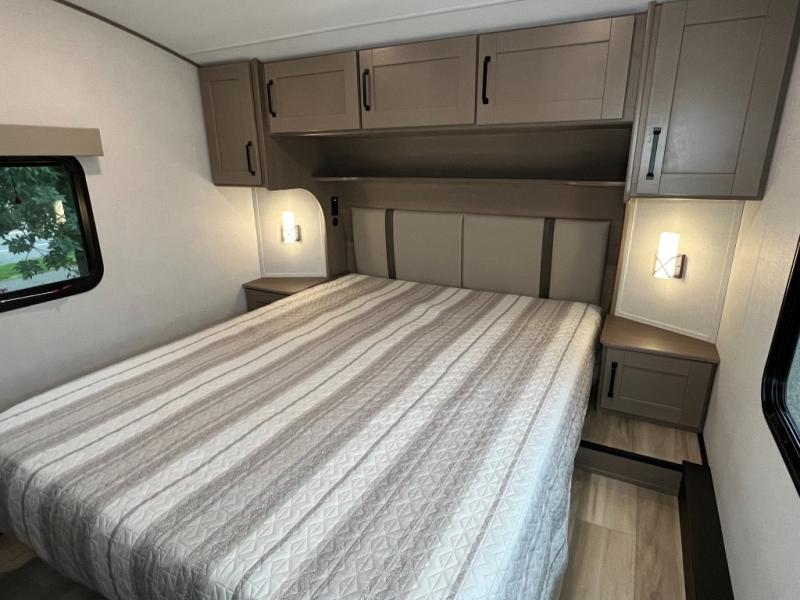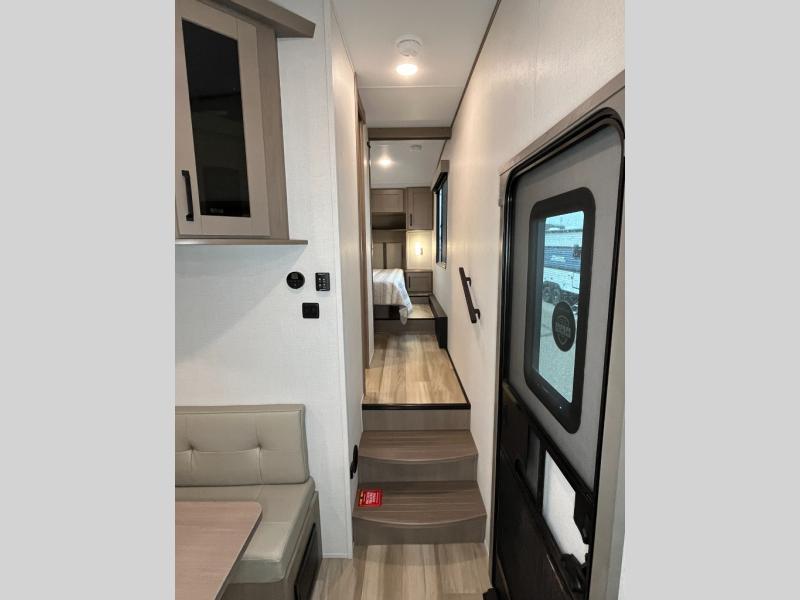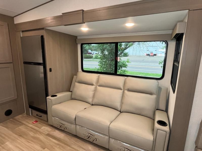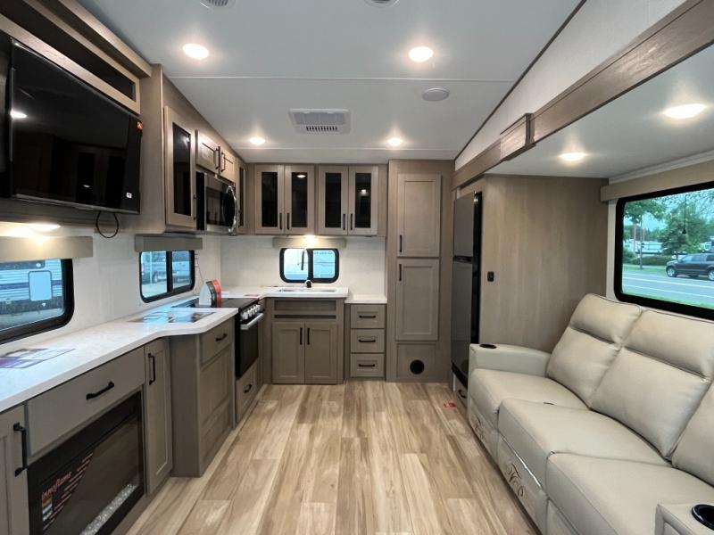 You will love this fifth wheel featuring a single slide for added interior living space and all the comforts and conveniences it provides you while you travel. The slide features a 78" theater seat plus there is a breakfast nook for more seating. Both can easily view the entertainment center with 40" TV. A rear kitchen indoors provides everything you need to create meals like home while on the road, and if you want to spend as much time outside as possible, then the outdoor griddle will certainly accommodate you for meals. Up front, a cozy private bedroom with queen bed, wardrobe, and overhead cabinets. Right next door, you will find a large walk-in shower, as well as a toilet, and a vanity with sink and linen cabinet for your towels and toiletries. You will also love the full unobstructed pass-through compartment for all of your gear, plus so much more!