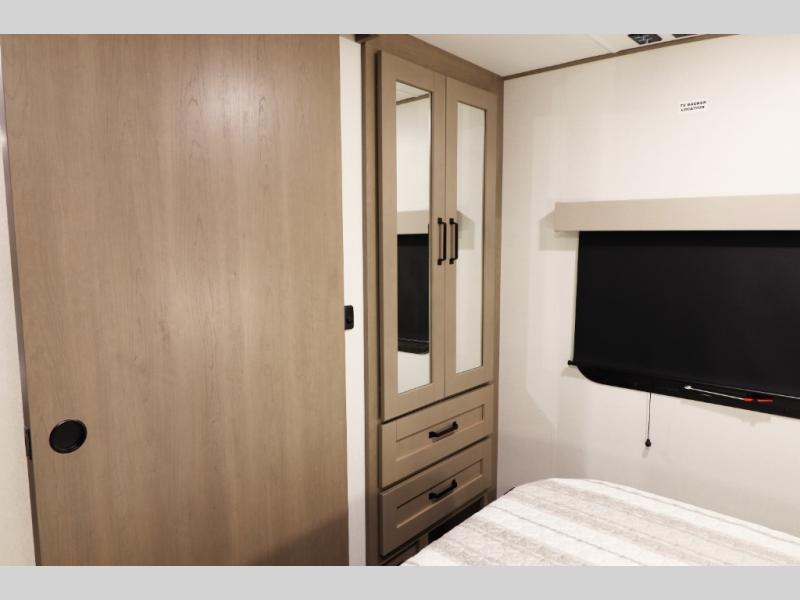 Private Front Bedroom – Queen bed, wardrobe, and overhead cabinets for peaceful nights.