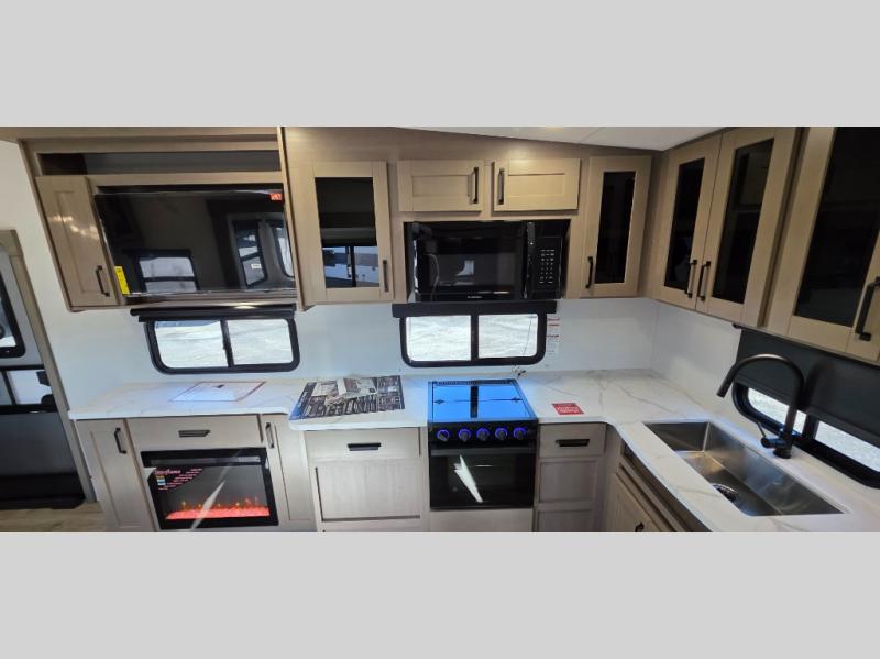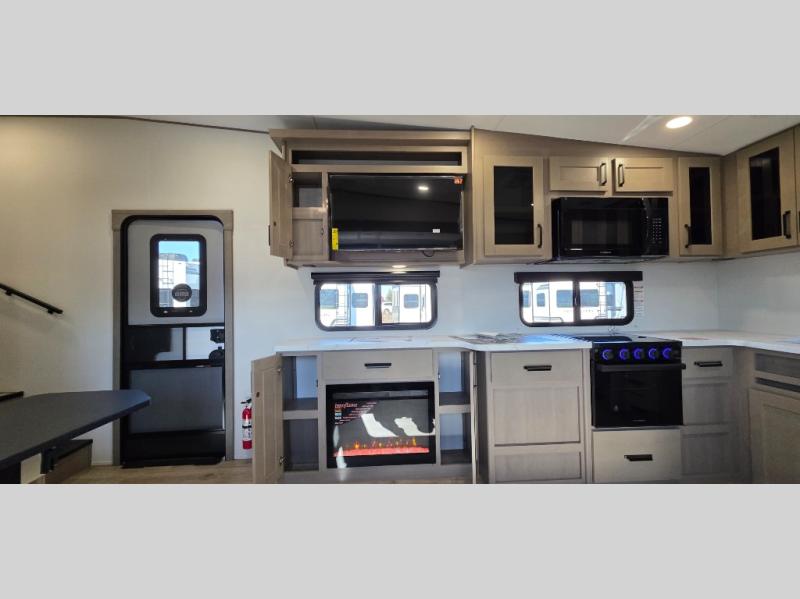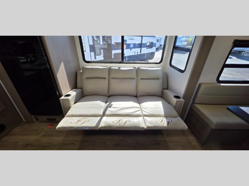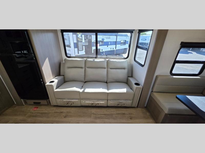 Spacious Living Area: Enjoy a large slide-out with theater seating directly across from the entertainment center and fireplace, creating the ultimate cozy space for relaxing after a day of exploring.