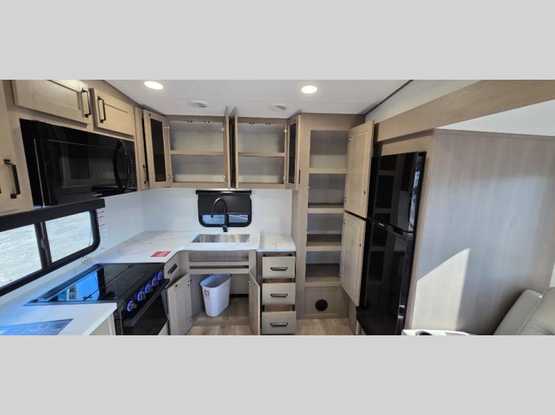 Unique Rear Kitchen Layout: The standout rear kitchen design offers expansive counter space, residential appliances, a deep stainless-steel sink, and a large pantry—perfect for foodies who love to cook on the road.